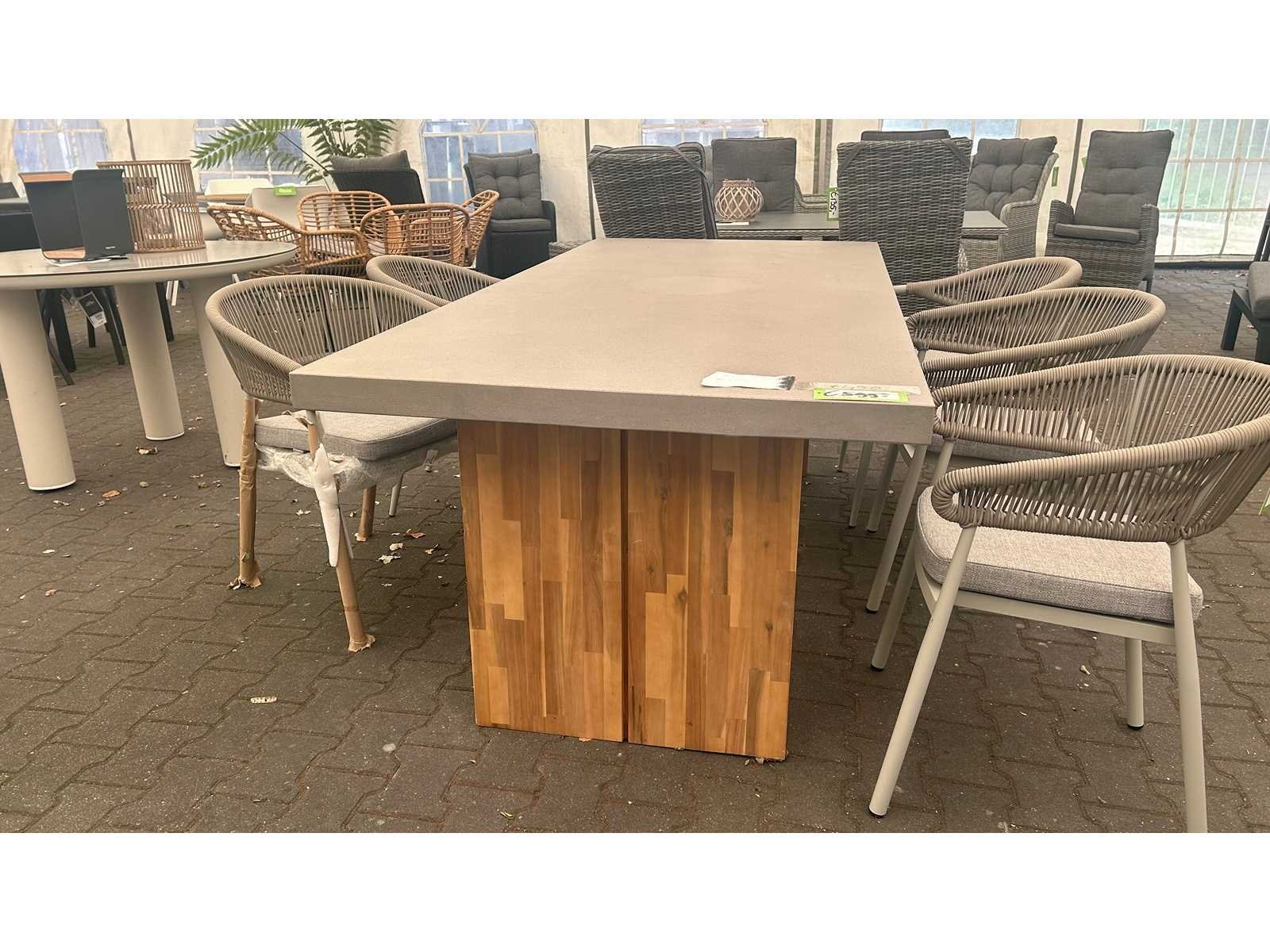 Het blad is gemaakt van polystone, een innovatief en duurzaam materiaal dat niet alleen lichtgewicht is, maar ook uitzonderlijk sterk en weerbestendig. Polystone is eenvoudig schoon te maken, bestand tegen krassen en kleurvast, waardoor het perfect is voor buitengebruik. Let op: Exclusief stoelen. Merk: Rock Model: Sand Acacia Vorm: rechthoek Lengte: 235cm Breedte: 95cm Hoogte: 77cm Materiaal: beton/acacia hout