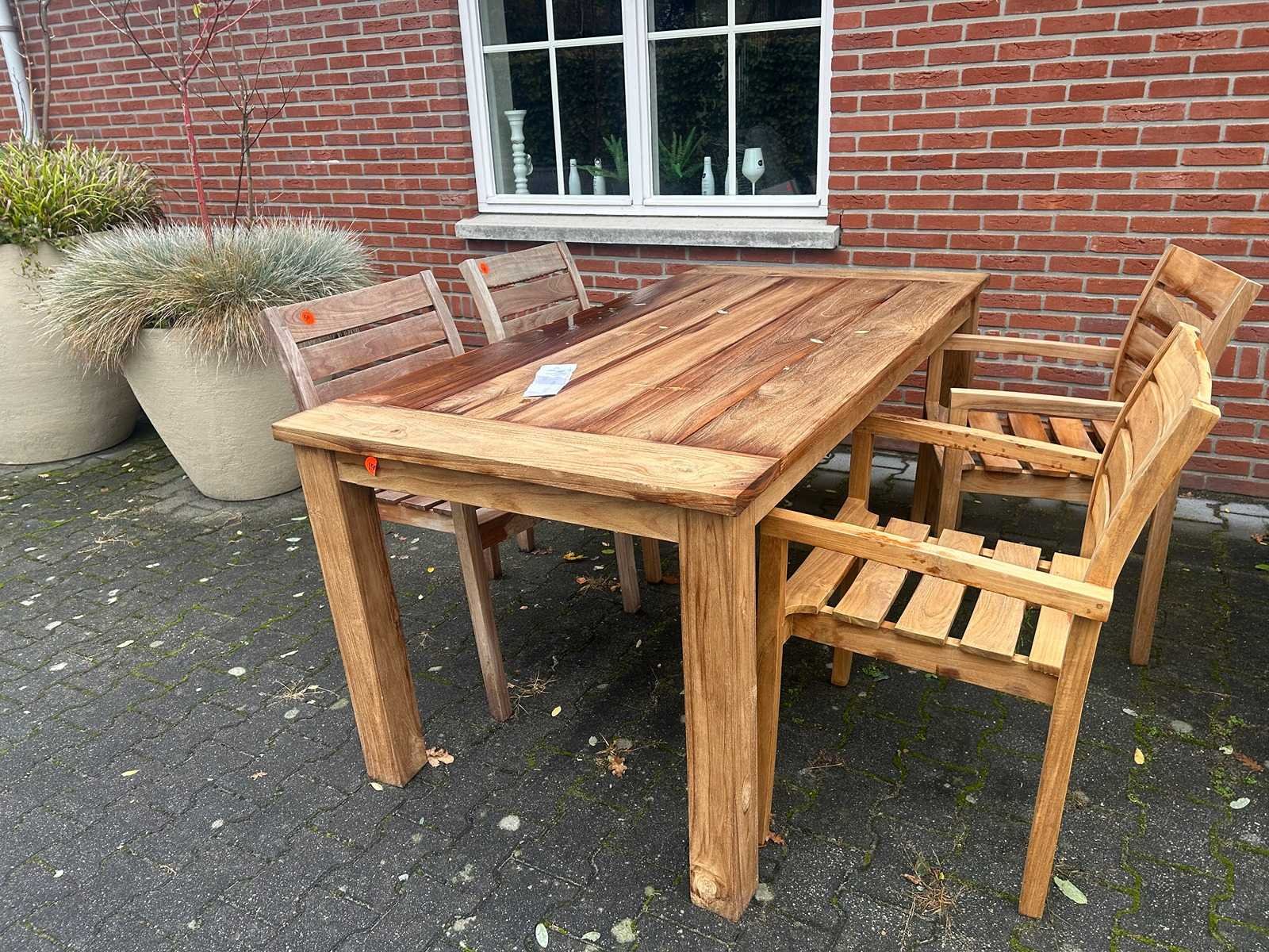 De Ayra teakhouten tuintafel is gemaakt van Ayra old teak, een duurzaam en onbehandeld teakhout uit Indonesië. Met zijn royale afmetingen van 180 x 90 cm biedt deze tafel ruim plaats voor gezellige diners met familie en vrienden. De stevige 8 cm dikke poten, 15 cm brede planken en het 3 cm dikke blad geven de tafel een robuuste uitstraling en zorgen voor een stabiele basis. Met een hoogte van 72 cm van de grond tot de onderkant van het blad biedt de tafel een comfortabele zitpositie, perfect voor lange, ontspannen maaltijden in de buitenlucht. Merk: Teakhout Model: Ayra Stapelbaar: true Vorm: rechthoek Stoelen: 4 Lengte: 180cm Breedte: 90cm Hoogte: 79cm Materiaal: teakhout Diepte: 50 Zithoogte: 46