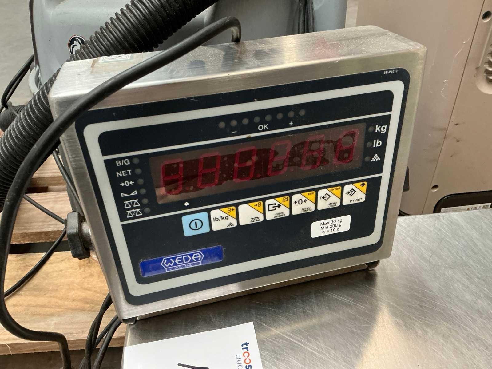 Merk: Avery Berkel Type: VD310 Serienummer: 70801420 Weegbereik max: 30000g Plateau afm. l: 400mm Plateau afm. b: 400mm Aansluiting: 230V Totale afmeting L: 400mm Totale afmeting Breedte: 400mm