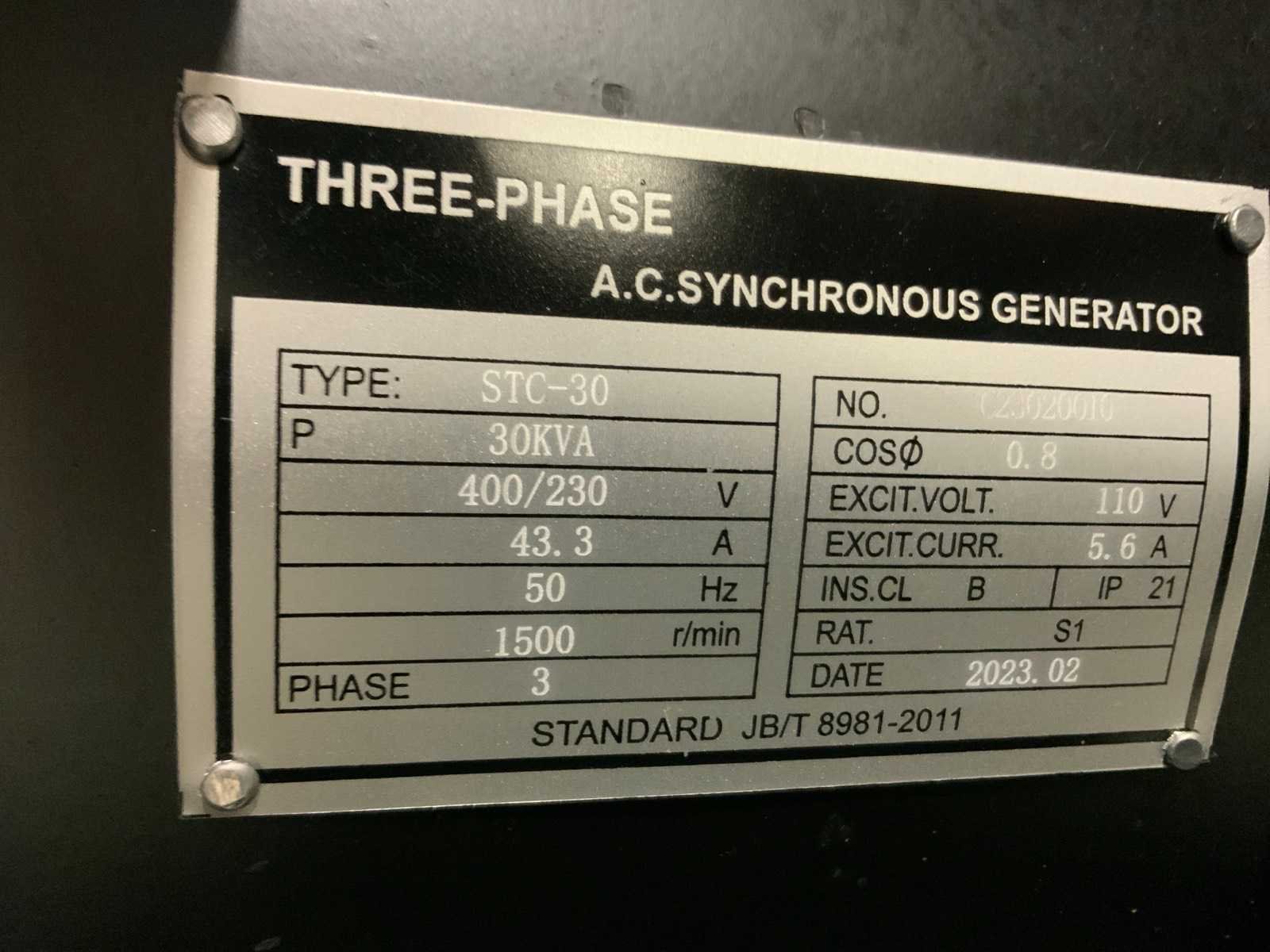230/400v; 3 phase; G1; Alternator STC-30; RPM 1500; Powerfactor 0.8; 50Hz; 8273 Merk: Kawakenki Type: KK30-III-SSS Bouwjaar: 2023 Capaciteit.: 30kVA Aansluiting: 400V Motorcapaciteit: 24kW Generator type: KD4100D Generator capaciteit: 44A Afgelezen urenstand: 0 Machinegewicht: 670kg Totale afmeting L: 1900mm Totale afmeting Breedte: 750mm Totale afmeting Hoogte: 1100mm