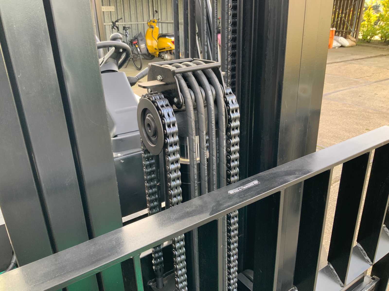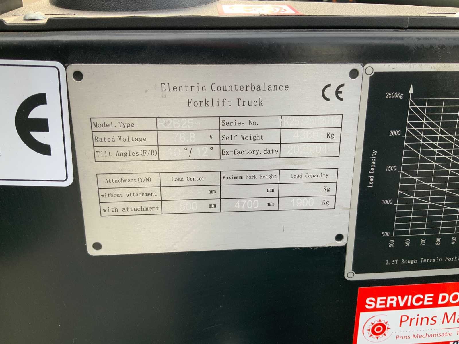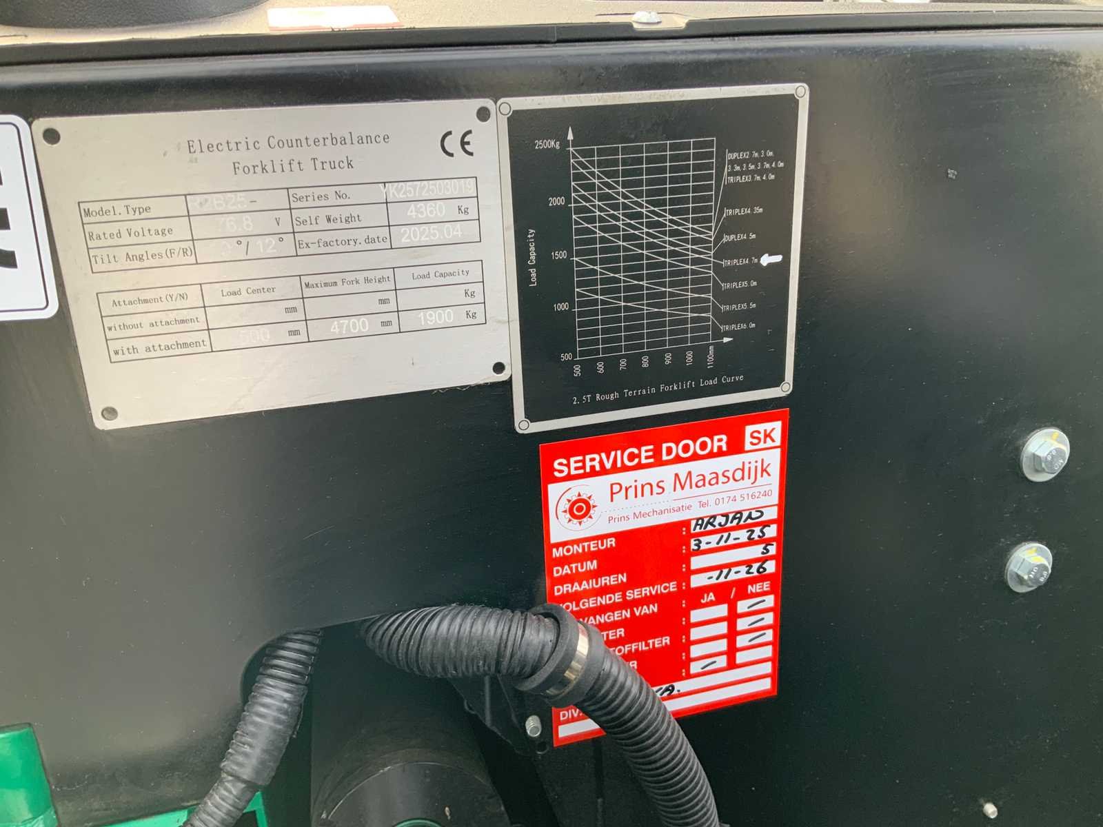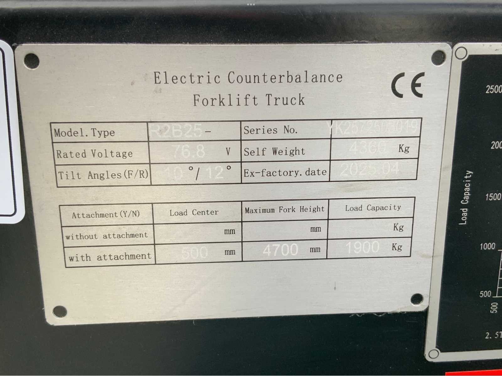 Deze truck is nieuw en ongebruikt en voorzien van een lithium Ion batterij en deze batterij kunt u op elk moment/tussentijds laden zonder nadelige gevolgen. Met CE conformiteit documenten voor het aanvragen van een kentekenregistratie bij de autoriteiten van uw land, met led rijverlichting voor en achter, Bluespot en zwaailamp. Onderhoudsarme Lithium Ion batterij 80V/350AH. Merk: Manforce Type: R2B25-LI Bouwjaar: 2025 Serienummer: YK2572503019 Brandstof: Elektrisch Mast: Triple Soort band: Luchtbanden Aantal wielen: 4 Afgelezen urenstand: 13 Ruw terrein: true Accu lader: true Free-lift: true Side-shift: true Hydraulisch verstelbare lepels: true Triple mast: true Eigen gewicht: 4360kg Hefvermogen: 2500kg Lepellengte: 1230mm Max. hefhoogte: 4700mm Luchtbanden: true Minimale doorrijhoogte: 2120mm Totale afmeting L: 4100mm Totale afmeting Breedte: 1450mm Totale afmeting Hoogte: 2120mm