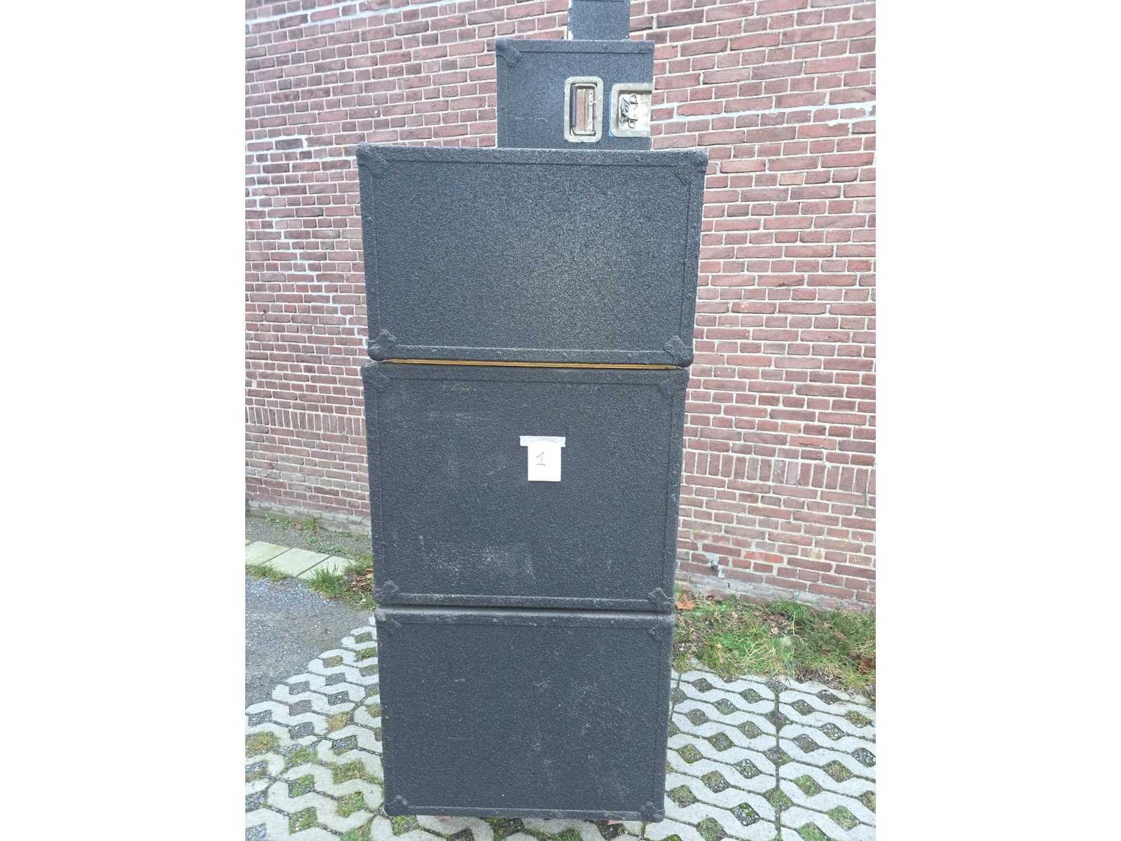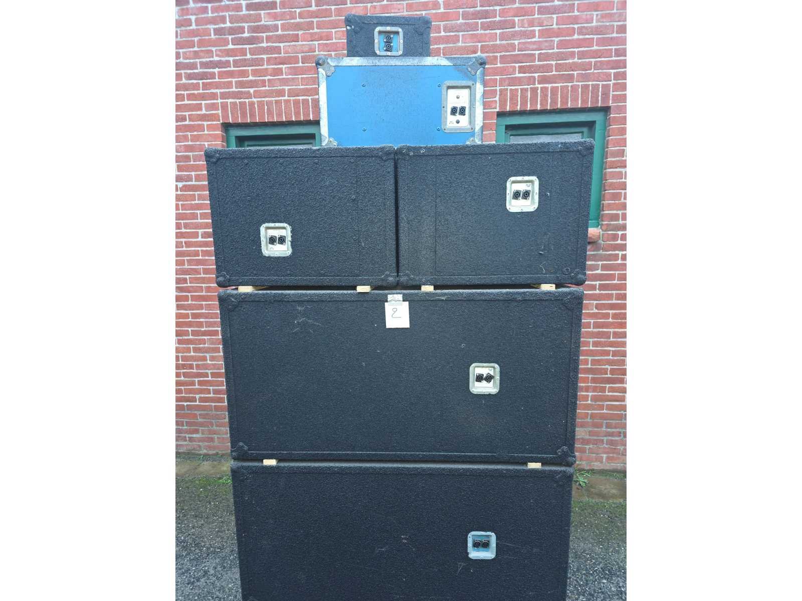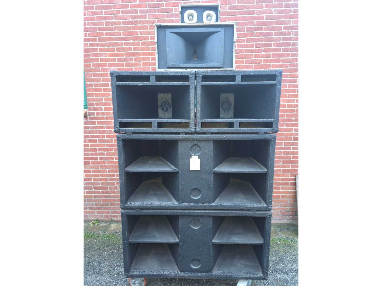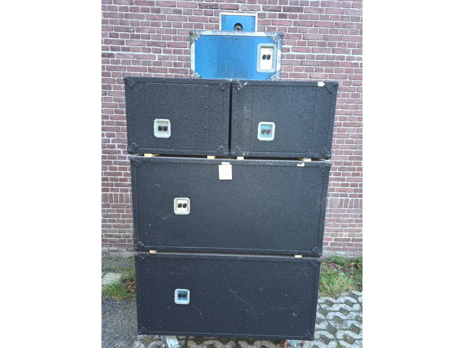 Volledige sound system; volledig gereviseerd speelt zeer zuiver; nummer 1 tot en met 5; Stage Accompany complete 4-weg PA set – 8 subs, 8 mids, 4 tops, 4 fills + 2 racks versterkers; klassiek Nederlands topmerk in professionele audio. Dit is een compleet 4-weg PA systeem, perfect voor clubs, festivals, soundsystems of verzamelaars; 8x SA subkasten (laag); 8x SA middenkasten (mid); 4x SA topkasten (high); 4x kleine boksen/frontfills; 2x amp racks met elk 3 eindversterkers (SA 500A, 900B, 900C etc. → totaal 6 versterkers); Inclusief flightcases & bekabeling; nummer 7, DAP AUDIO 4X 350W gecontroleerd en functioneerd met 4X statief voor de boksen; nummer 8, zware degelijke boksen met 2X statief; nummer 9, verschillend audio en licht materiaal. Draaitafels, lasers, moving heads, versterkers, een BEHRINGER DDX3216 en 4 dozen vol met kabels voor audio en licht apparatuur; nummer 10, set aluminium truss staanders/towers (zie foto); Geschikt voor lichtbrug, DJ setup, podium, evenementen, beurs of decorbouw; Materiaal: aluminium; Kleur: zilver; Aantal: 6 stuks met montage onderdelen; Staat: Goed werkend, netjes onderhouden. Drivers, hoorns en versterkers functioneren naar behoren; kijkdag op afspraak; afhalen op afspraak;
