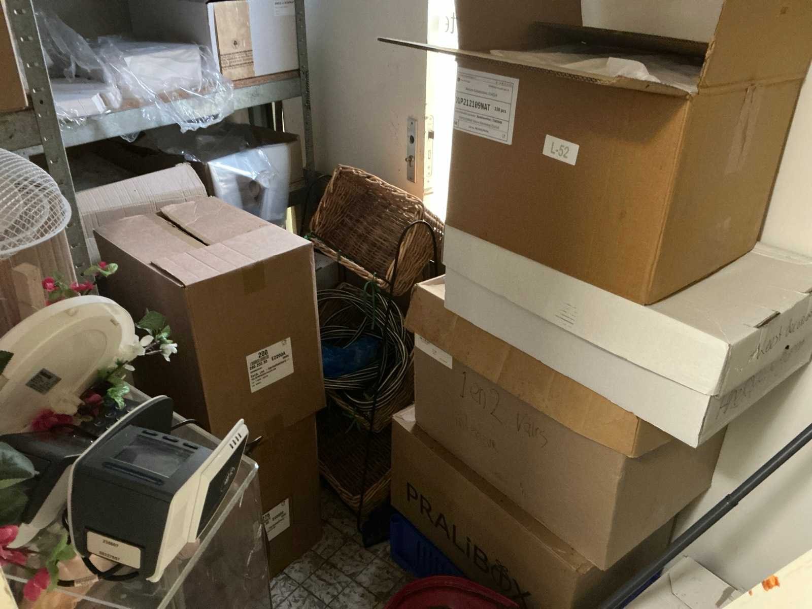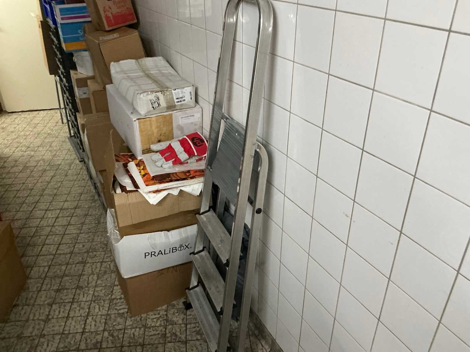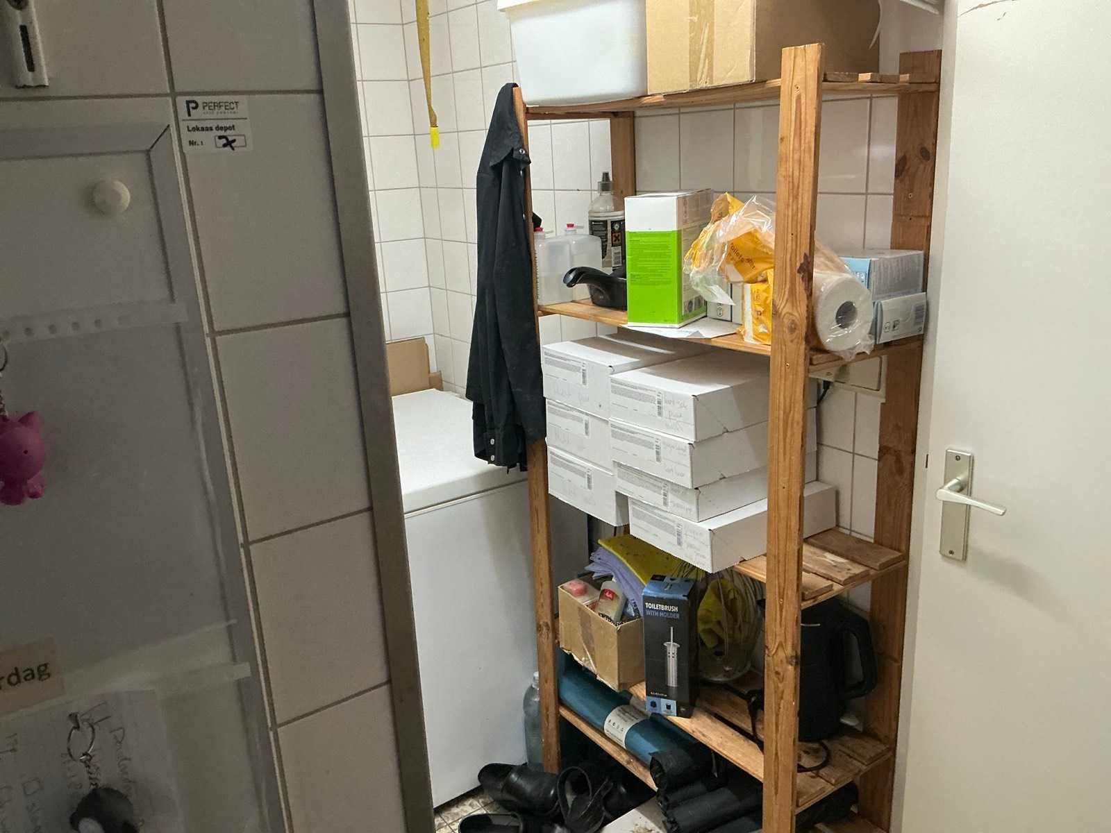 Inhoud magazijn van 3 ruimtes, 2 printers, verpakkingsmateriaal, 5 stellingkasten, vriezer, rvs werktafel, deze ruimtes dienen leeg opgeleverd te worden.