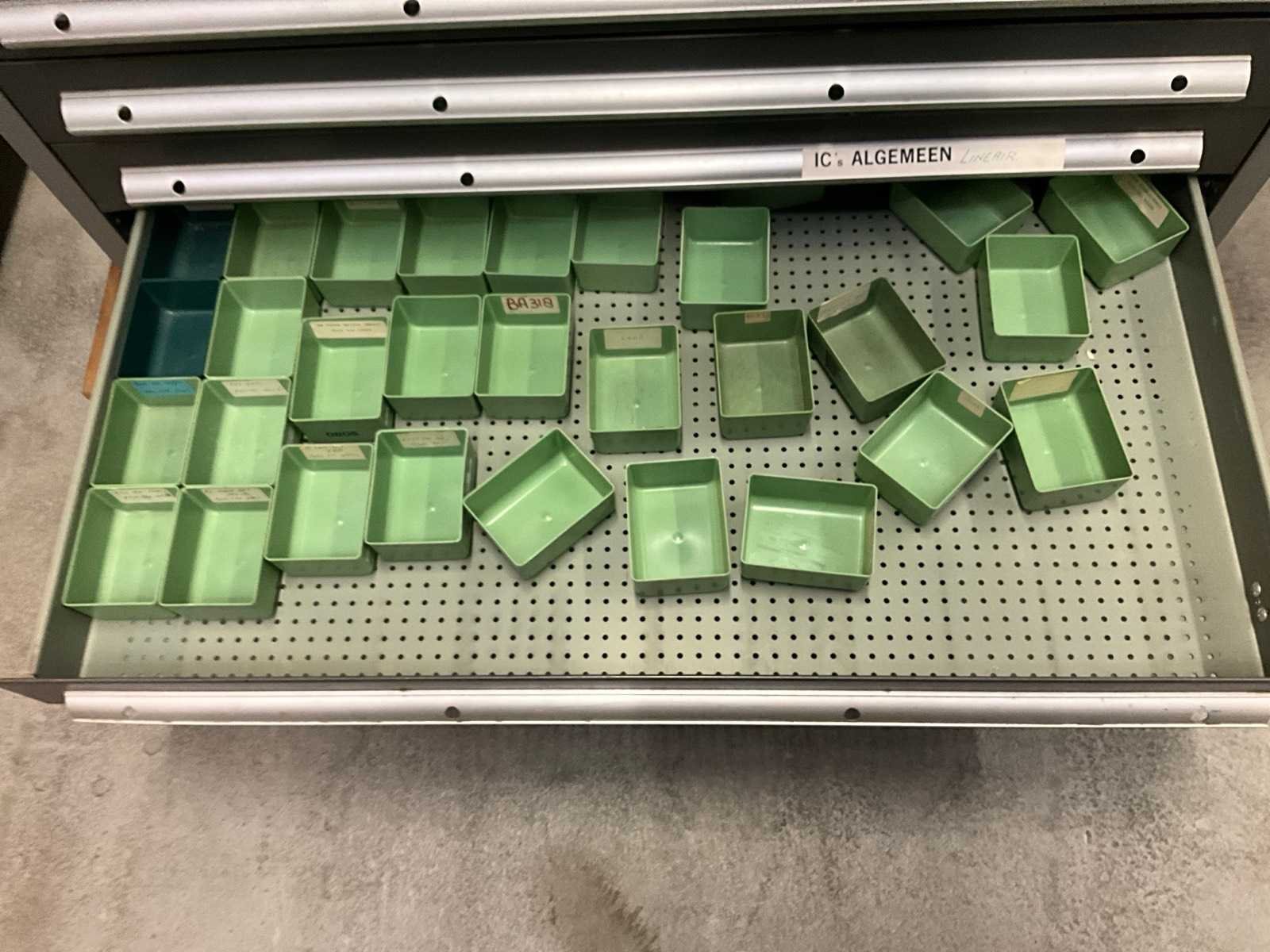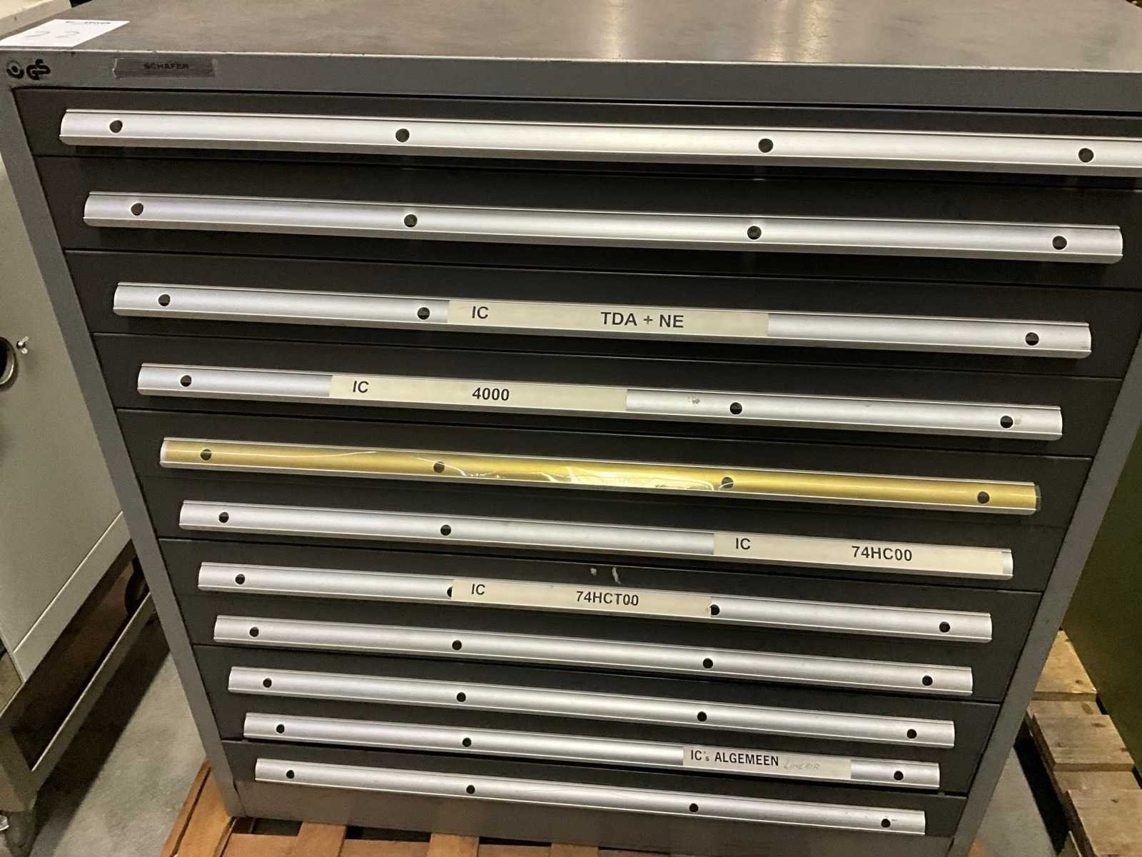 11 lades, organisatie bakken in lades, zonder pallet en palletranden Merk: Schafer Type: WSK Lengte: 66cm Breedte: 106cm Hoogte: 109cm Diepte: 57cm