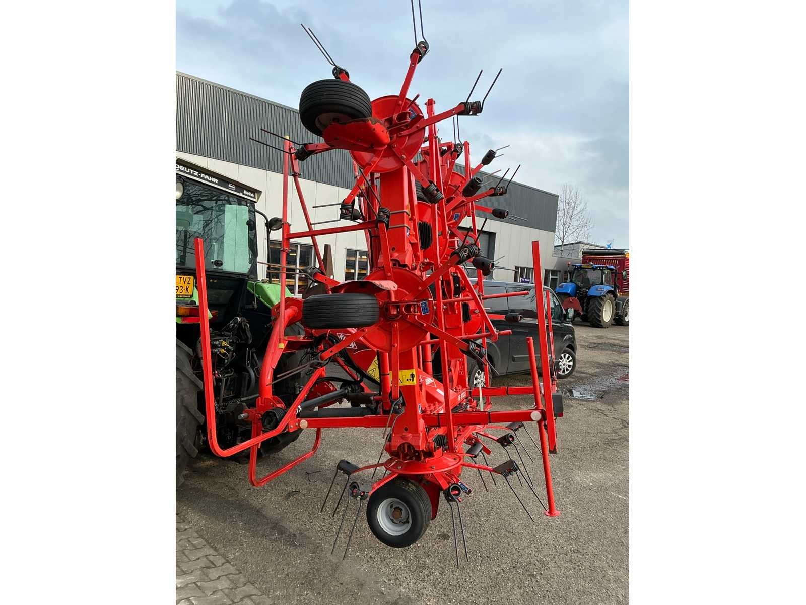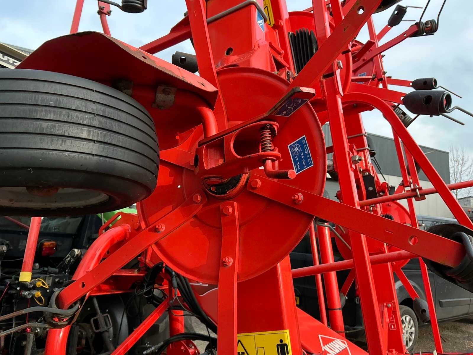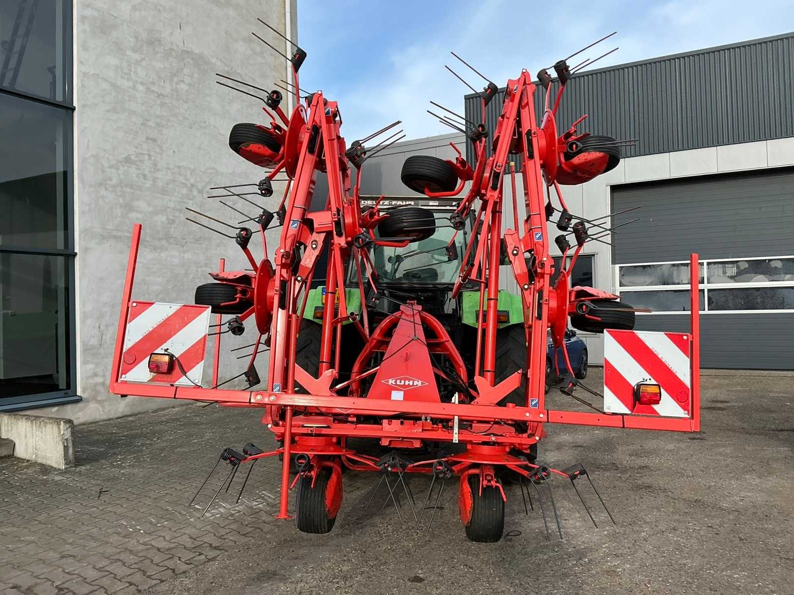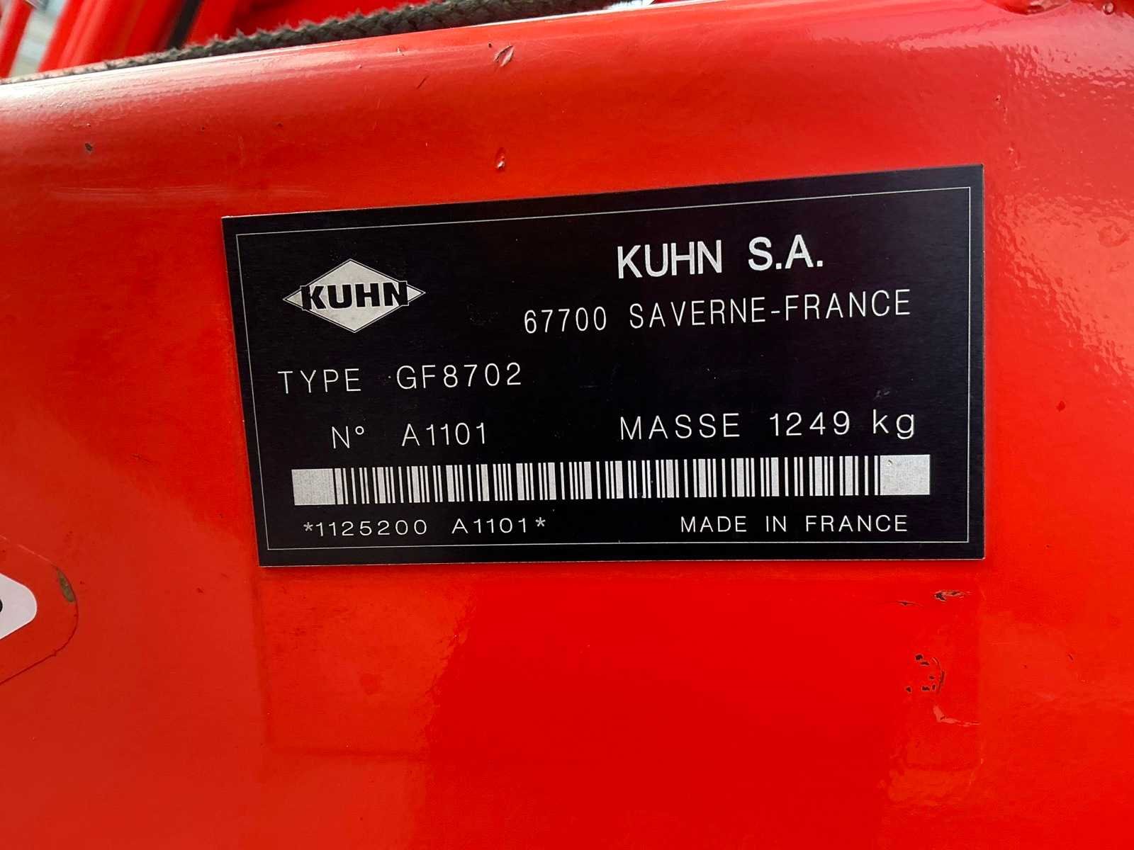 Aftak-as aangedreven, hydraulische bediening voor kantschudden, zware stabilisatie, CAT II aanbouw, verkichting, transportmaat 3000x2400x3000mm. Merk: Kuhn Type: GF8702 Serienummer: A1101 Bouwjaar: 2012 Eigen gewicht: 1300kg Werkbreedte: 8700mm