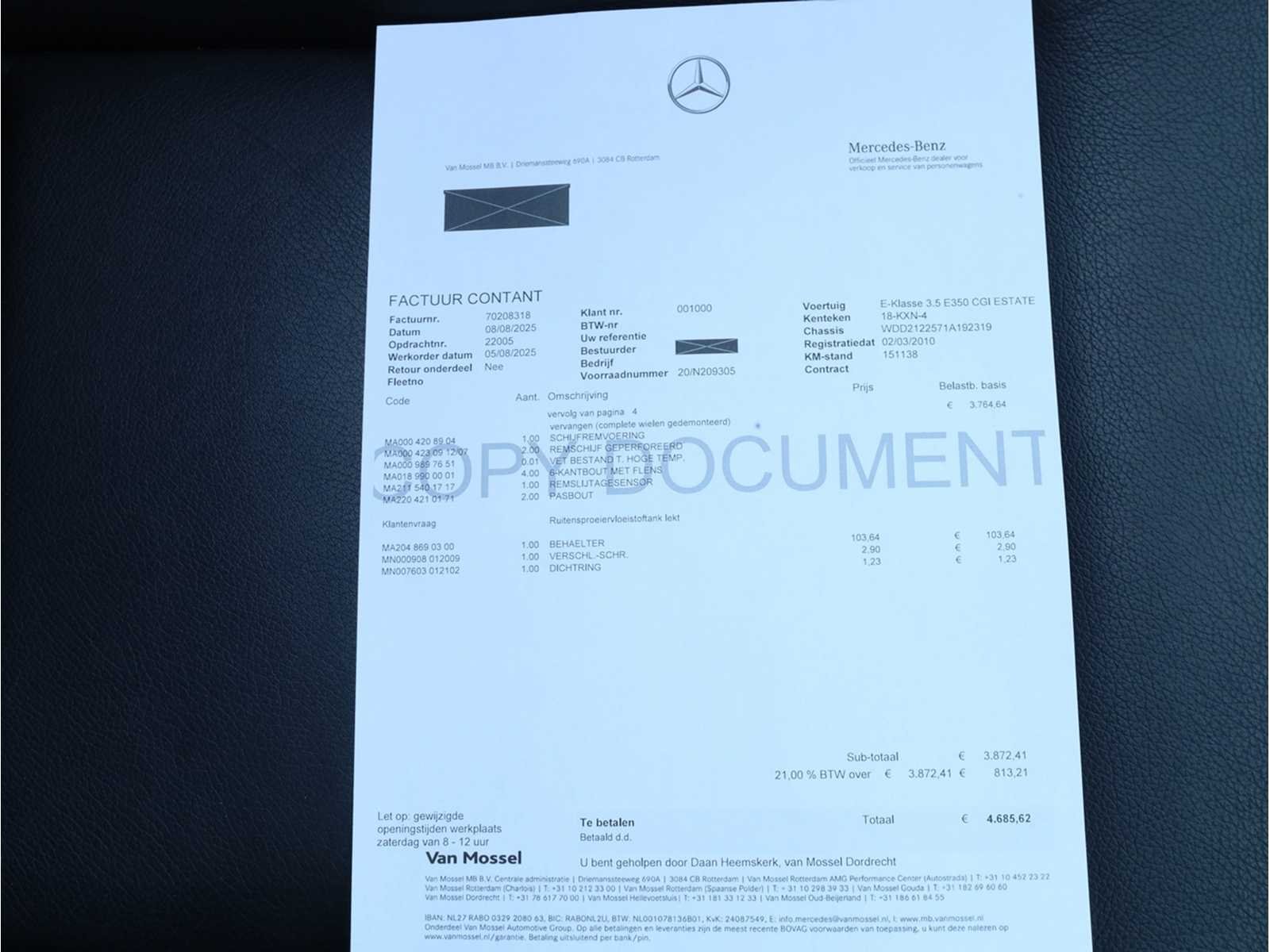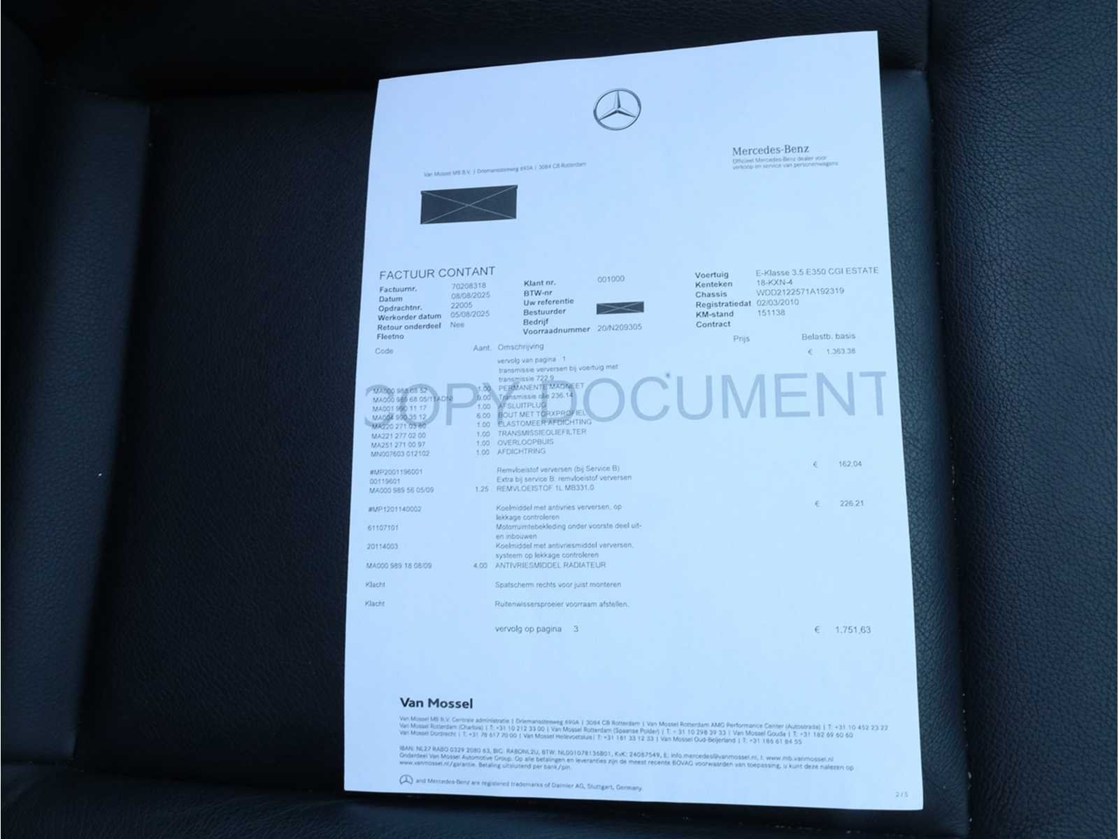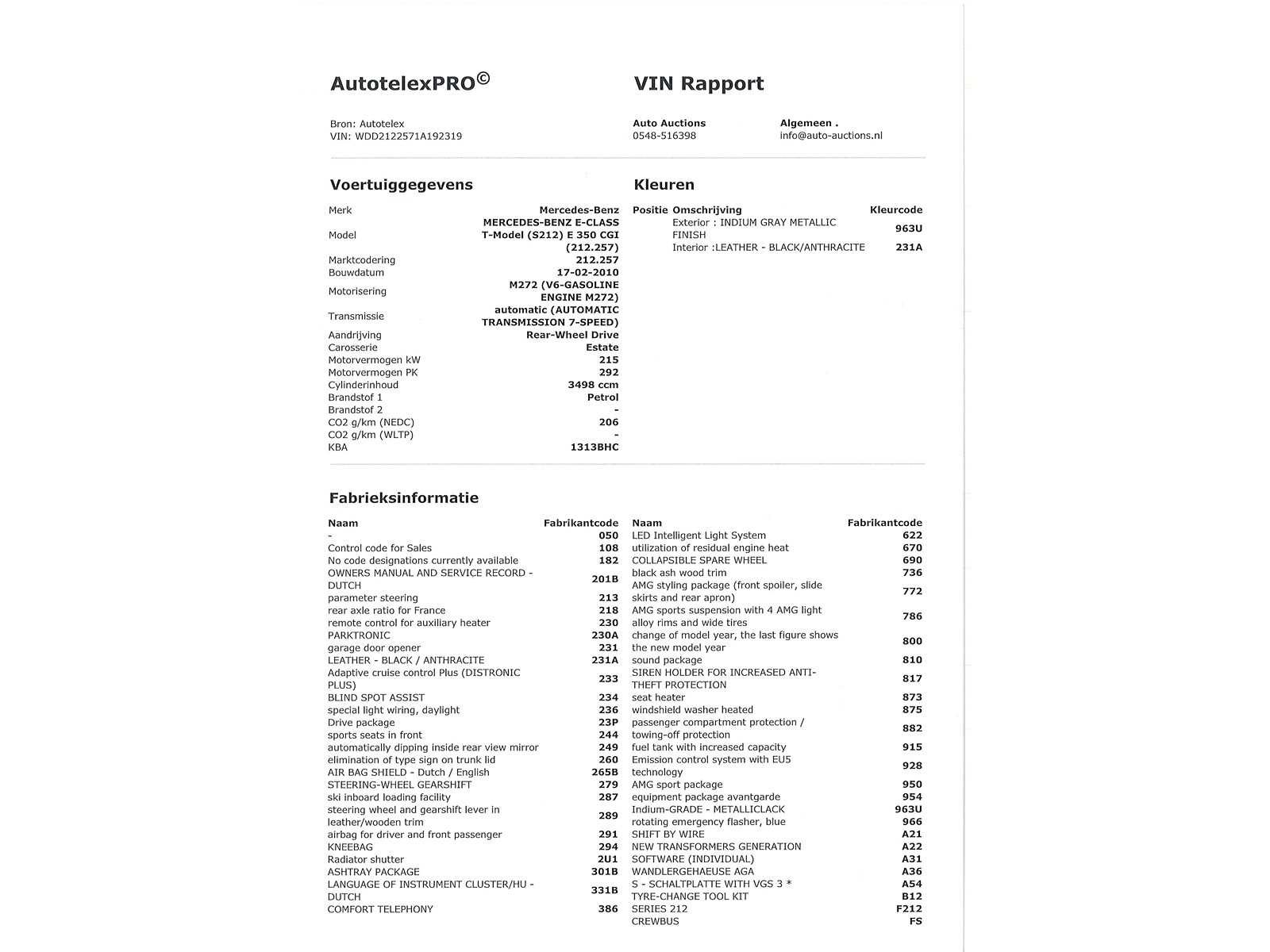 Voor vragen kunt u mailen naar info@auto-auctions.nl Kenteken: 18-KXN-4 Merk: Mercedes-Benz Model: E-klasse Estate Type: 350 CGI Avantgarde Afgelezen kilometerstand: 161477km Cilinderinhoud: 3498cc Vermogen (kW): 215kW Brandstof: Benzine Chassisnummer: WDD2122571A192319 NAP status: Logisch Datum eerste toelating: 2010-03-02 Datum eerste toelating (NL): 2010-03-02 APK vervaldatum: 2026-08-08 Vermogen (pk): 288hp Aantal zitplaatsen: 5 Maximaal trekgewicht ongeremd: 2100kg Maximaal trekgewicht geremd: 750kg Kleur: grijs Transmissie: Automaat Emissieklasse: 5 Aantal deuren: 4 Aantal sleutels: 2 Ledig gewicht: 1745kg Bruto BPM (NL): 22899€ Aantal cilinders: 6 Carrosserie: Stationwagen Onderhoudshistorie: Gedeeltelijk Aanwezig Carfax Link: https://was.carfax.eu/v0/api/ccdid/5100016408/svc/201/vinreg/18KXN4/checksum/eyJhbGciOiJIUzI1NiIsInR5cCI6IkpXVCJ9.eyJleHAiOjE3NzQyNTMzODd9.YTsCLb_Hv43e-zRJAa1hmwWw20HKmn5sO9SK8Io7Uik Start en rijdt: Ja