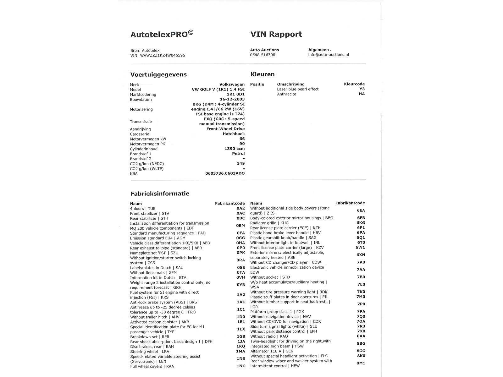 Voor vragen kunt u mailen naar info@auto-auctions.nl De Accu van de auto is leeg. Chassisnummer/Vin: WVWZZZ1KZ4W046596 Kenteken: 42-NZ-LK Merk: Volkswagen Model: Golf Type: 1.4 FSI Trendline Afgelezen kilometerstand: 233831km Cilinderinhoud: 1390cc Vermogen (kW): 66kW Brandstof: Benzine Chassisnummer: WVWZZZ1KZ4W046596 NAP status: Logisch Datum eerste toelating: 2004-04-13 Datum eerste toelating (NL): 2004-04-13 APK vervaldatum: 2026-11-24 Vermogen (pk): 89hp Aantal zitplaatsen: 5 Maximaal trekgewicht ongeremd: 1000kg Maximaal trekgewicht geremd: 620kg Kleur: blauw Transmissie: Handgeschakeld Emissieklasse: 4 Aantal deuren: 4 Aantal sleutels: 1 Ledig gewicht: 1176kg Bruto BPM (NL): 4591€ Aantal cilinders: 4 Carrosserie: Hatchback Onderhoudshistorie: Niet Aanwezig Carfax Link: https://was.carfax.eu/v0/api/ccdid/5100016408/svc/201/vinreg/42NZLK/checksum/eyJhbGciOiJIUzI1NiIsInR5cCI6IkpXVCJ9.eyJleHAiOjE3NzQ3MTIxMTl9.LSE3rg-8rt_RtqV0ing6jAZdM1CaGaDghdfIy1jpZ7M