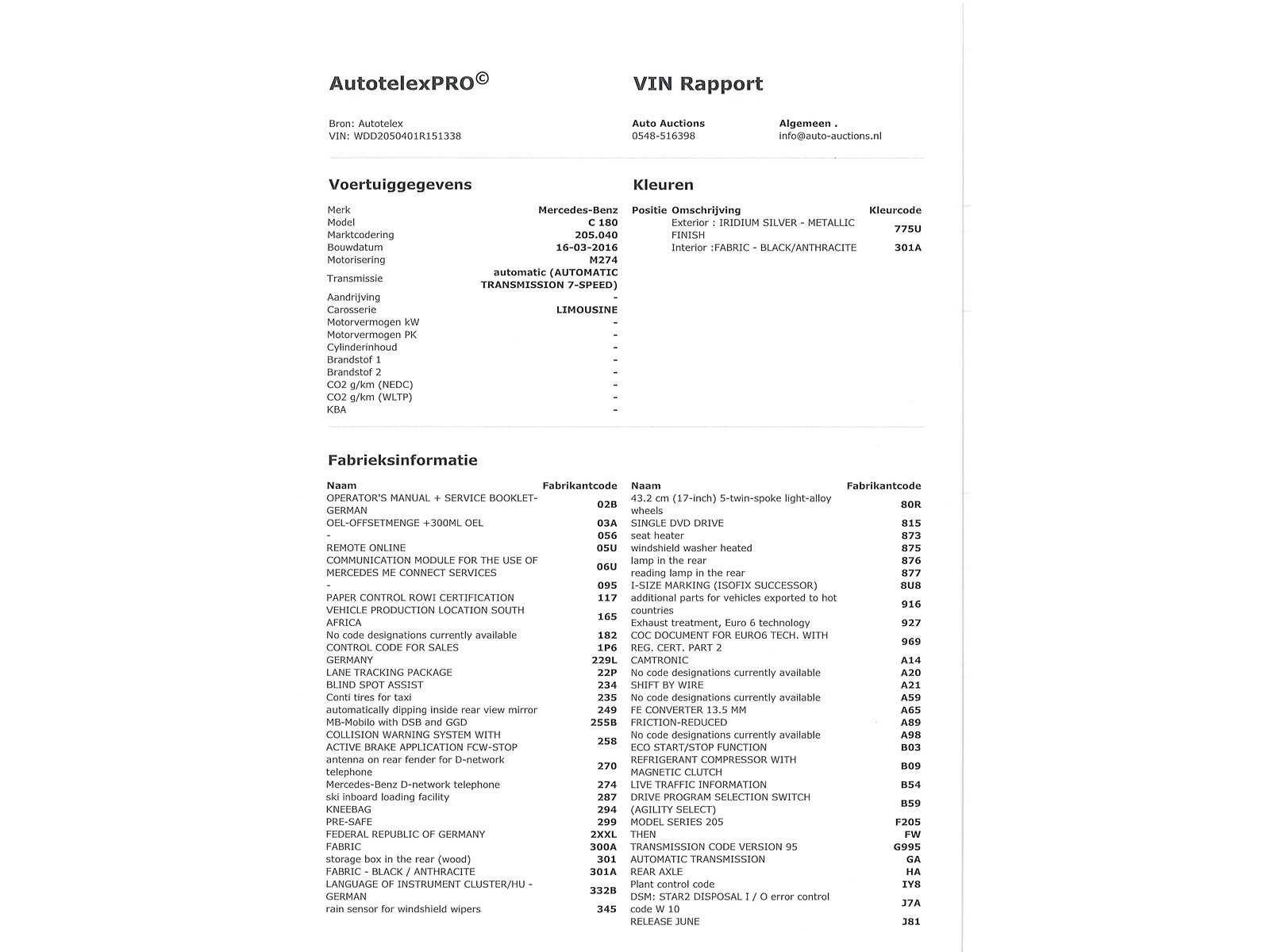 Voor vragen kunt u mailen naar info@auto-auctions.nl Chassisnummer/Vin: WDD2050401R151338 Kenteken: H-103-GR Merk: Mercedes-Benz Model: C-klasse Type: 180 Prestige Afgelezen kilometerstand: 188851km Cilinderinhoud: 1595cc Vermogen (kW): 115kW Brandstof: Benzine Chassisnummer: WDD2050401R151338 NAP status: Geen oordeel Datum eerste toelating: 2016-04-11 Datum eerste toelating (NL): 2020-01-23 APK vervaldatum: 2027-01-15 Vermogen (pk): 154hp Aantal zitplaatsen: 5 Maximaal trekgewicht ongeremd: 1800kg Maximaal trekgewicht geremd: 710kg Kleur: grijs Transmissie: Automaat Emissieklasse: 6 Aantal deuren: 4 Aantal sleutels: 2 Ledig gewicht: 1325kg Bruto BPM (NL): 1606€ Aantal cilinders: 4 Carrosserie: Sedan Onderhoudshistorie: Niet Aanwezig Carfax Link: https://was.carfax.eu/v0/api/ccdid/5100016408/svc/201/vinreg/H103GR/checksum/eyJhbGciOiJIUzI1NiIsInR5cCI6IkpXVCJ9.eyJleHAiOjE3NzM2NDk1MDh9.12k_gDGYlOaUPLxLBUOuHygOX5H73QTzVL25Oh7zTOw Start en rijdt: Ja