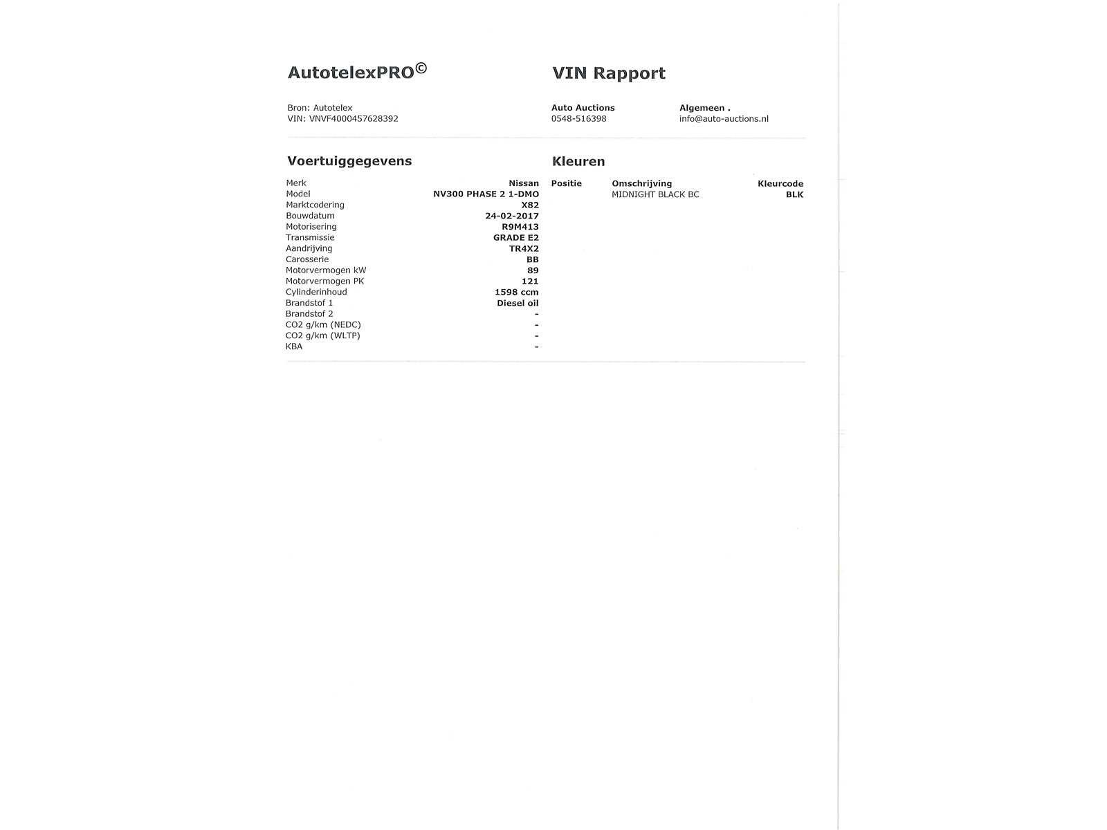 Voor vragen kunt u mailen naar info@auto-auctions.nl Chassisnummer/Vin: VNVF4000457628392 Kenteken: V-386-FL Merk: Nissan Model: NV300 Type: 1.6 dCi 120 L2H1 Optima DC Comfort Afgelezen kilometerstand: 237940km Cilinderinhoud: 1598cc Vermogen (kW): 89kW Brandstof: Diesel Chassisnummer: VNVF4000457628392 Laadvermogen: 1065kg NAP status: Logisch Datum eerste toelating: 2017-03-22 Datum eerste toelating (NL): 2017-03-22 APK vervaldatum: 2025-04-02 Vermogen (pk): 119hp Aantal zitplaatsen: 5 Maximaal trekgewicht geremd: 750kg Kleur: niet van toepassing Transmissie: Handgeschakeld Emissieklasse: 6 Aantal deuren: 3 Aantal sleutels: 2 Ledig gewicht: 1875kg Bruto BPM (NL): 11572€ Aantal cilinders: 4 Carrosserie: Bestelwagen Onderhoudshistorie: Gedeeltelijk Aanwezig Carfax Link: https://was.carfax.eu/v0/api/ccdid/5100016408/svc/201/vinreg/V386FL/checksum/eyJhbGciOiJIUzI1NiIsInR5cCI6IkpXVCJ9.eyJleHAiOjE3NzM2NTU0MDh9.otKz5hoyGuIdIUTpnqPSctmX-Mtrc8OlAh0-LWX5RWI Start en rijdt: Ja