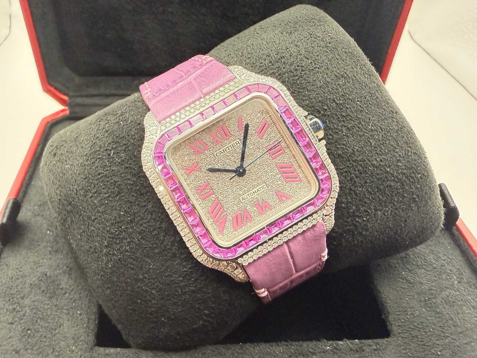 Key Features: Model: Cartier Santos Medium Condition: Unworn Diamonds: Natural Case & dial: Fully iced out Strap: Pink Set: Comes with Cartier box Please note: this is a customised watch, meaning it may include components that differ from the original factory specifications. Customisation can vary widely, so we highlight the following possibilities for full transparency: Aftermarket parts The watch may include third-party components (such as bezels, dials, hands, crystals or gem settings) that are not produced by the brand owner. These parts are often added for aesthetic reasons, but are not considered original by the manufacturer. Original parts from other models Some components (e.g. dials or bracelets) may have been sourced from other genuine watches by the same brand. While these parts are authentic, they were not originally fitted to this particular model or reference, which may affect collectability or eligibility for manufacturer service. Non-original parts In some cases, customised watches may include parts that are neither original nor manufactured by the brand. These components can affect the watch’s value. We encourage all bidders to carefully review the photos and description before placing a bid. Keep in mind: customised watches may not be eligible for official service or warranty from the brand. All bids should be placed with full awareness of the customisation status described above. Merk: Cartier Model: Santos Medium Bouwjaar: 2024 Referentienummer: WSSA0063 Materiaal kast: Steel / Diamonds Materiaal horlogeband: Leather Materiaal sluiting: Steel / Diamonds Wijzerplaat: Diamonds Kastmaat: 33 mm