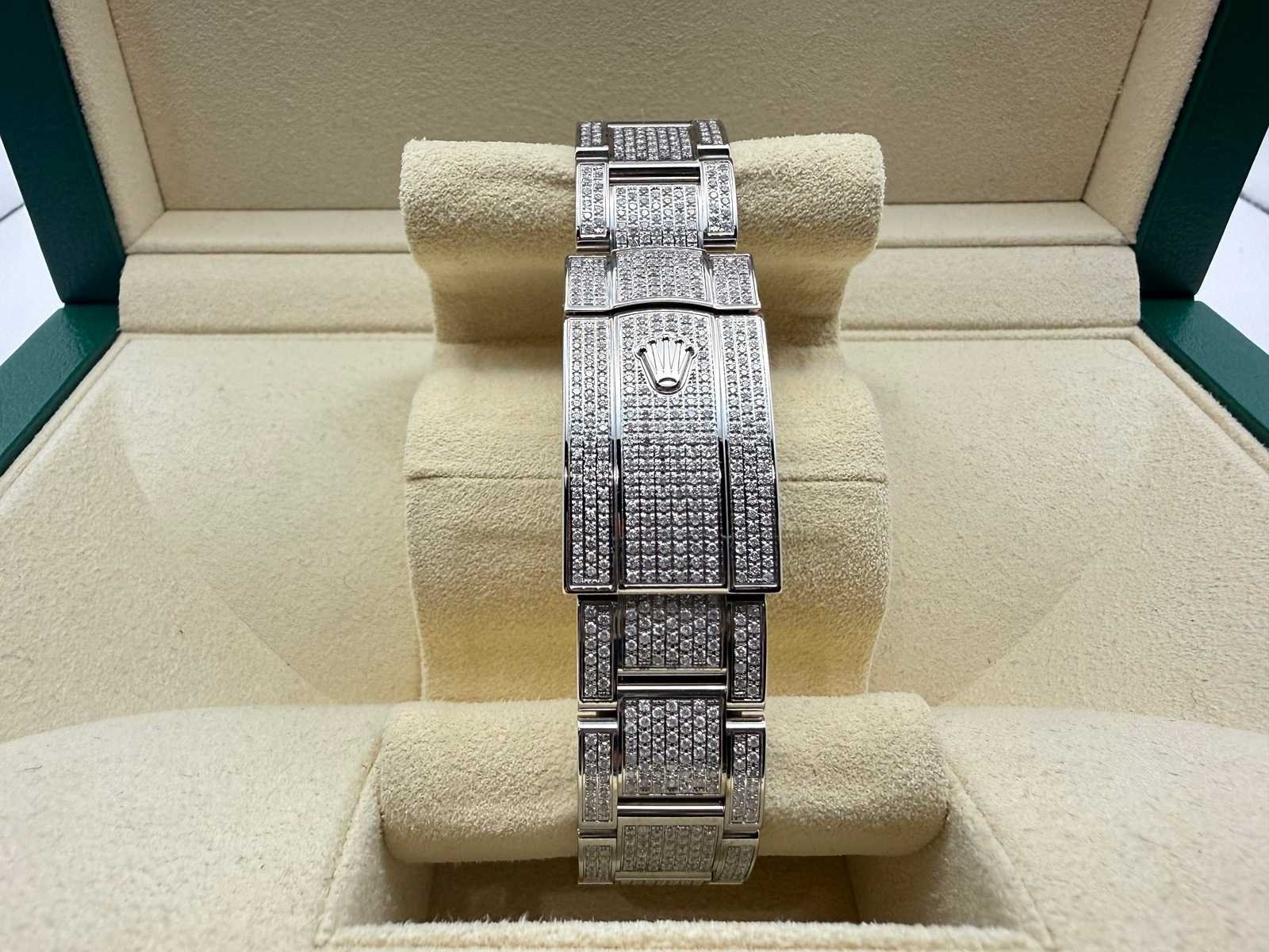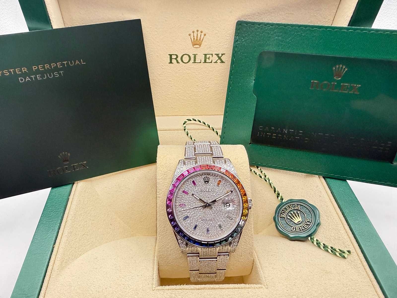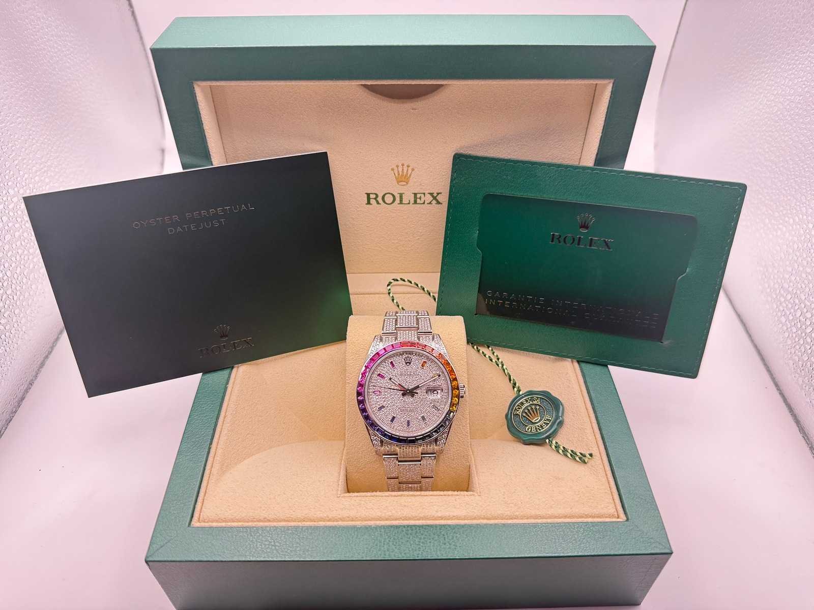 Key Features: Model: Rolex Datejust 41 Year: 2022 Condition: Unworn Case & bracelet: Fully iced out Dial: Rainbow stick dial Bracelet: Oyster Diamonds: Natural Set: Comes with Rolex box, guarantee card, and tag Merk: Rolex Model: Datejust 41 Bouwjaar: 2022 Referentienummer: 126300 Materiaal kast: Steel / Diamonds Materiaal horlogeband: Steel / Diamonds Materiaal sluiting: Steel / Diamonds Wijzerplaat: Rainbow Stick Diamond Dial Kastmaat: 41 mm