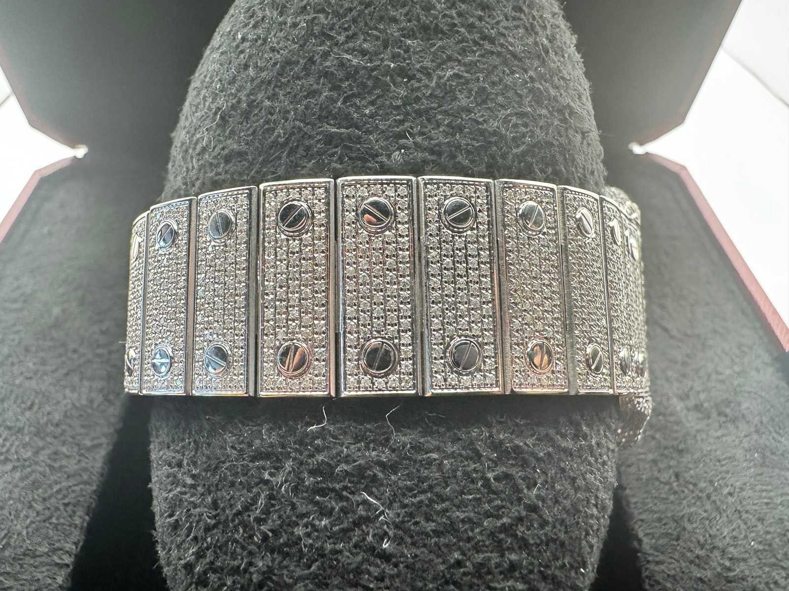 Conditie: Gloednieuw en ongedragen van 2020 • Diamantzetting: Volledig bezet met echte naturel VS diamanten, ook wel "iced out" genoemd • Complete Set: Inclusief originele Cartier doos, papieren en Cartier authenticatiepas • Referentienummer: WSSA0018 • Wijzerplaat: Iconische Cartier wijzerplaat met Romeinse cijfers volledig bezet met natural diamanten • Kast: Grote roestvrijstalen kast, perfect in harmonie met de fonkelende diamantzetting • Armband: Bijpassende roestvrijstalen armband, eveneens bezet met diamanten. Aanvullende Informatie: • Verpakking: Dit horloge wordt geleverd als een volledige set met de originele Cartier doos, officiële papieren en de Cartier authenticatiepas. Merk: Cartier Model: Santos Bouwjaar: 2020 Referentienummer: WSSA0018 Materiaal kast: Steel / Diamonds Materiaal horlogeband: Steel / Diamonds Materiaal sluiting: Steel / Diamonds Wijzerplaat: Diamonds Kastmaat: 39 mm