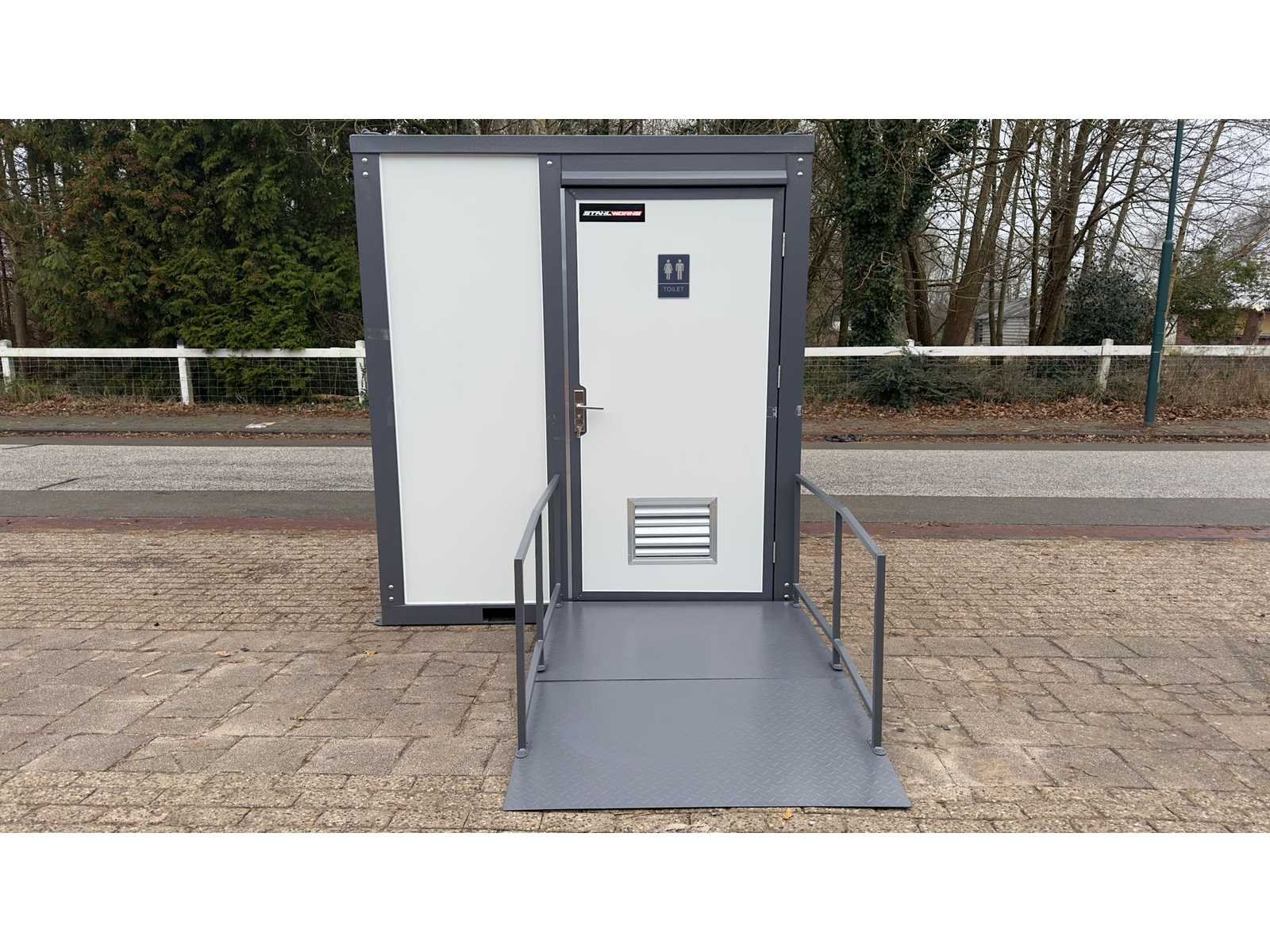 Voorzien van wc / toilet; wastafel; 230 Volt aansluiting; ventilatiesysteem; plafond verlichting; afsluitbaar met knopcilinder en sleutels; steunen voor het opstaan; oprij plank om er in te komen; lepelgaten en hijsogen; ongebruikt Merk: Stahlworks Type: Gehandicapte Bouwjaar: 2025 Aantal ramen: 1 Aantal toiletten: 1 Aantal wastafels: 1