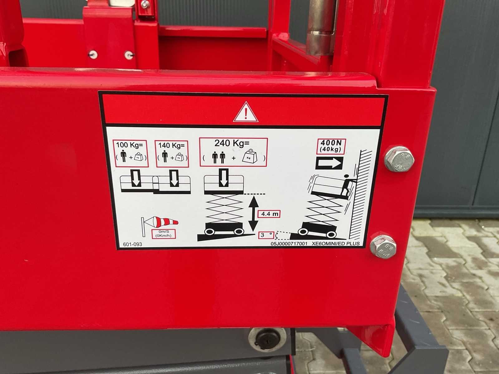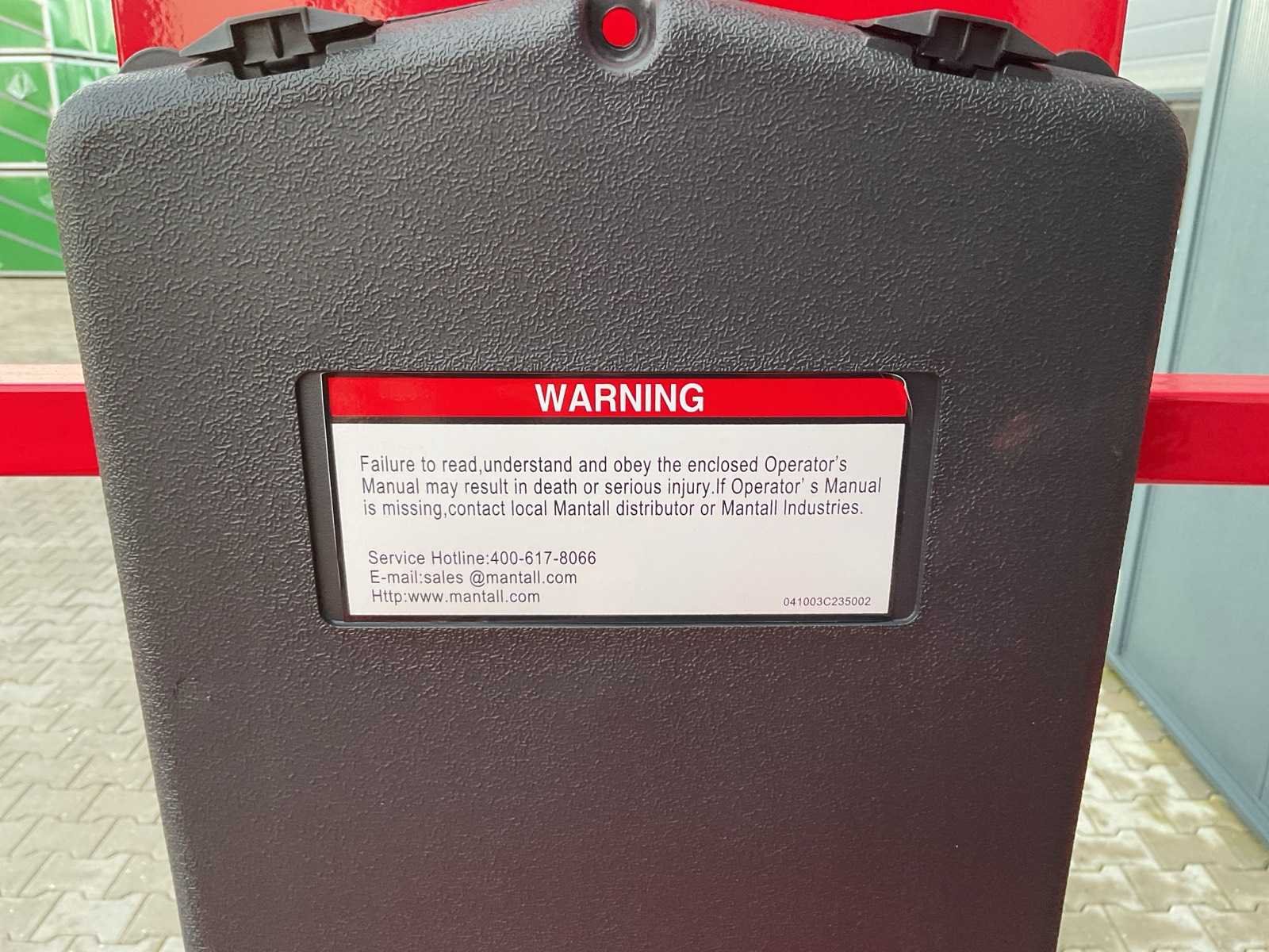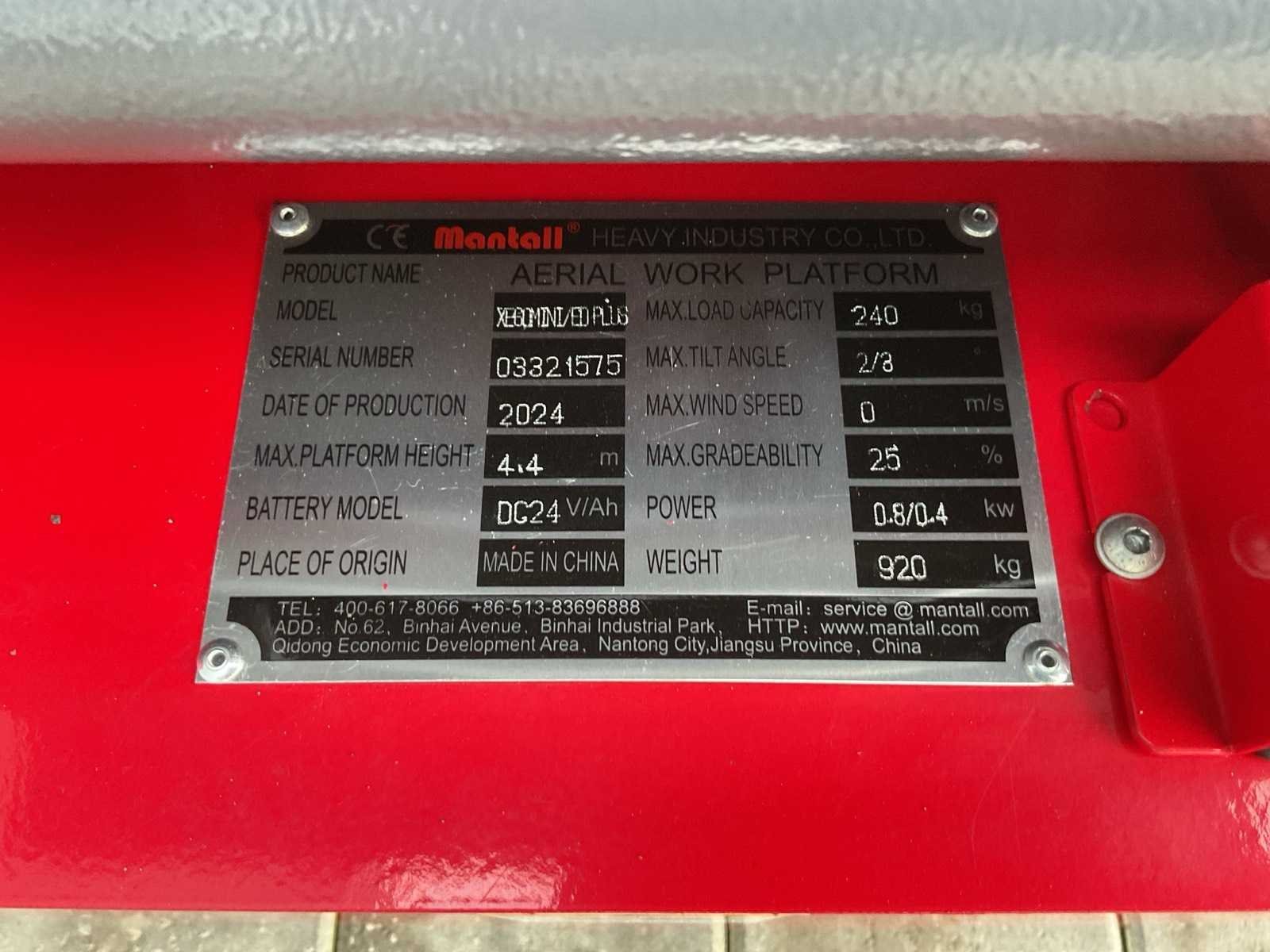 Voorzien van maximale werkhoogte: 6,4m; platformhoogte: 4,4m; max platformcapaciteit: 240kg; transporthoogte: 1590mm; rijsnelheid 3km/u; draaicirkel: 350mm; eigen gewicht: 920kg Merk: Mantall Type: XE-60 mini Bouwjaar: 2025 Telescoop hoogwerker: true Totale afmeting L: 13000mm Totale afmeting Breedte: 7600mm Totale afmeting Hoogte: 20400mm