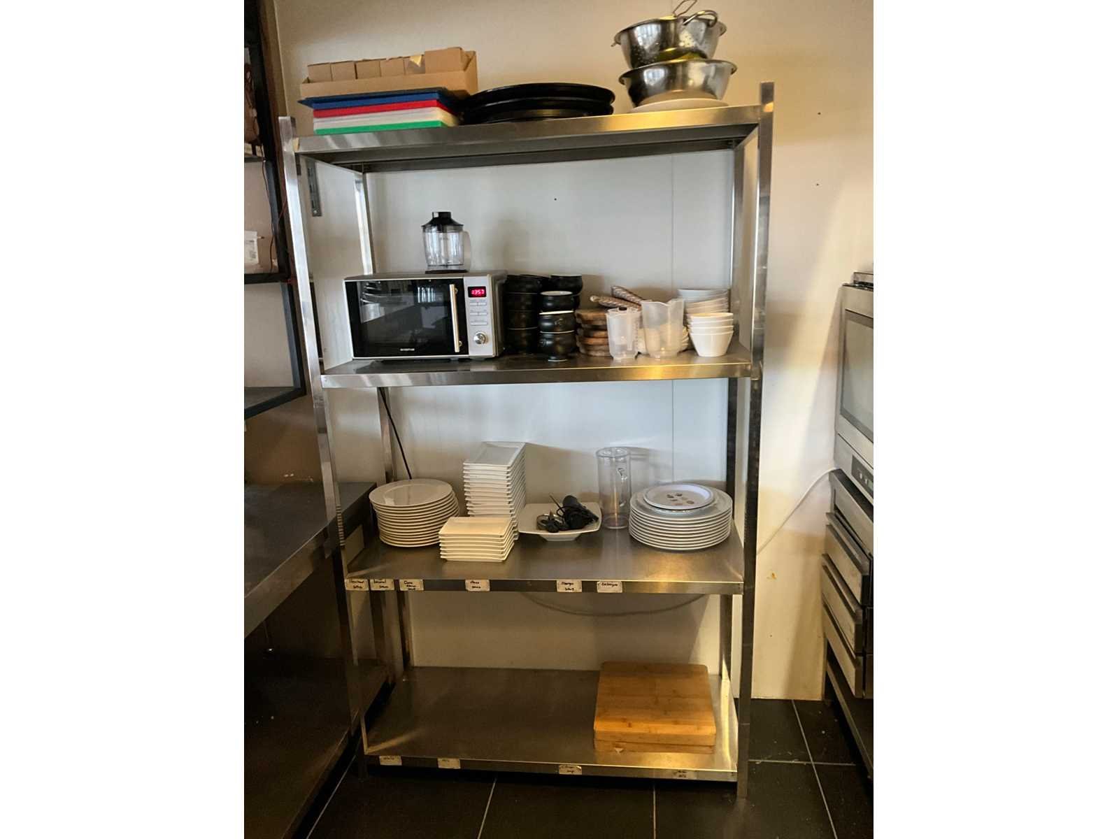 Tafel 1400x700x850 mm, stelling 480x1200x1950 mm, Met inhoud diverse keukenbenodigdheden