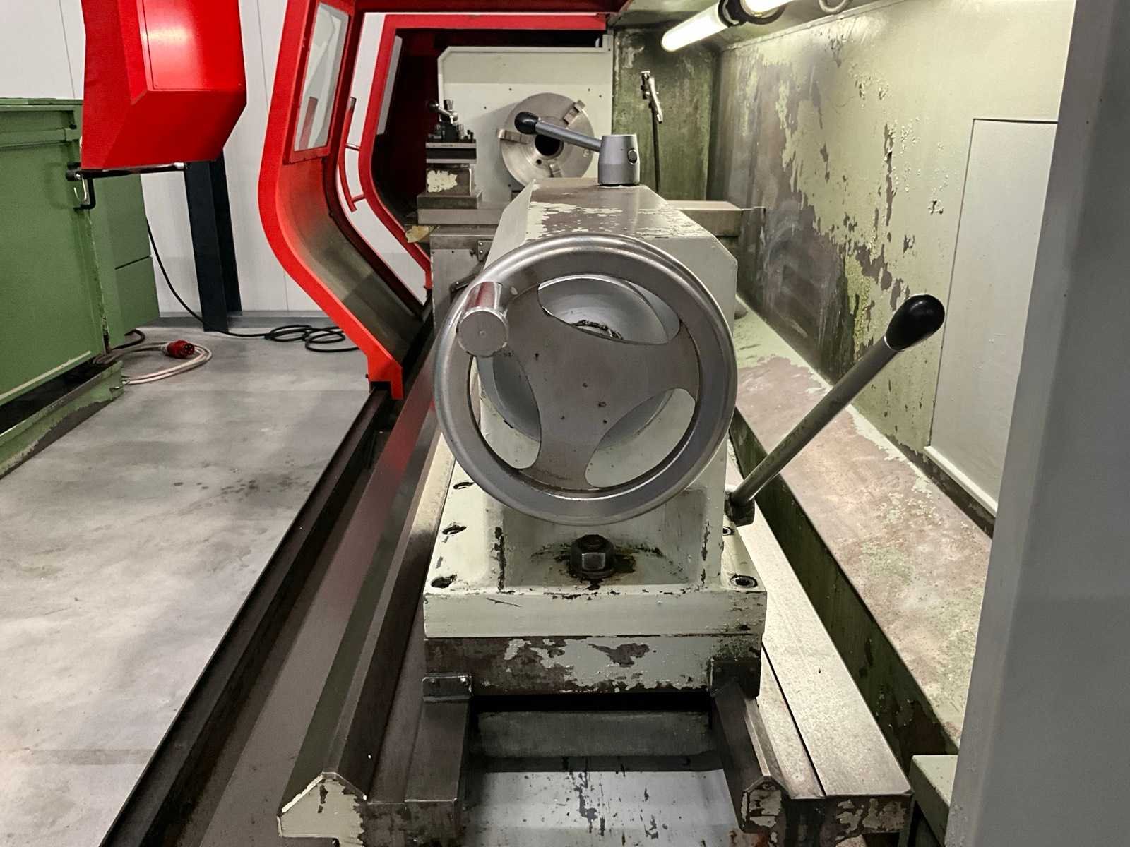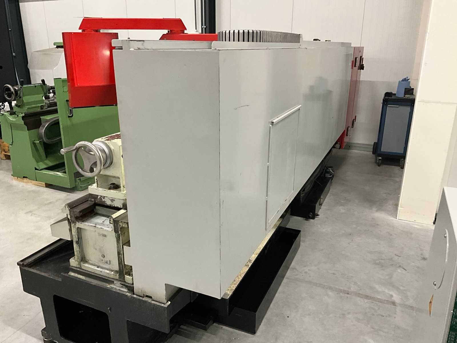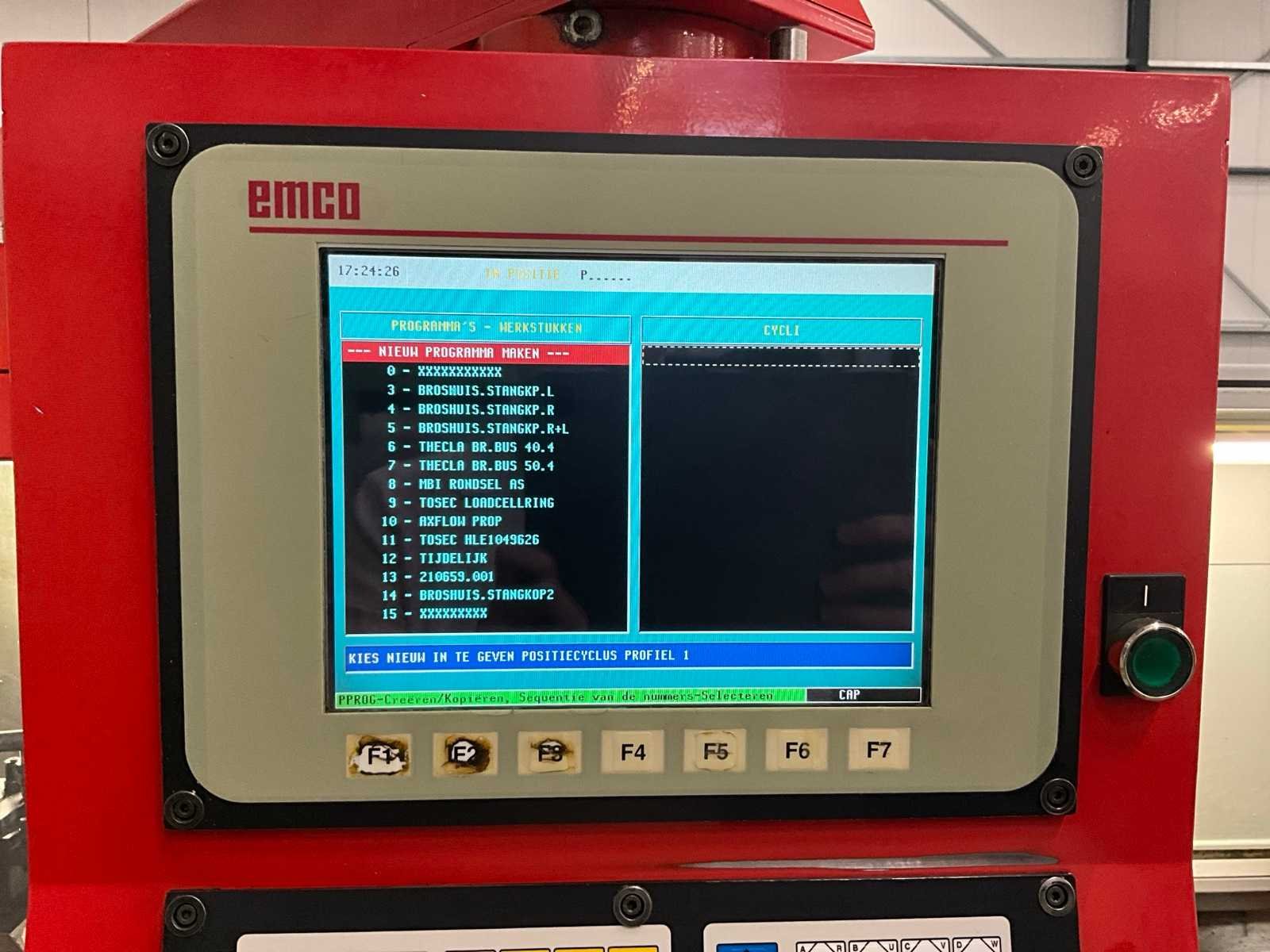 Emco E 300 / 3000 teach-in draaibank; Fagor 8055T besturing; draaidiameter boven bed Ø 550 mm; draaidiameter boven dwarsslede Ø 340 mm; afstand tussen centers 3000 mm; spildoorlaat Ø 108 mm; spilopname Camlock 8; maximaal toerental 2.500 RPM; gereedschaphouder 4-slag Parat Gr. 3; tegencenter MK5 met 220 mm slag; hoofdvermogen 25/17 kW; elektrische installatie 24 kVA / 3 x 400V / 50 Hz; machineafmetingen ca. L 5,2 m x B 2,1 m x H 1,9 m; machinegewicht ca. 4.000 kg; dubbele deur; spanenopvangbak; automatisch smeersysteem; koelmiddelinrichting; machineverlichting; machine voldoet aan CE-richtlijn; met harde omkeerklauwen, boeken/papieren en 4x Parat beitelhouders. Merk: EMCO Type: E 300 / 3000 Bouwjaar: 2006 Serienummer: 300120367 Draailengte: 3000mm Draai: 550mm Holle spil Ø: 108mm Snelheid tot n =: 2500rpm Aantal gereedschapwisselstations: 4 Koelmiddelpomp: true Besturing, merk, type: Fagor 8055T Motorvermogen (kW): 25/17kW Machinegewicht: 4000kg Afmeting l: 5200mm Afmeting b: 2100mm Afmeting h: 1900mm