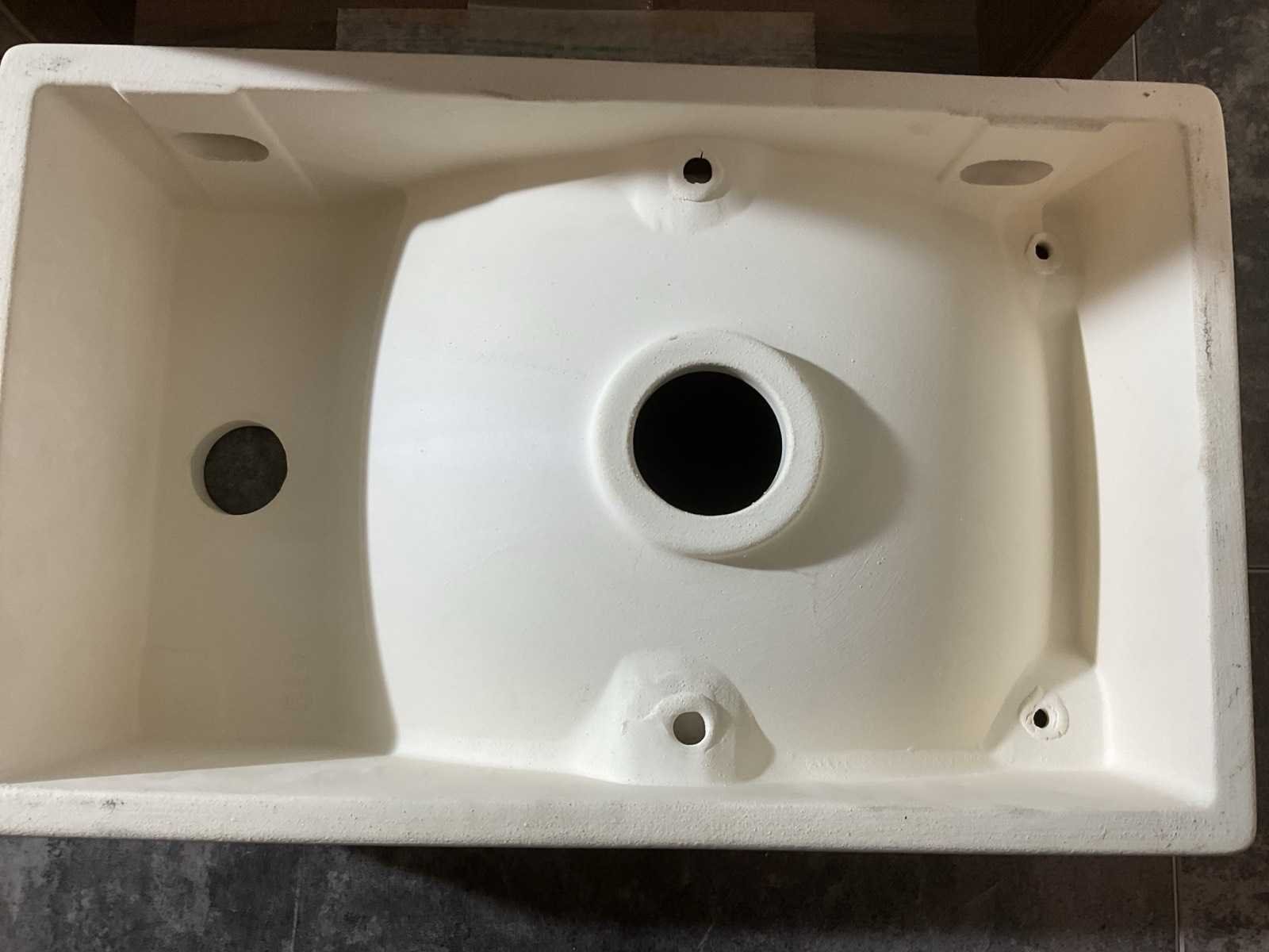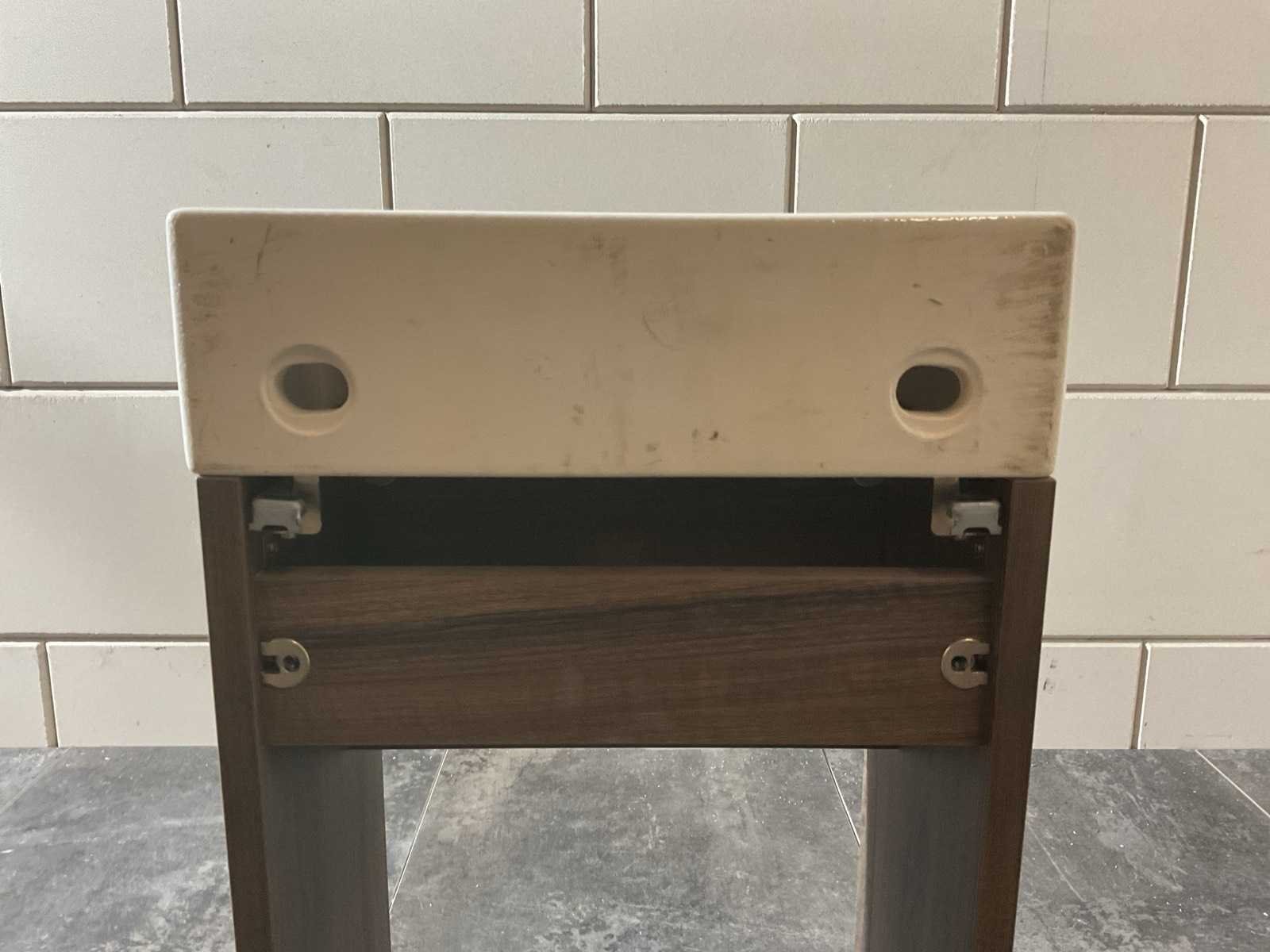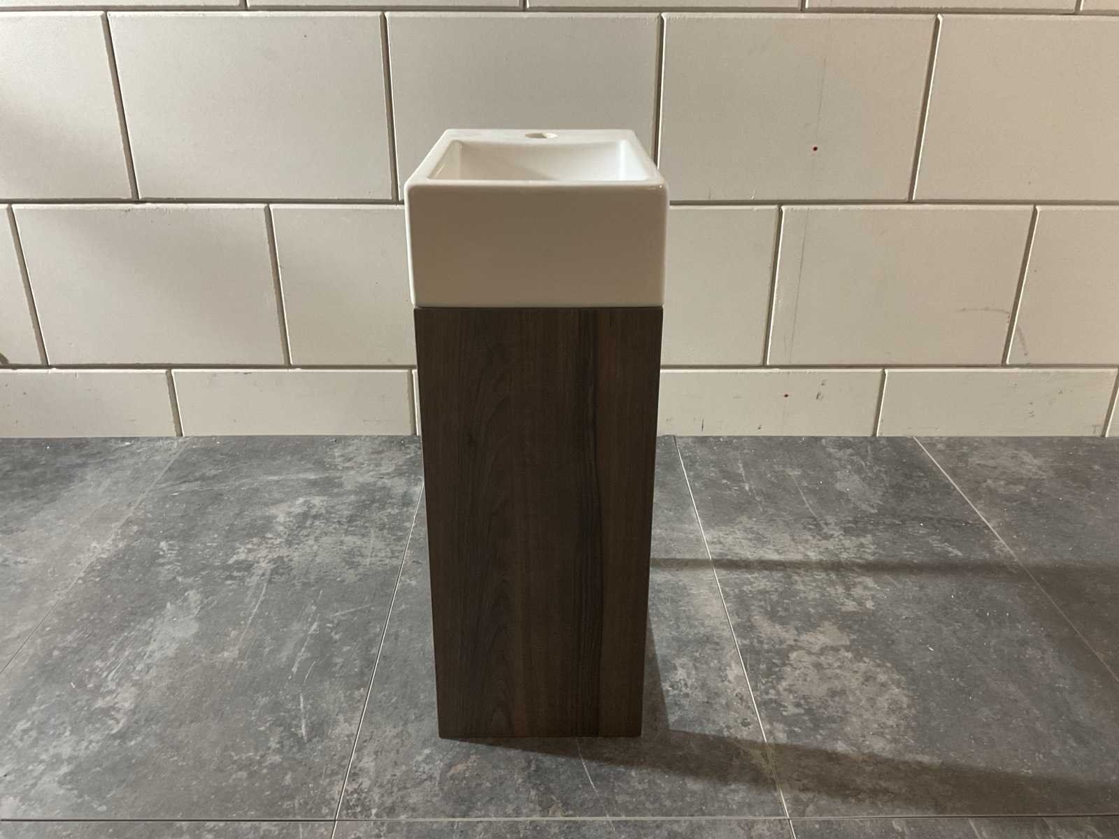 Met kraangat Merk: Primabad Lengte: 37cm Breedte: 23cm Hoogte: 61cm Materiaal: Keramiek, hout