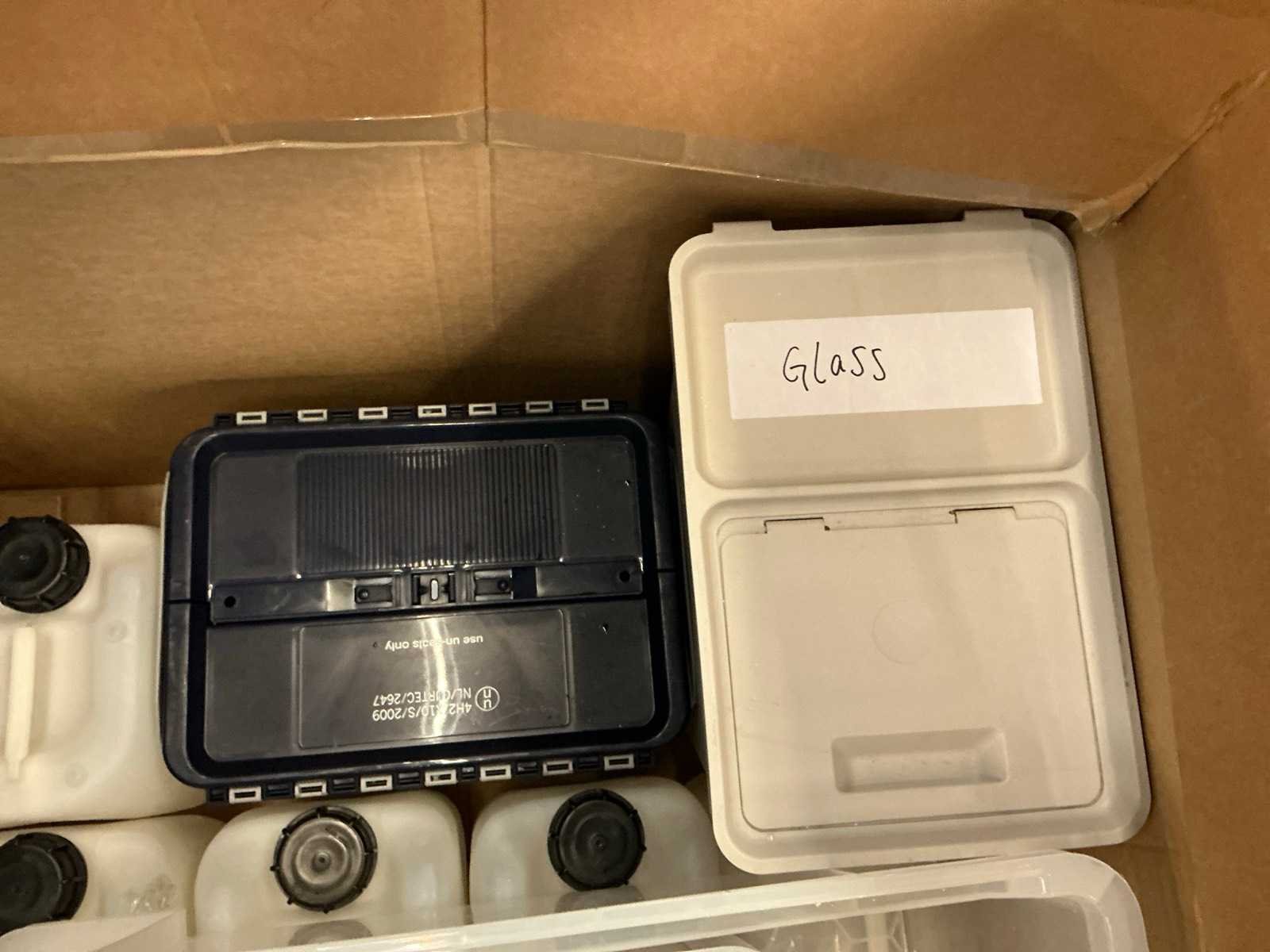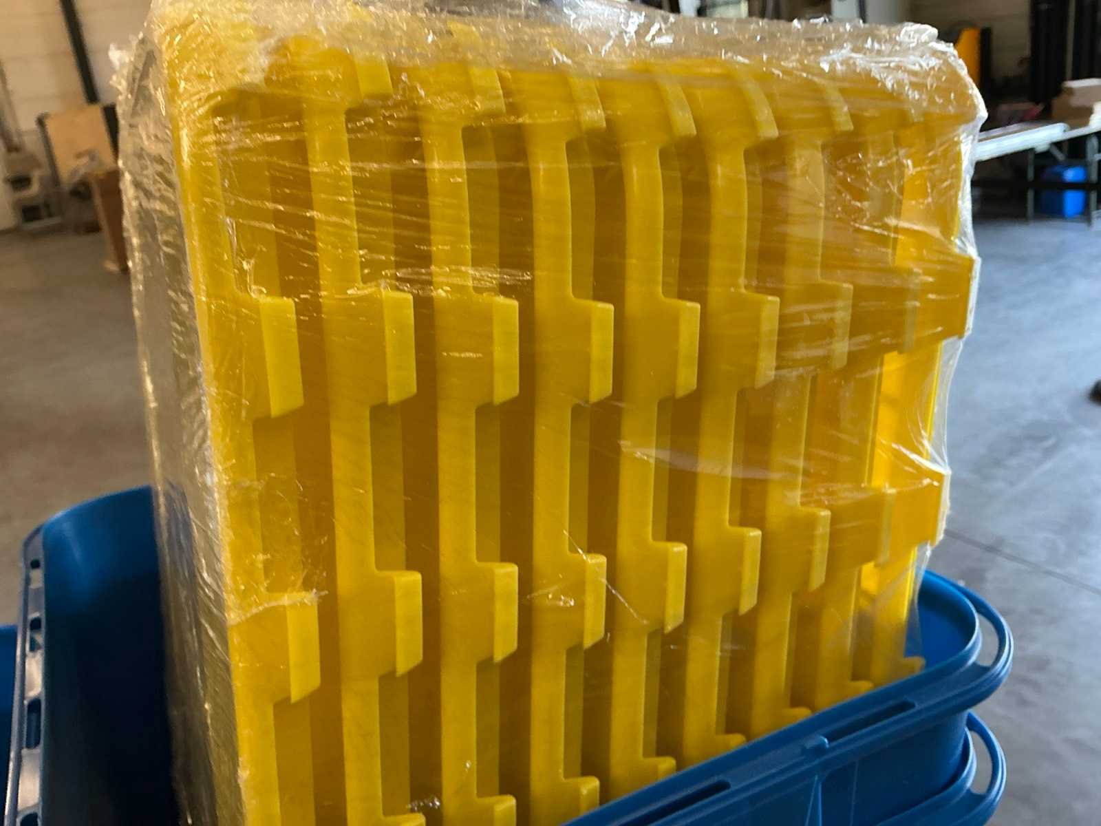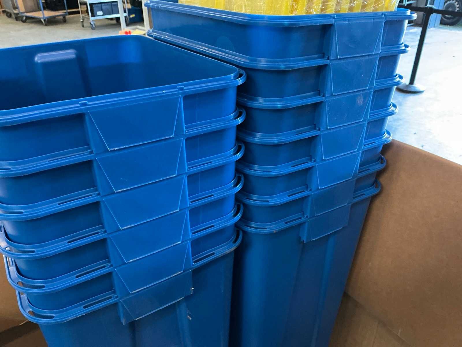 9 gele deksel, 13 blauwe containers, jerrycans 15x.