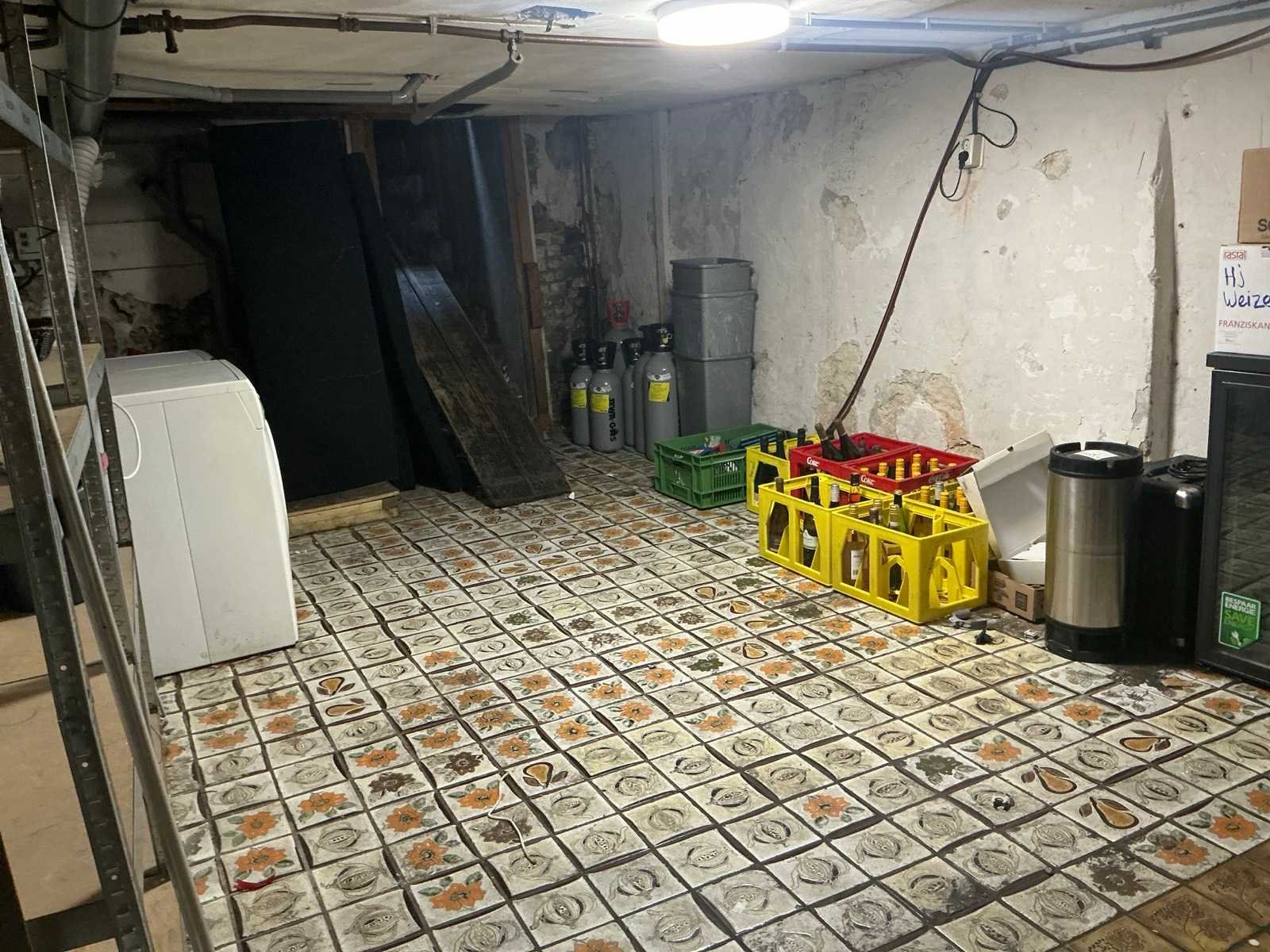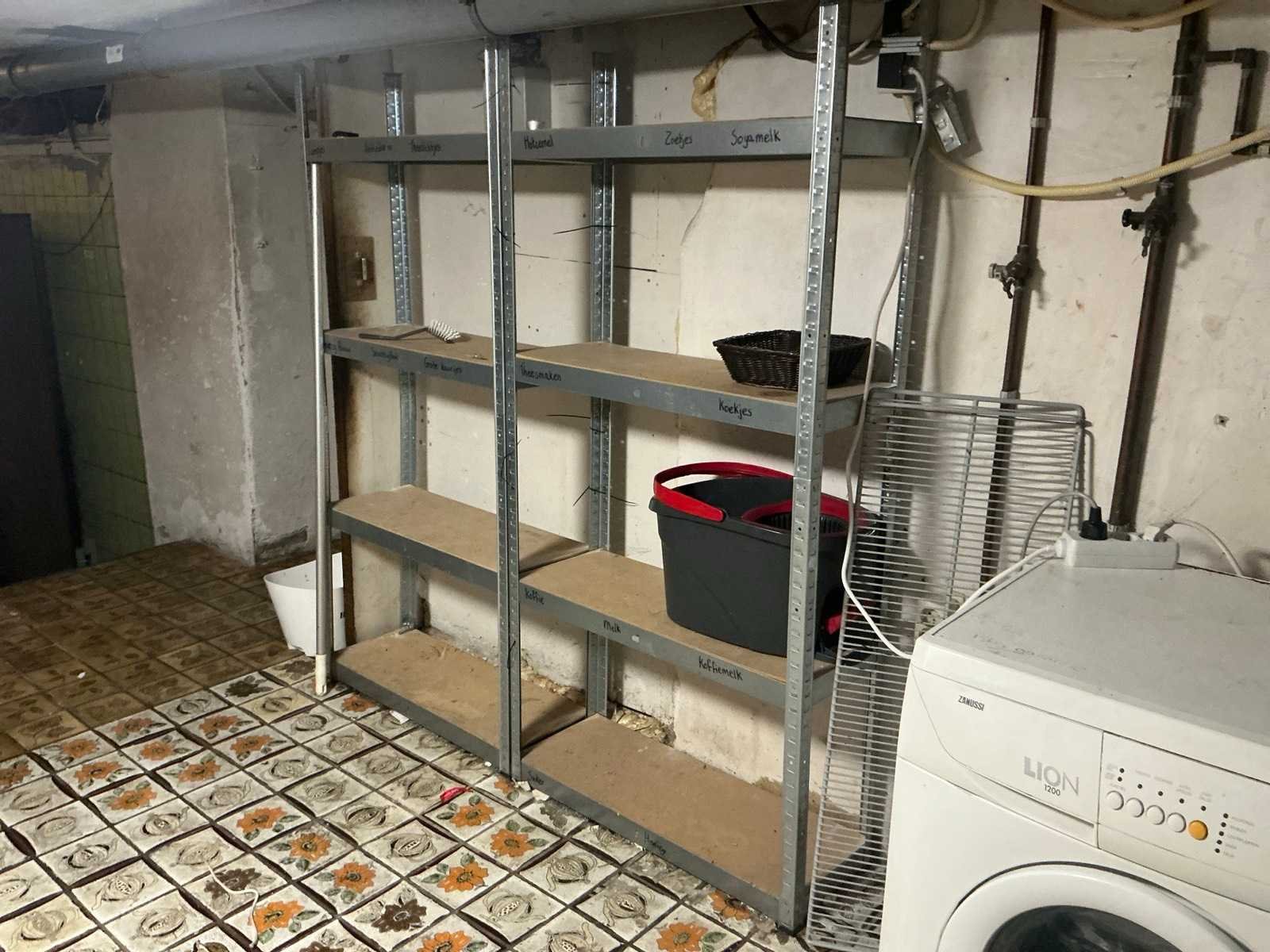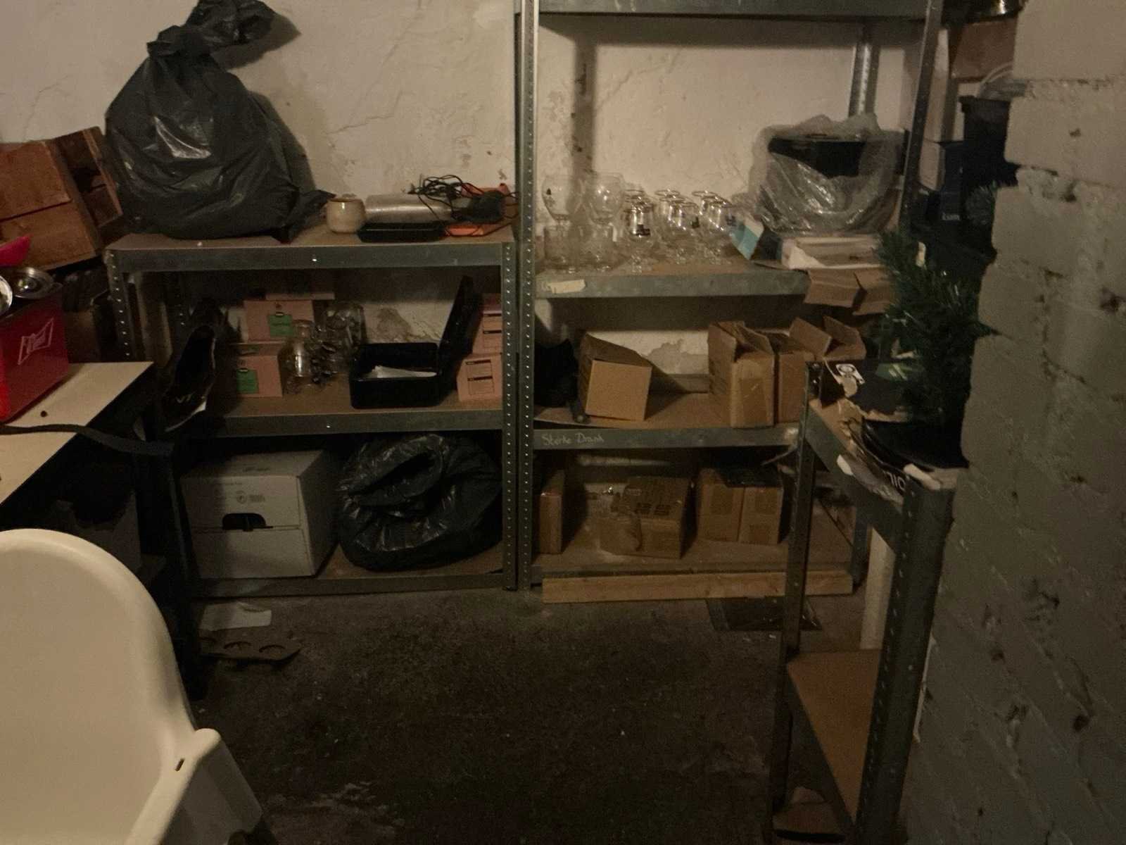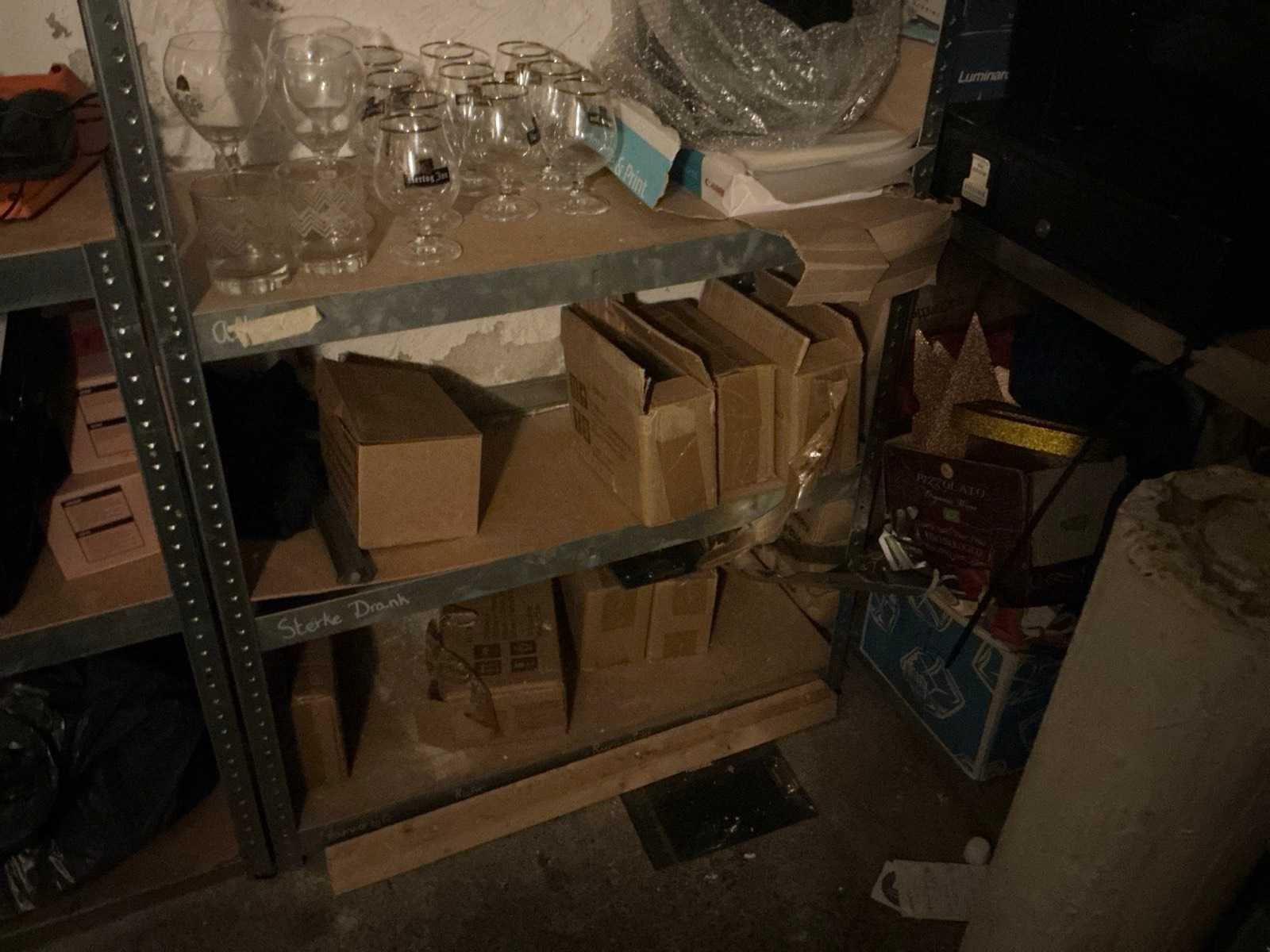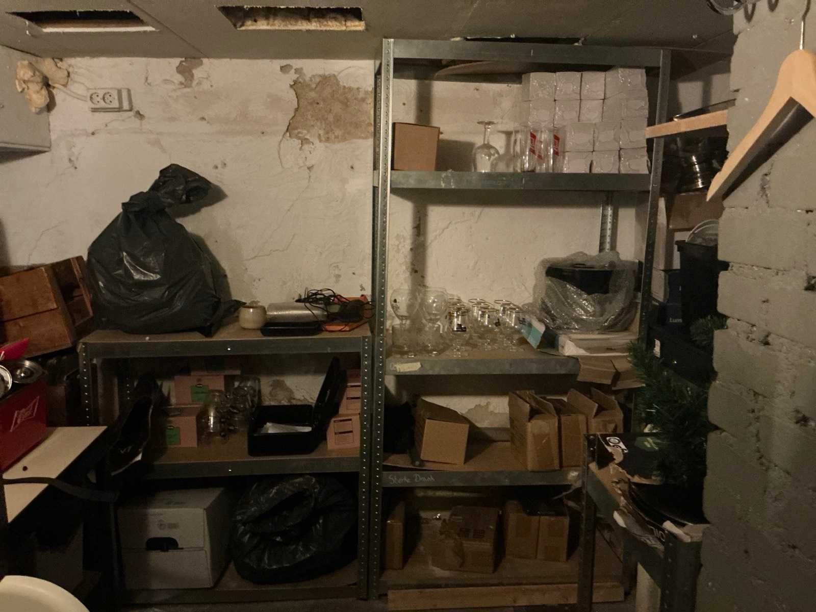 Bereikbaar middels trap. Ruimte dient leeg opgeleverd te worden. Bestaande uit: Inhoud kelder 1e: Indesit Wasmachine en Zanussi droger 2e: Divers glaswerk in doos 3e: Diverse vriezers en koelingen 4e: Stellingen met inhoud o.a. bar benodigdheden 5e: Schoonmaak materialen 6e: Diverse wijnen in krat 7e: bar koelingen