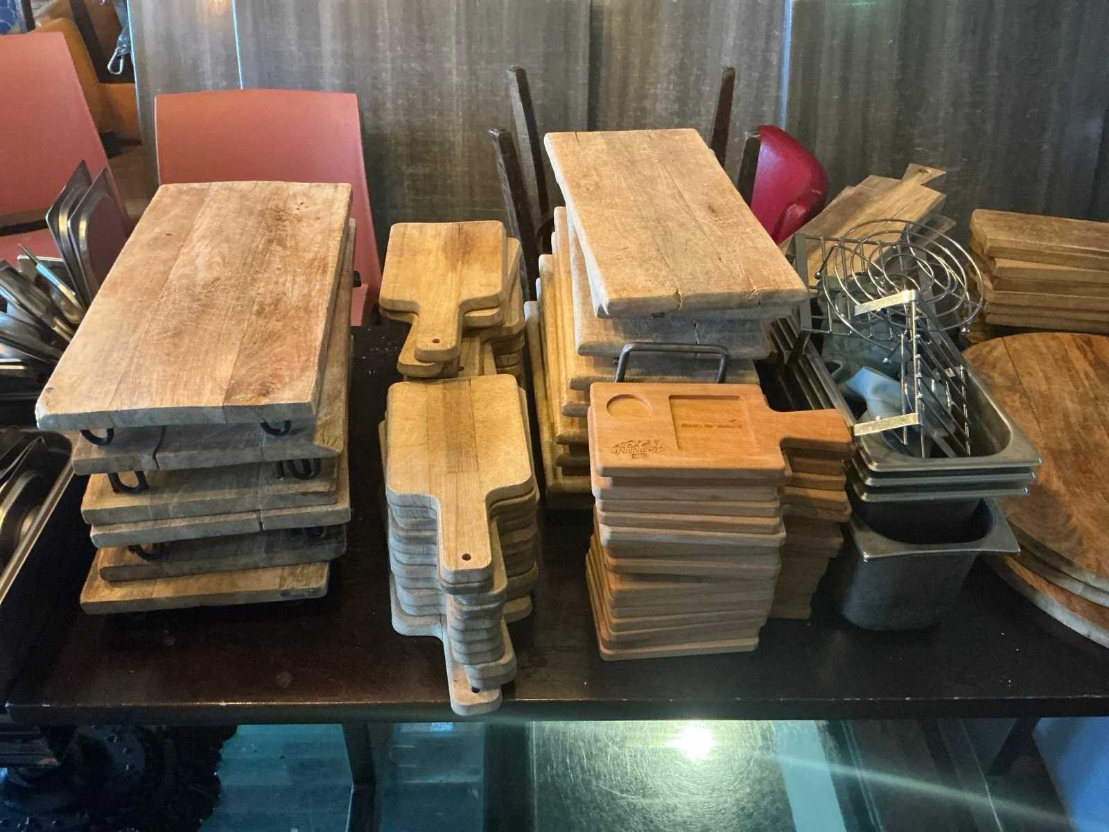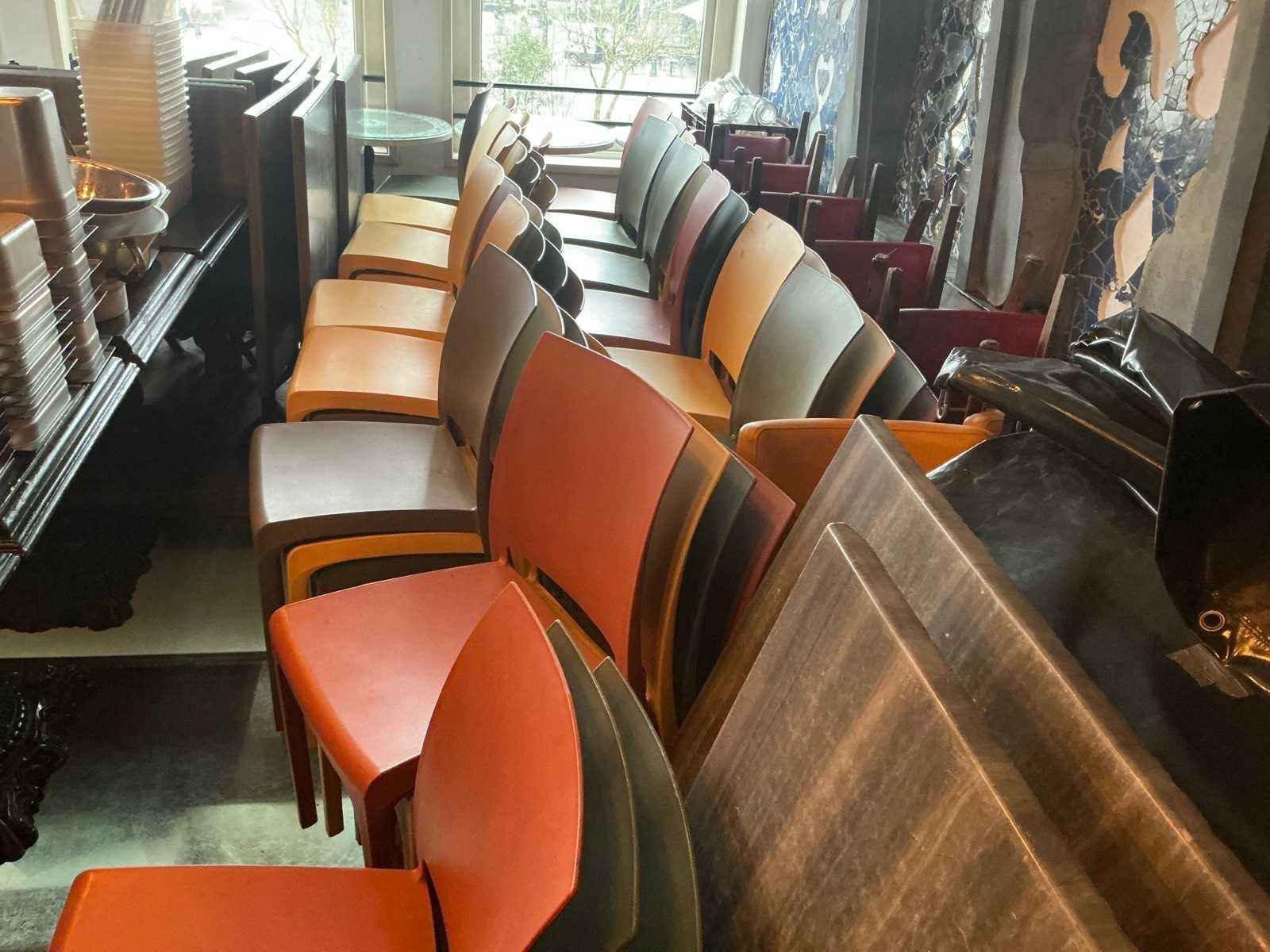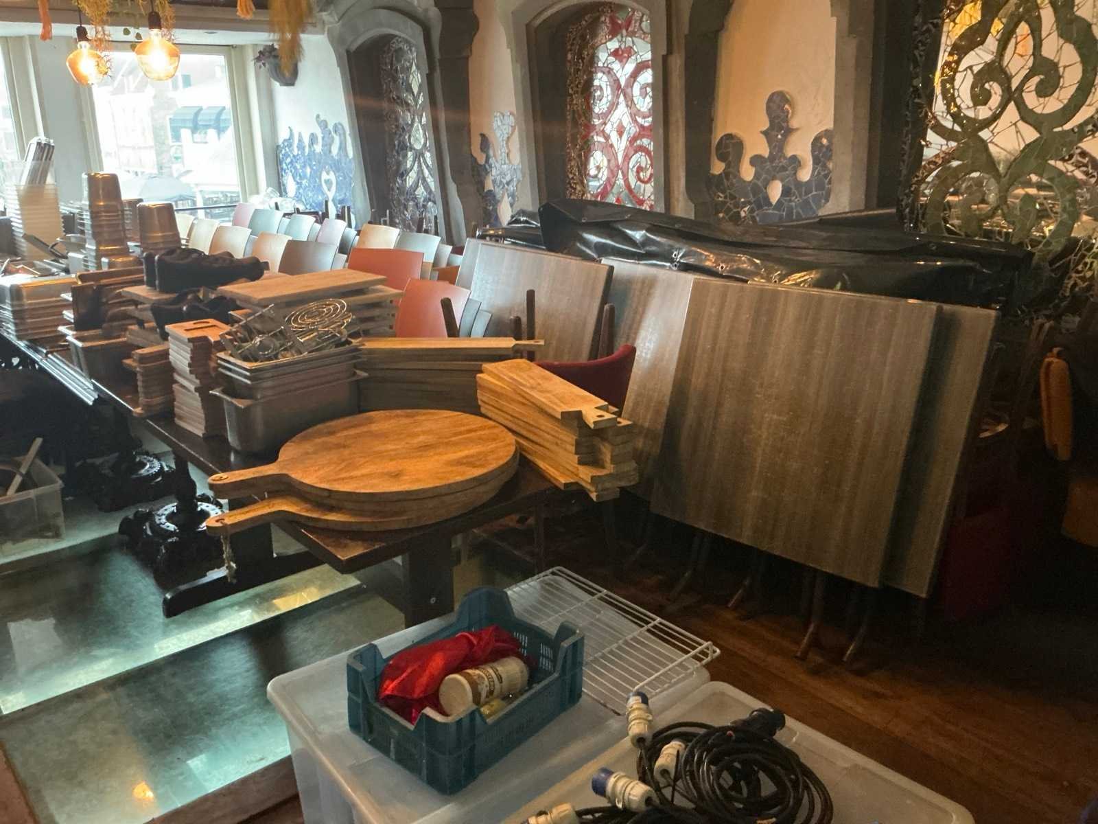 Bestaande uit: Inhoud voor gedeelte restaurant 1e: 10x restaurant tafel in diverse soorten en maten 2e: Divers keuken benodigdheden 3e: 18x klaptafel 80x80cm 4e: Partij gastronormbakken 5e: Divers Servies en bestek 6e: 36x houten restaurant stoel 7e: 50x kunststof stoel in diverse kleuren 8e: Diverse houten serveerplanken
