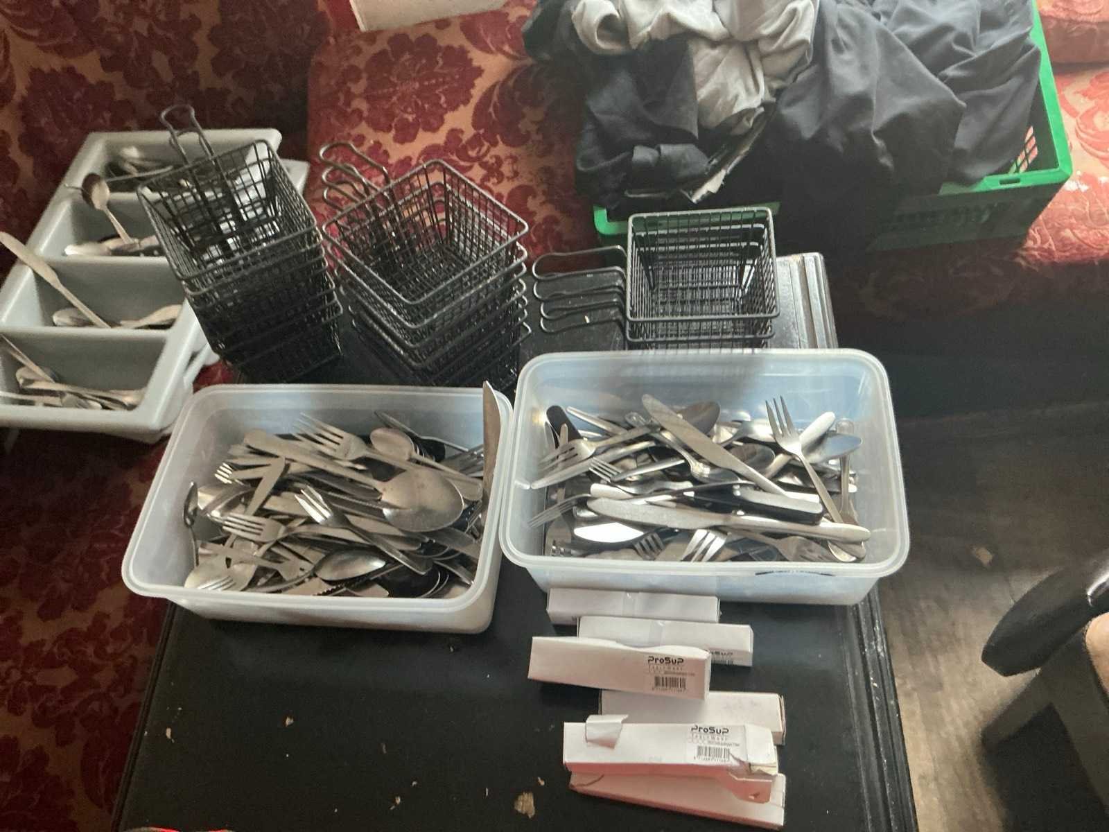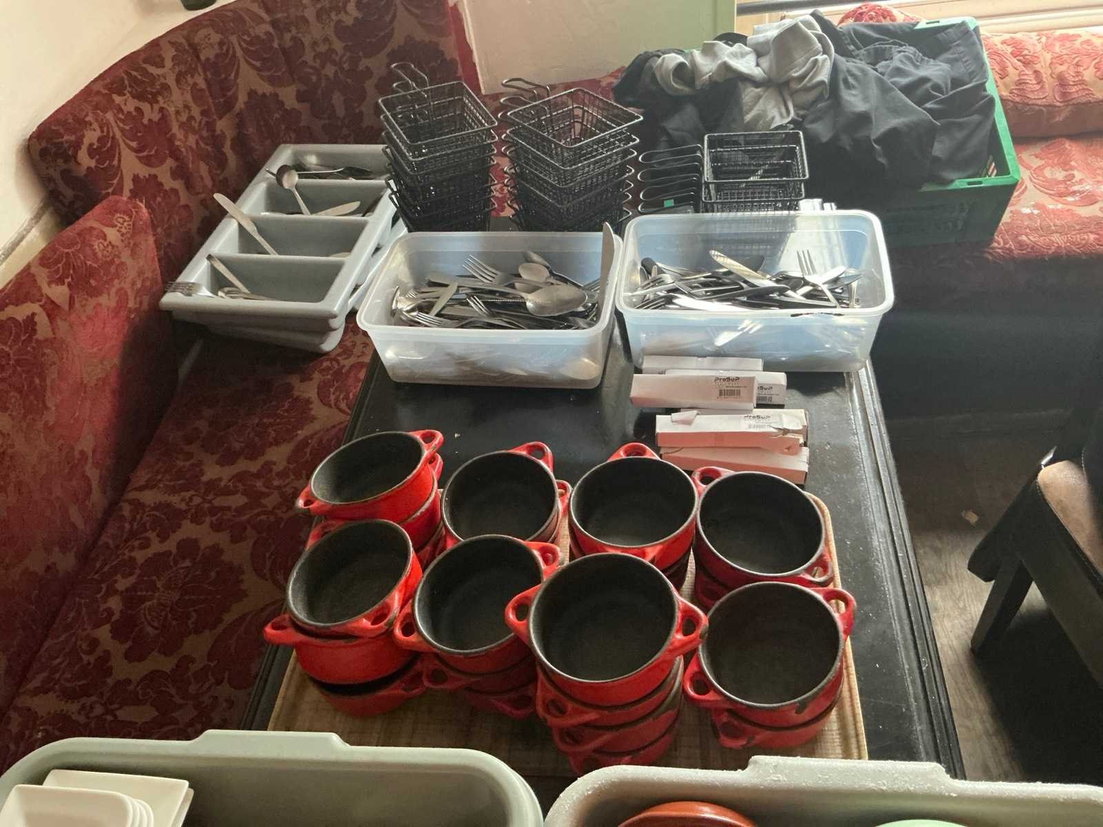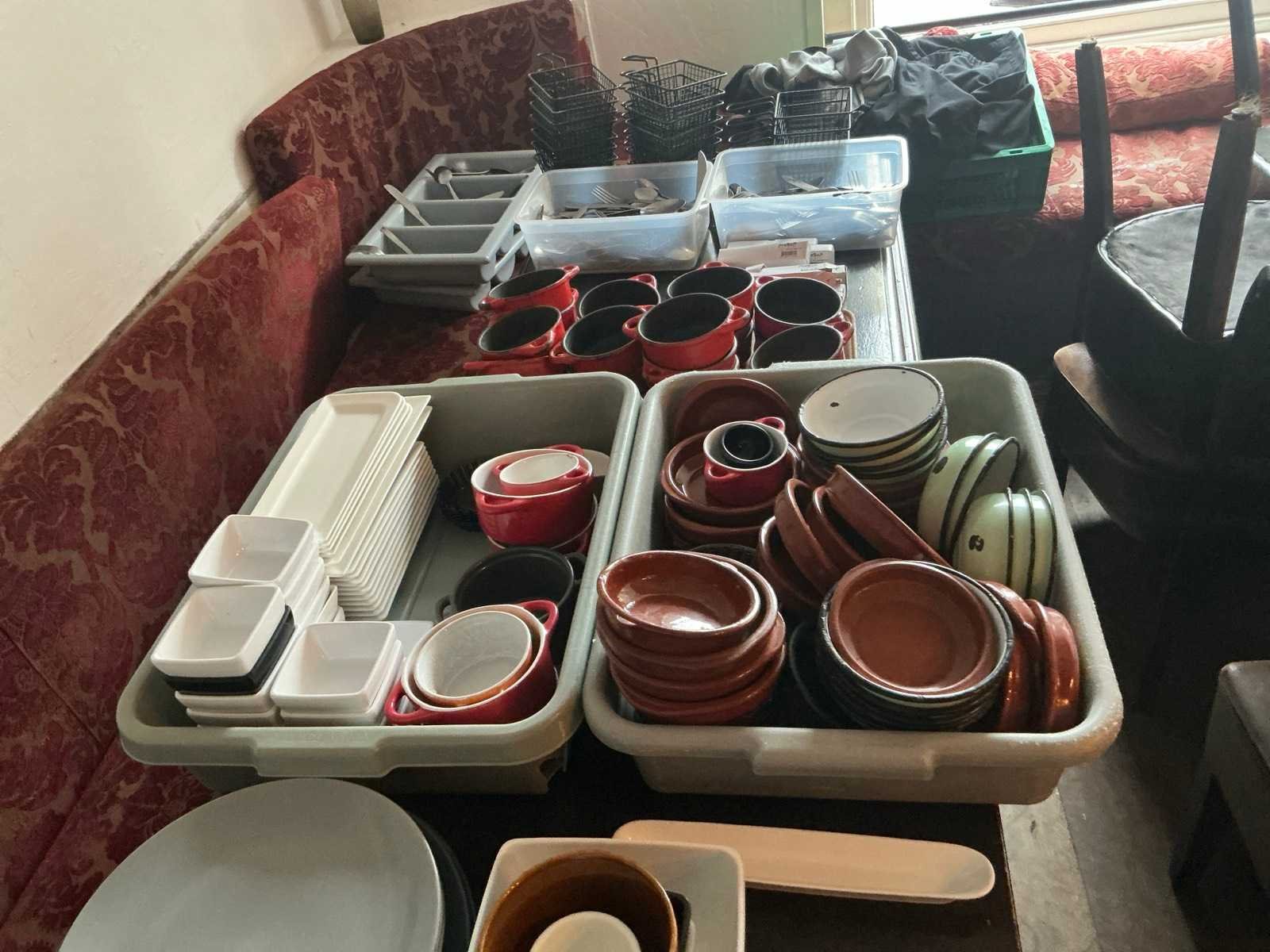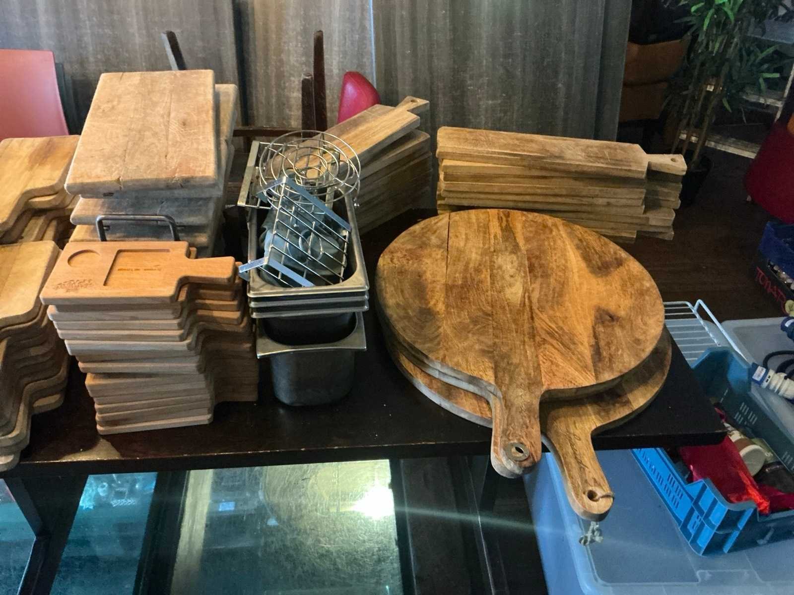 Bestaande uit: Inhoud voor gedeelte restaurant 1e: 10x restaurant tafel in diverse soorten en maten 2e: Divers keuken benodigdheden 3e: 18x klaptafel 80x80cm 4e: Partij gastronormbakken 5e: Divers Servies en bestek 6e: 36x houten restaurant stoel 7e: 50x kunststof stoel in diverse kleuren 8e: Diverse houten serveerplanken