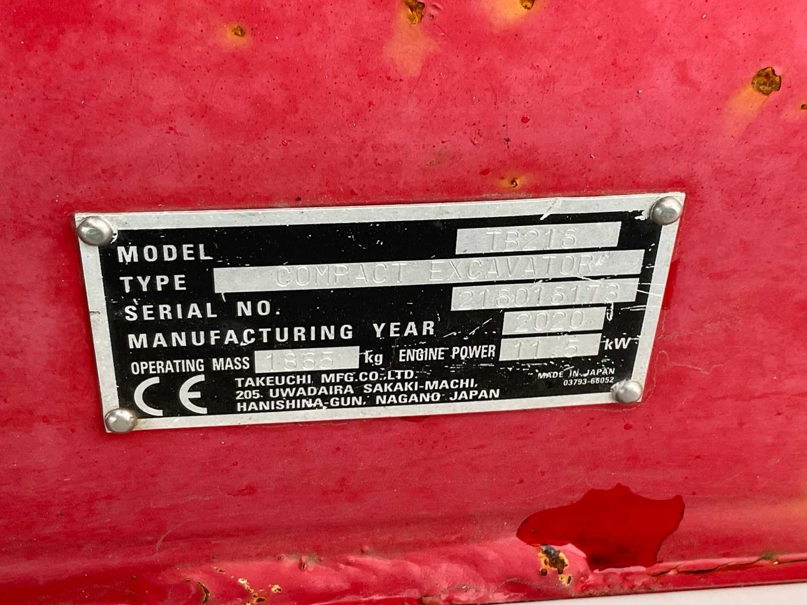 Tweede graafbak 450x200x350 mm, dozerblad 100 cm, extra hydraulische aansluiting, werklampen, rupsen in breedte verstelbaar. Merk: Takeuchi Type: TB216 Bouwjaar: 2020 Serienummer: 2018016173 Merk motor: Yanmar Motorvermogen (kW): 11.5kW Aantal cilinders: 3 Brandstof: Diesel Gieklengte: 3000mm Inclusief graafbak: Yes Graafbak afm. l: 350mm Graafbak afm. b: 950mm Graafbak afm. h: 350mm Rups breedte: 220mm Afgelezen urenstand: 2100 Eigen gewicht: 1865kg Totale afmeting L: 3300mm Totale afmeting Breedte: 1300mm Totale afmeting Hoogte: 2300mm