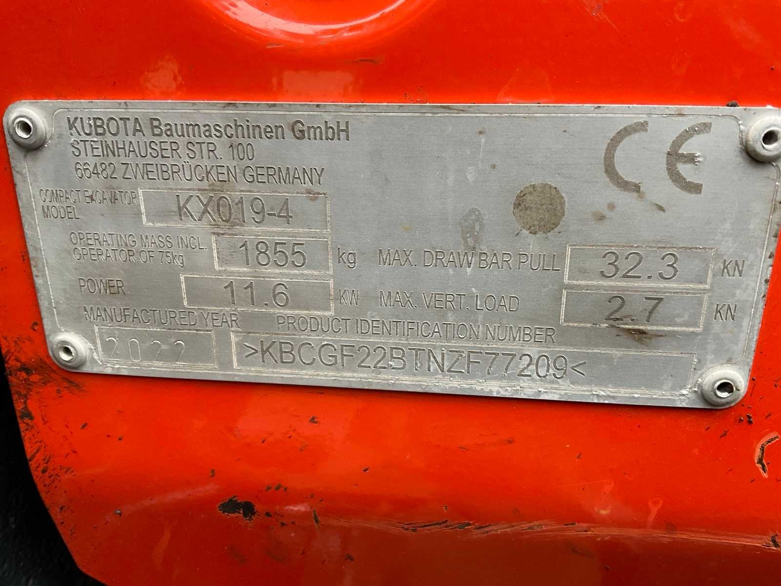Tweede graafbak 450x200x350 mm, dozerblad 100 cm, 2x 15 cm te verbreden, rupsen te verbreden, extra hydraulische aansluiting, werklampen, zwaailamp. Merk: Kubota Type: KX019-4 Bouwjaar: 2022 Serienummer: KBCGF22BTNZF77209 Merk motor: Kubota D902 Motorvermogen (kW): 11.6kW Aantal cilinders: 3 Brandstof: Diesel Gieklengte: 3000mm Met graafbak: true Graafbak afm. l: 350mm Graafbak afm. b: 950mm Graafbak afm. h: 250mm Rups breedte: 230mm Afgelezen urenstand: 1995 Eigen gewicht: 1855kg Totale afmeting L: 3600mm Totale afmeting Breedte: 1300mm Totale afmeting Hoogte: 2250mm