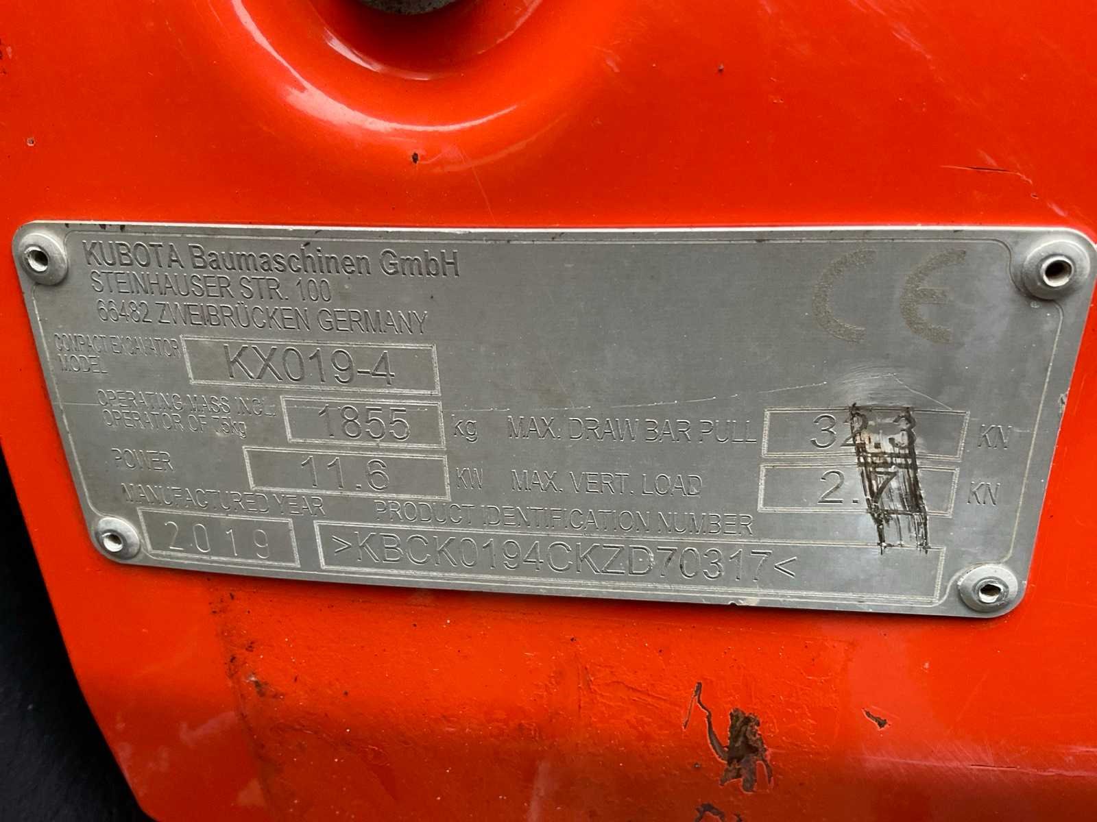 Tweede graafbak 450x350x350 mm, dozerblad 100 cm, 2x 15 cm te verbreden, rupsen te verbreden, extra hydraulische aansluiting, werklampen, zwaailamp. Merk: Kubota Type: KX019-4 Bouwjaar: 2019 Serienummer: KBCG0194CKZD70317 Merk motor: Kubota D902 Motorvermogen (kW): 11.6kW Aantal cilinders: 3 Brandstof: Diesel Gieklengte: 3000mm Met graafbak: true Graafbak afm. l: 350mm Graafbak afm. b: 950mm Graafbak afm. h: 320mm Rups breedte: 230mm Afgelezen urenstand: 3818 Eigen gewicht: 1855kg Totale afmeting L: 3600mm Totale afmeting Breedte: 1300mm Totale afmeting Hoogte: 2250mm