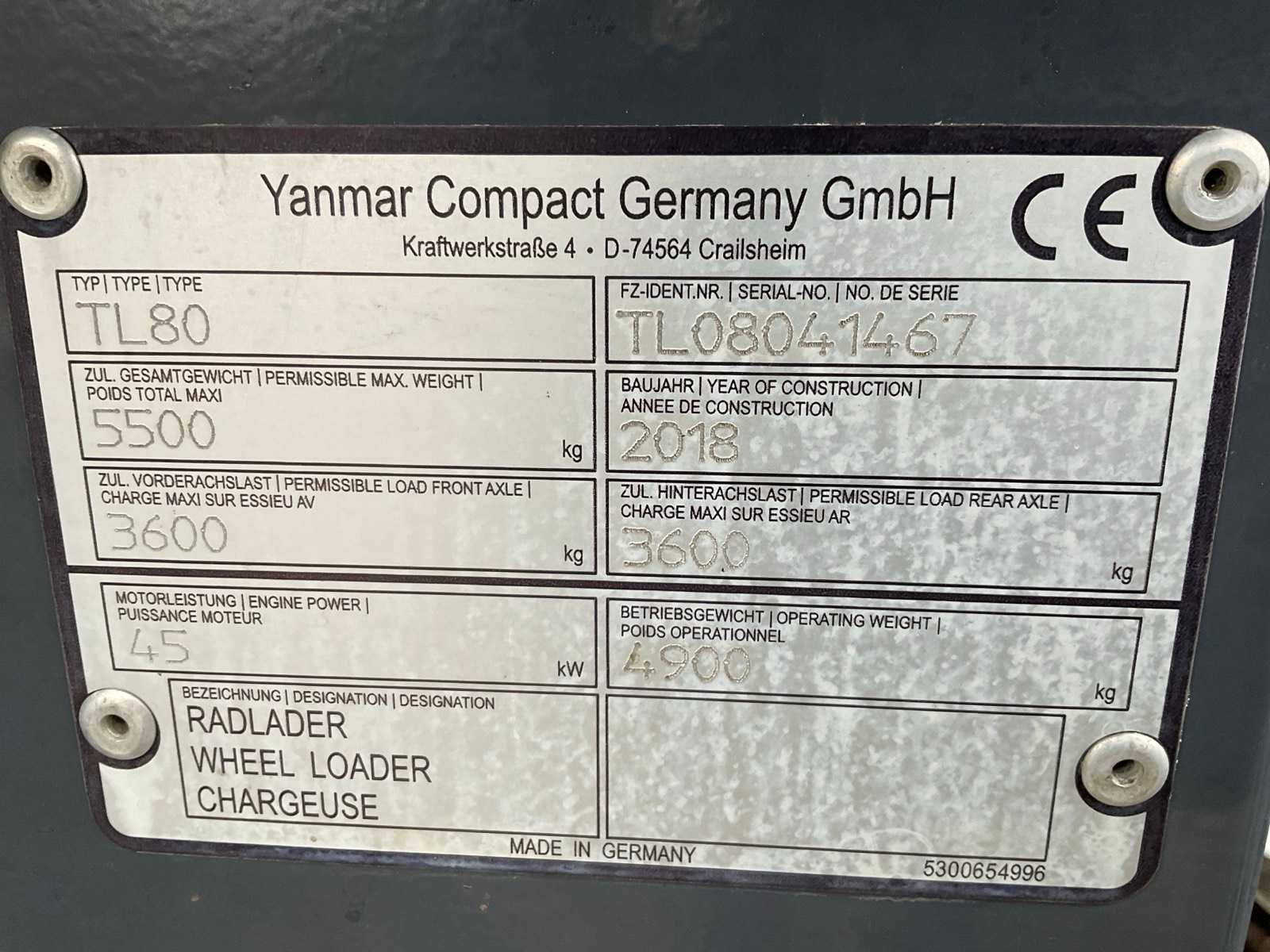 Inclusief lepels 115 cm lang, snelwissel, werklampen, zwaailamp. Merk: Yanmar Type: TL80 Bouwjaar: 2018 Serienummer: TL08041467 Merk motor: Deutz Kenteken: T-91-HBZ Motorvermogen (kW): 45kW Aantal cilinders: 4 Brandstof: Diesel Graafbak afm. l: 700mm Graafbak afm. b: 1800mm Graafbak afm. h: 800mm Bandenmaat: 405/70R18 Cabine: true Afgelezen urenstand: 1750 Eigen gewicht: 4900kg Totale afmeting L: 6000mm Totale afmeting Breedte: 1800mm Totale afmeting Hoogte: 2700mm