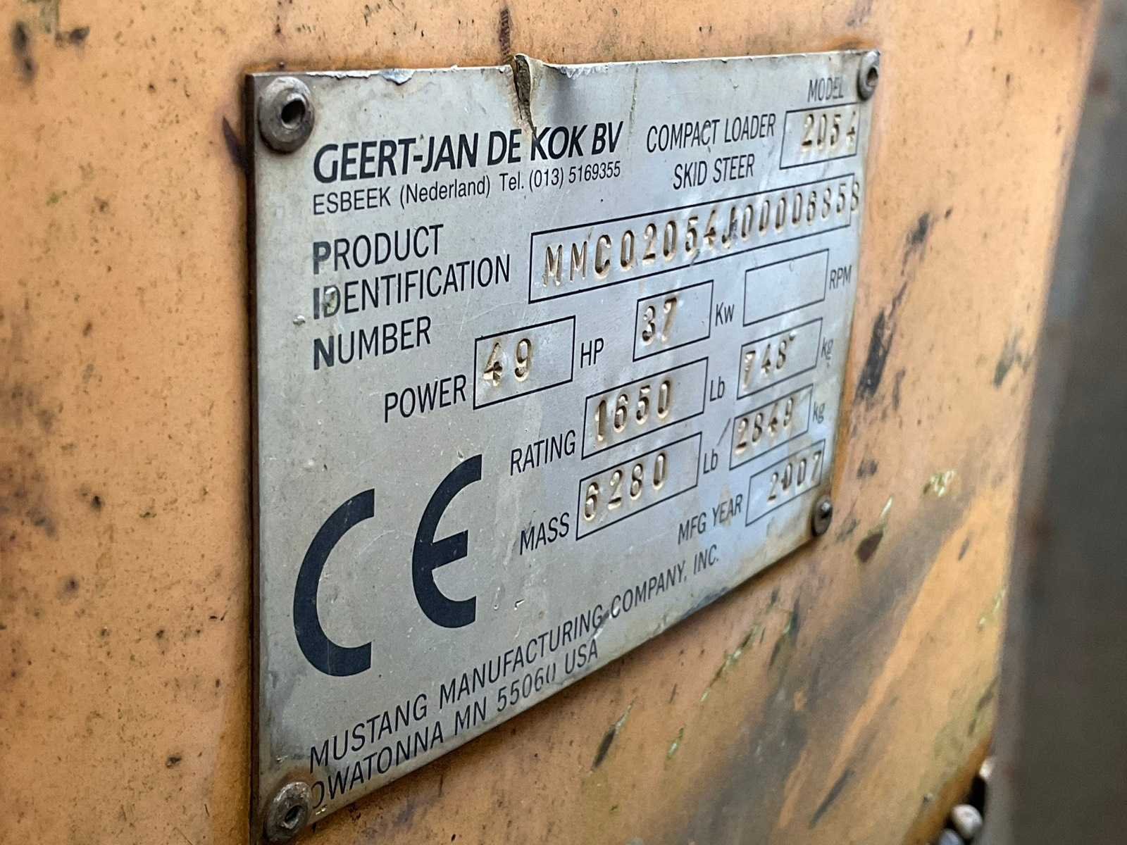 Aantal draaiuren: 2858uur, Brandstof: Diesel. Merk: Mustang Type: 2054 B-Series Bouwjaar: 2007 Serienummer: MMC02054J00006853 Merk motor: Yanmar Motorvermogen (kW): 37kW Aantal cilinders: 4 Brandstof: Diesel Bandenmaat: 265/70R16.5 NHS Graafbak afm. l: 1640mm Graafbak afm. b: 900mm Graafbak afm. h: 500mm Afgelezen urenstand: 2858 Eigen gewicht: 6280kg Totale afmeting L: 3300mm Totale afmeting Breedte: 1500mm Totale afmeting Hoogte: 2000mm