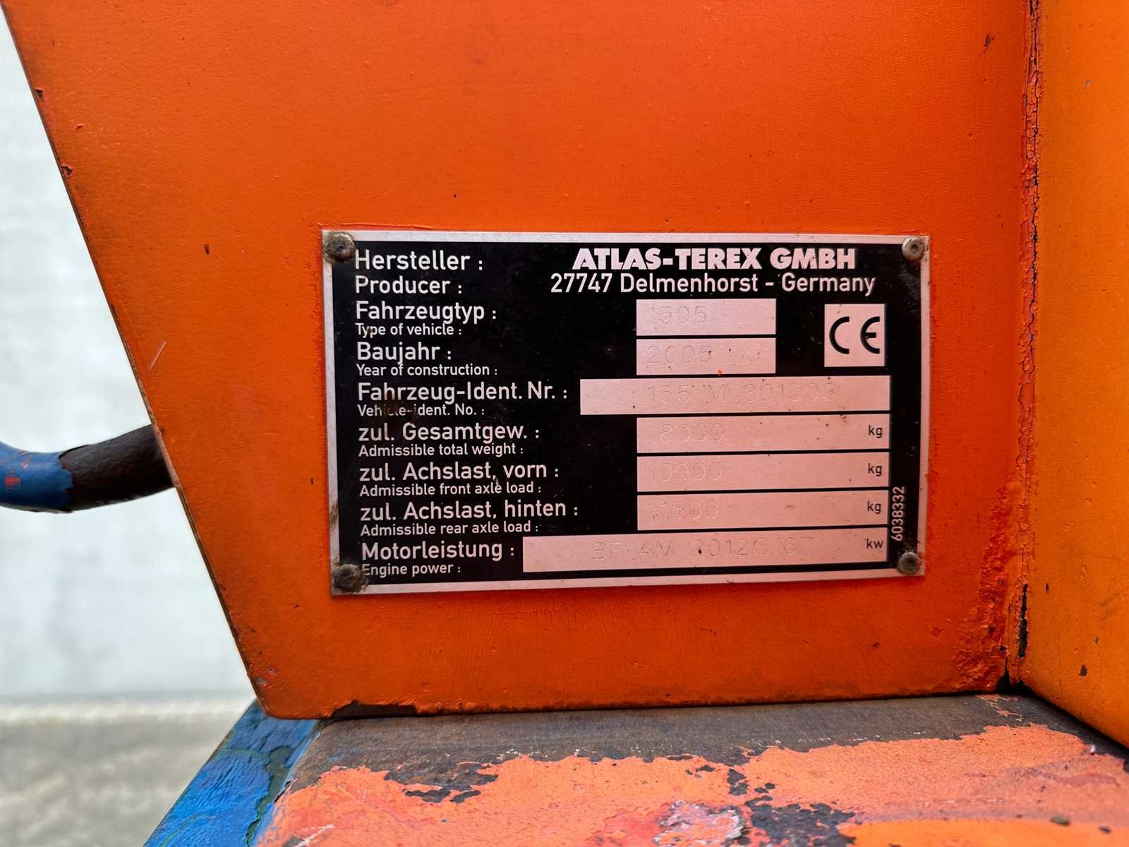 Hydraulische snelwissel Extra hydraulische leidingen Duwblad en steunpoten Voorarm : 2650mm Geen documenten Zwenkfunctie werkt niet!! Merk: ATLAS Type: Terex Bouwjaar: 2005 Serienummer: 155M301303 Merk motor: Deutz BF4M2012C Motorvermogen (kW): 88kW Aantal cilinders: 4 Brandstof: Diesel Bedrijfsgewicht: 18000kg Graafbak afm. b: 1900mm Bandenmaat: 10.00-20 Afgelezen urenstand: 13895 Totale afmeting L: 8500mm Totale afmeting Breedte: 2500mm Totale afmeting Hoogte: 3100mm
