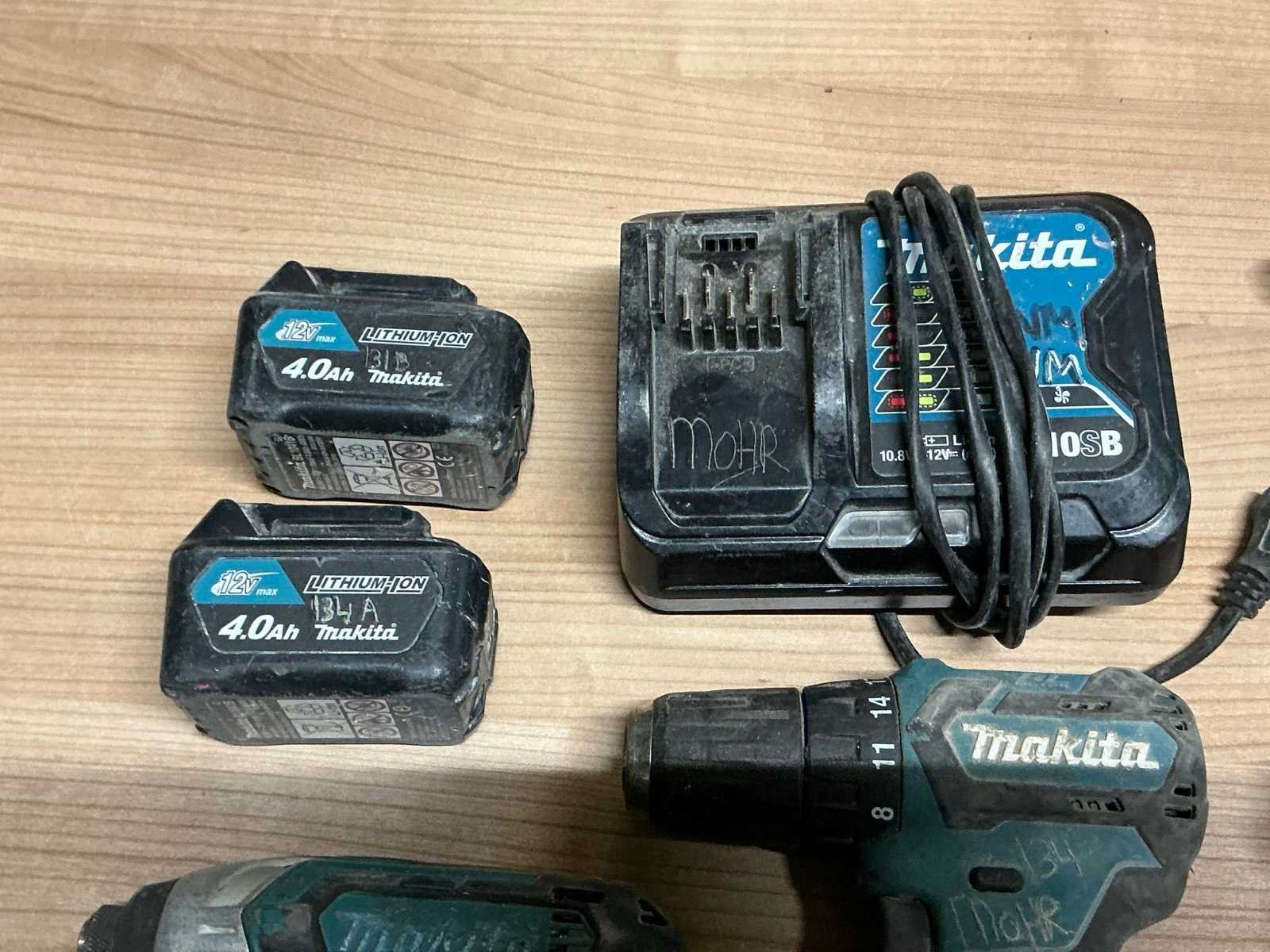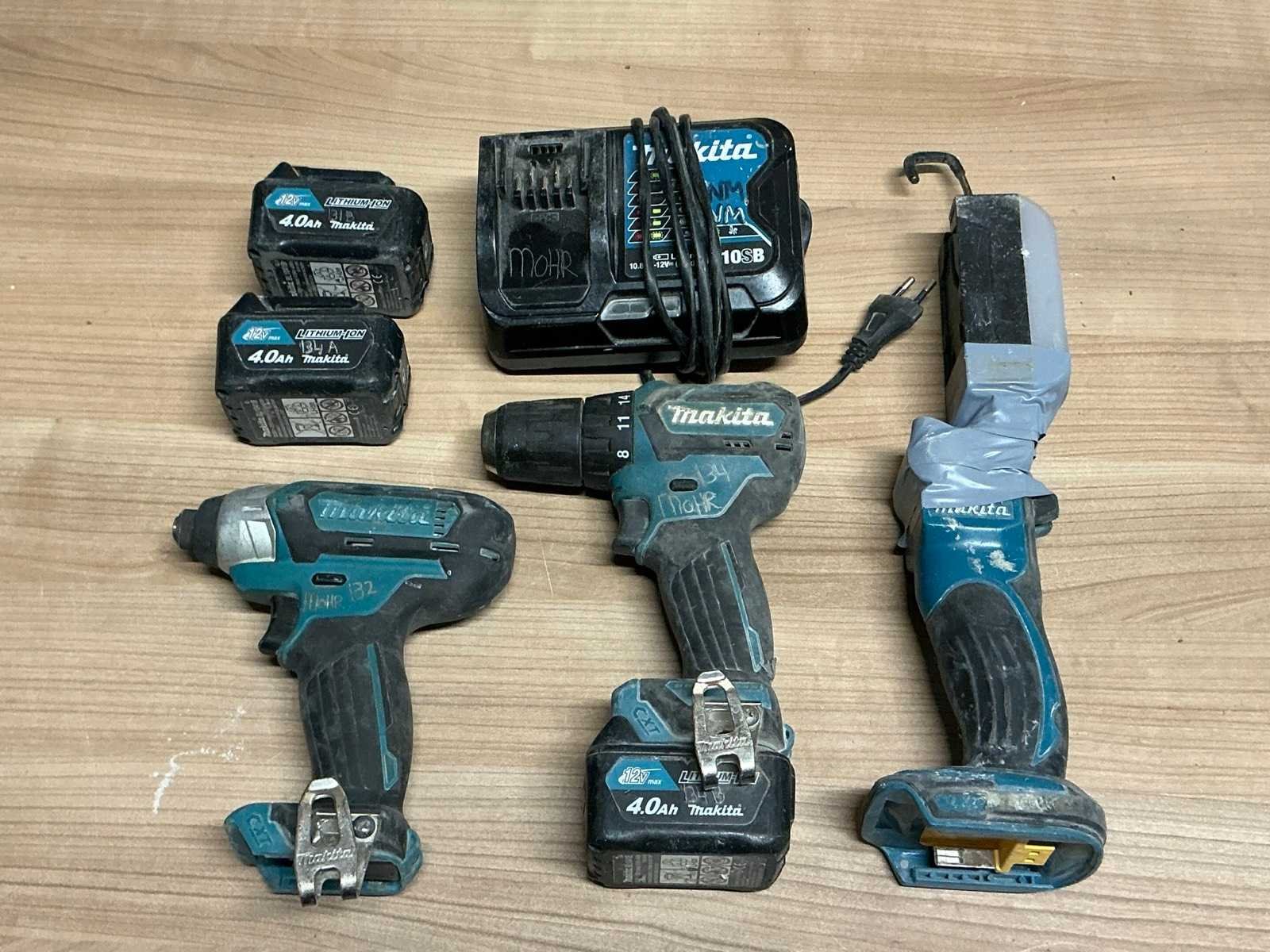 Bestaande uit: een TD110D slagschroevendraaier, een beschadigde DML801 lamp, een DF332D boormachine, 3 accu’s en een acculader in een koffer. Merk: Makita Accu lader: true Met koffer: true Accuspanning: 12V Aantal accu's: 2