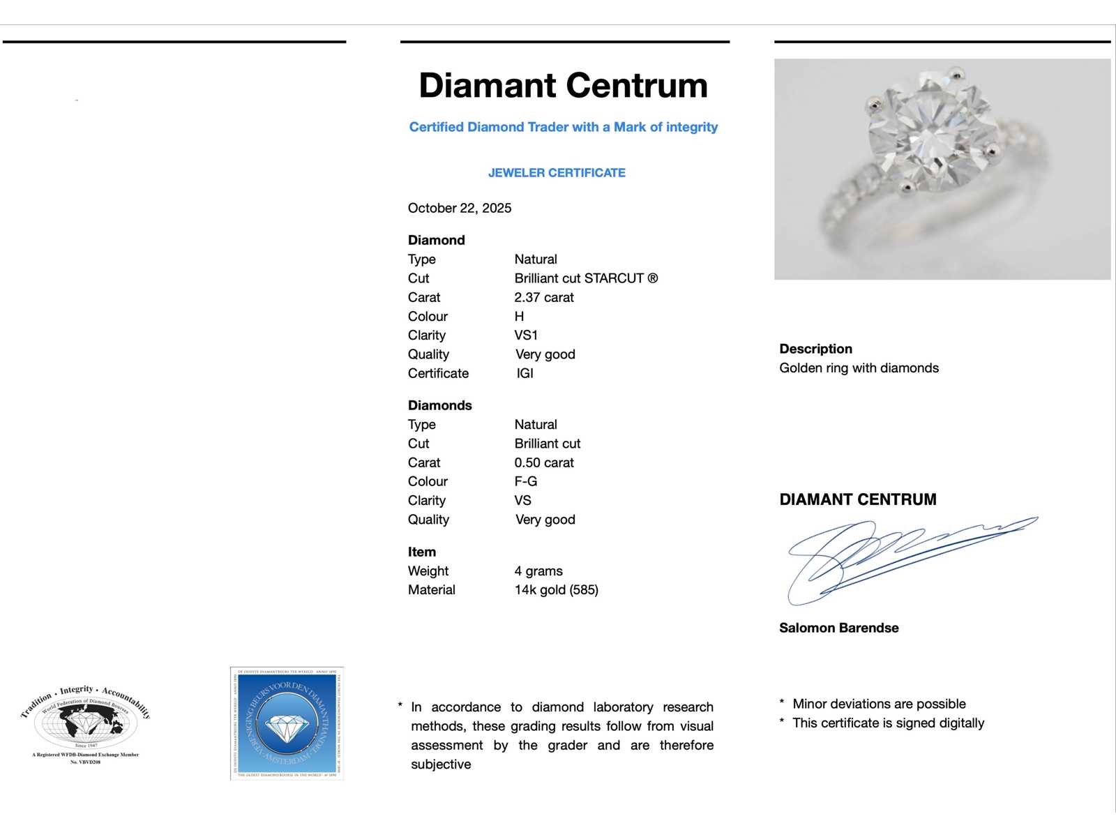 Samenvatting van gegevens Witgouden ring met een briljant geslepen diamant totaal 2.87 carat (gecertificeerd) Diamant: Natuurlijk; Aantal: 1 stuk; Slijpvorm: Briljant geslepen; Gewicht (carat): 2.37 carat; Kleur: H; Zuiverheid: VS1; Slijpkwaliteit: Excellent; Certificaat: IGI; Certificaat nummer: 733587210; Extra informatie: Deze diamant is een echte Starcut diamant; Diamant (secundair): Diamanten; Aantal diamanten: 12 stuks; Slijpvorm: Briljant geslepen; Gewicht (carat): 0.50 carat; Kleur: F-G; Zuiverheid: VS; Slijpkwaliteit: Zeer mooi; Juweel: Ring; Gewicht: 4 gram; Ringmaat (op maat gemaakt*): 53 (17 mm); Materiaal: 18k goud (750); Conditie: Nieuw; Verpakking: Luxe sieradendoos; Toelichting: De kwaliteit is overgenomen van het rapport behorend bij item. De waardebepaling is een beoordeling van een gecertificeerde diamantair, gebaseerd op consumentenprijzen.; Consumentenprijs: € 93.000,- Within 14 days Materiaal: Goud Voornaamste diamant: Natuurlijk Gewicht diamant: 2.37ct Totaal gewicht: 4g Keurmerk: 750 Certificaat: IGI Kleur diamant: H Slijpvorm diamant: Briljant geslepen Slijpkwaliteit diamant: Excellent Zuiverheidsgraad diamant: VS1