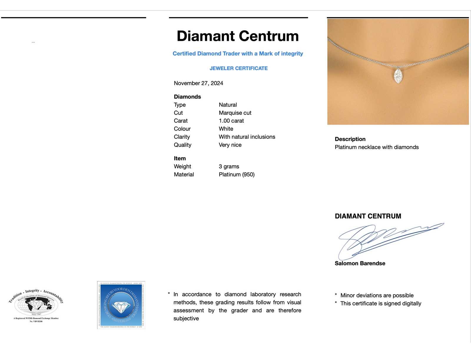 Samenvatting van gegevens Platina halsketting met een grote natuurlijke marquise geslepen diamant Diamant: Natuurlijk; Aantal: 1 stuk; Slijpvorm: Marquise geslepen; Gewicht (carat): Circa 1.00 carat; Kleur: Wit; Zuiverheid: Met natuurlijke insluitsels; Slijpkwaliteit: Zeer mooi; Extra informatie: Lazer enhanced; Juweel: Halsketting; Gewicht: 3 gram; Afmetingen/lengte: 46.5 cm; Materiaal: Platina (950); Conditie: Zo goed als nieuw; Verpakking: Luxe sieradendoos; Toelichting: De kwaliteit is overgenomen van het rapport behorend bij item. De waardebepaling is een beoordeling van een gecertificeerde diamantair, gebaseerd op consumentenprijzen.; Consumentenprijs: € 10.000,- Within 14 days Materiaal: Platina Voornaamste diamant: Natuurlijk Kleur diamant: Wit Slijpvorm diamant: Marquise geslepen Slijpkwaliteit diamant: Zeer mooi Zuiverheidsgraad diamant: Met natuurlijke insluitsels Totaal gewicht: 3g Keurmerk: 950