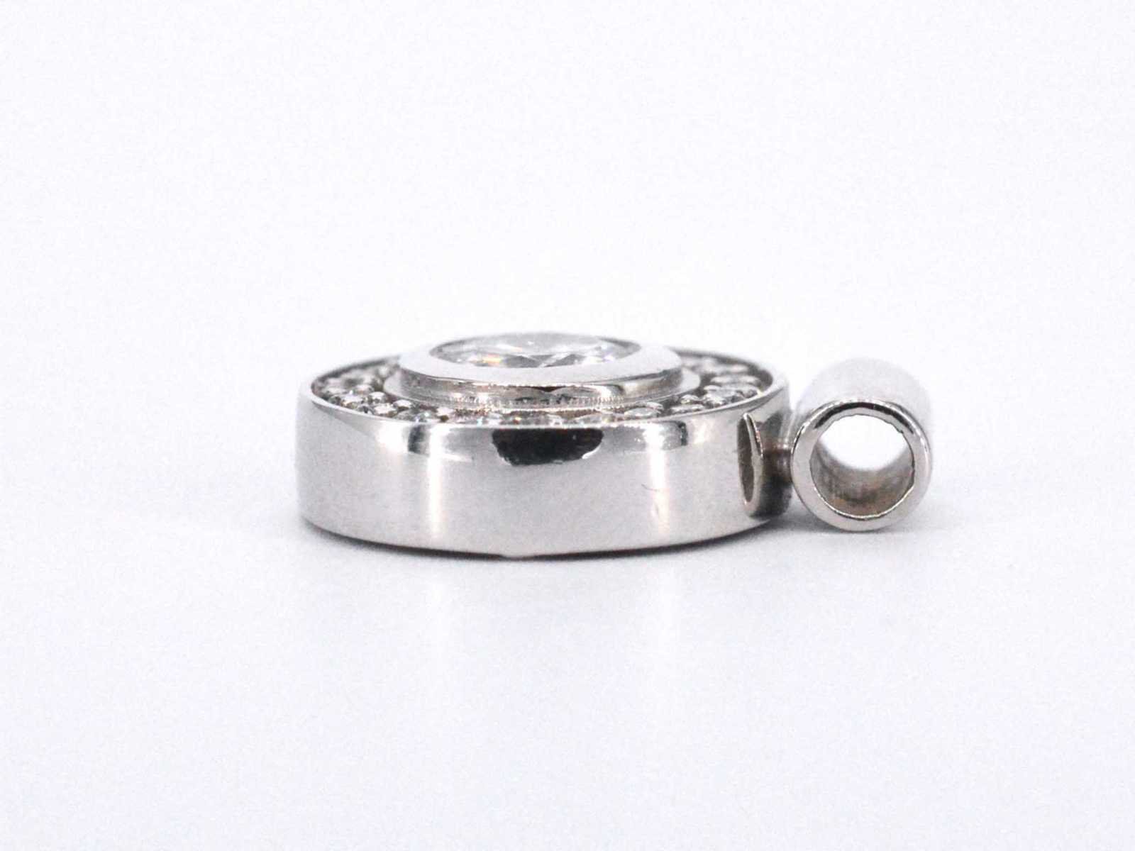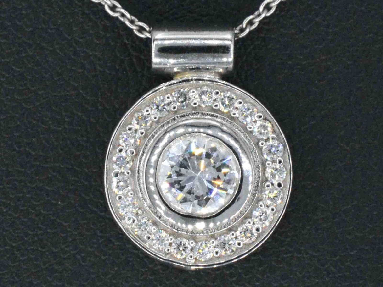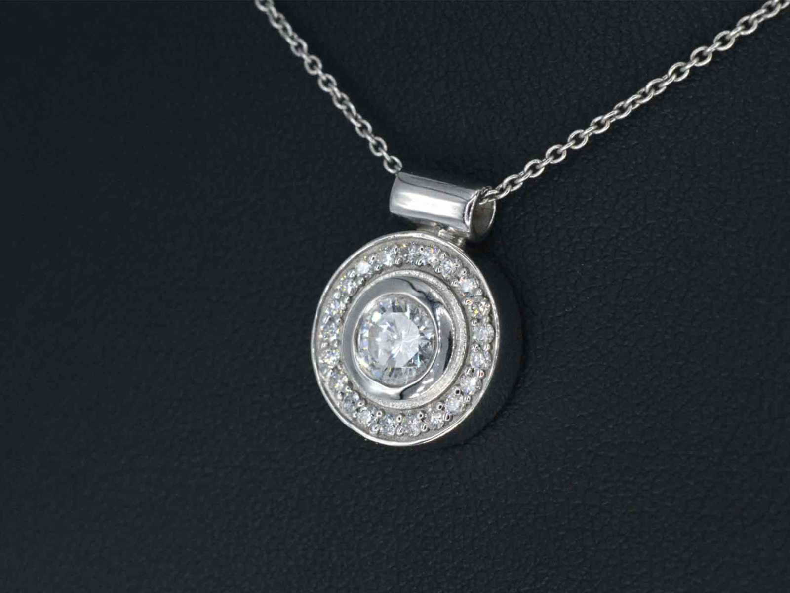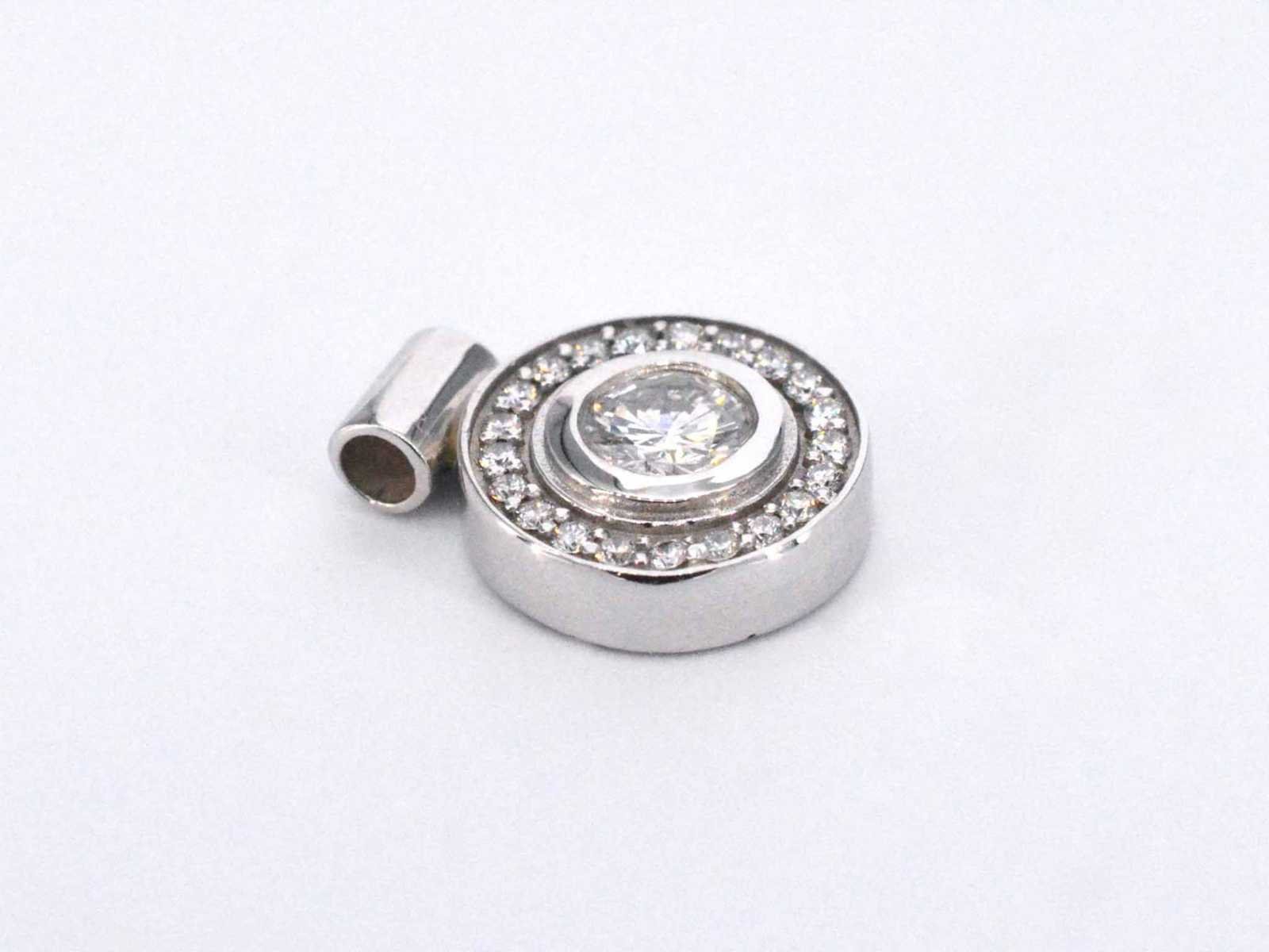 Samenvatting van gegevens Witgouden hanger met briljant geslepen diamanten Diamant: Natuurlijk; Aantal: 1 stuk; Slijpvorm: Briljant geslepen; Gewicht (carat): 0.70 carat; Kleur: F-G; Zuiverheid: VS-SI; Slijpkwaliteit: Zeer mooi; Diamant (secundair): Diamanten; Aantal diamanten: 21 stuks; Slijpvorm: Briljant geslepen; Gewicht (carat): 0.20 carat; Kleur: F-G; Zuiverheid: VS-SI; Slijpkwaliteit: Zeer mooi; Juweel: Hanger (excl. ketting); Gewicht: 3.5 gram; Materiaal: 14K goud (585); Conditie: Vintage; Verpakking: Luxe sieradendoos; Toelichting: De kwaliteit is overgenomen van het rapport behorend bij item. De waardebepaling is een beoordeling van een gecertificeerde diamantair, gebaseerd op consumentenprijzen.; Consumentenprijs: € 10.800,- Within 14 days Materiaal: Goud Voornaamste diamant: Natuurlijk Kleur diamant: F-G Gewicht diamant: 0.70ct Slijpvorm diamant: Briljant geslepen Slijpkwaliteit diamant: Zeer mooi Zuiverheidsgraad diamant: VS-SI Totaal gewicht: 3.5g Keurmerk: 585