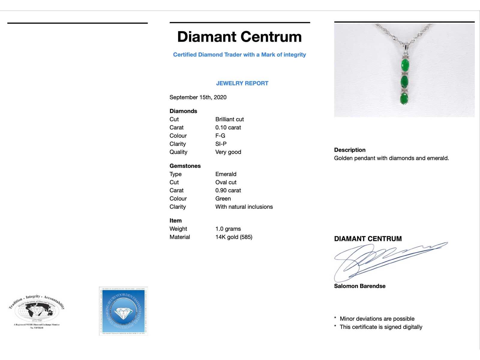 Samenvatting van gegevens Witgouden hanger met diamanten en smaragd Diamant: Natuurlijk; Slijpvorm: Briljant geslepen; Gewicht (carat): 0.10 carat; Kleur: F-G; Zuiverheid: SI-P; Slijpkwaliteit: Zeer mooi; Edelsteen: Smaragd; Slijpvorm: Ovaal geslepen; Gewicht (carat): 0.75 carat; Juweel: Hanger (excl. ketting); Gewicht: 1 gram; Materiaal: 14 karaat (585); Conditie: Nieuw; Verpakking: Luxe sieradendoos; Toelichting: De kwaliteit is overgenomen van het rapport behorend bij item. De waardebepaling is een beoordeling van een gecertificeerde diamantair, gebaseerd op consumentenprijzen.; Consumentenprijs: € 700,- Within 14 days Voornaamste diamant: Natuurlijk Kleur diamant: F-G Gewicht diamant: 0.10ct Slijpvorm diamant: Briljant geslepen Slijpkwaliteit diamant: Zeer mooi Zuiverheidsgraad diamant: SI-P Edelsteen: Smaragd Slijpvorm edelsteen: Ovaal geslepen Totaal gewicht: 1g Keurmerk: 585