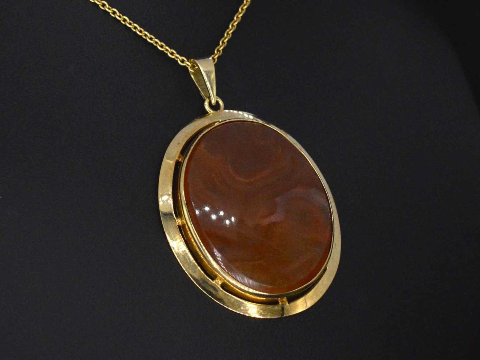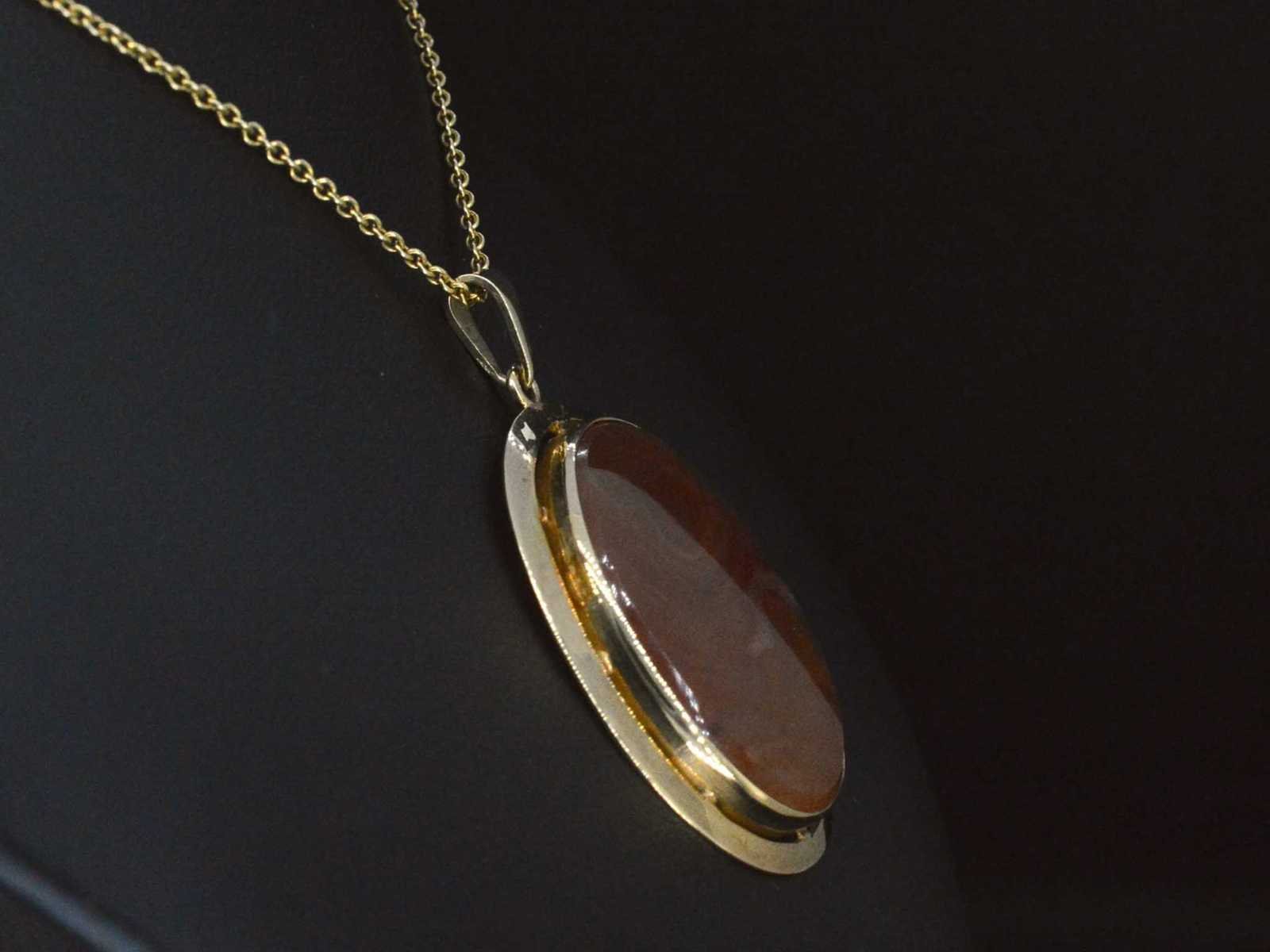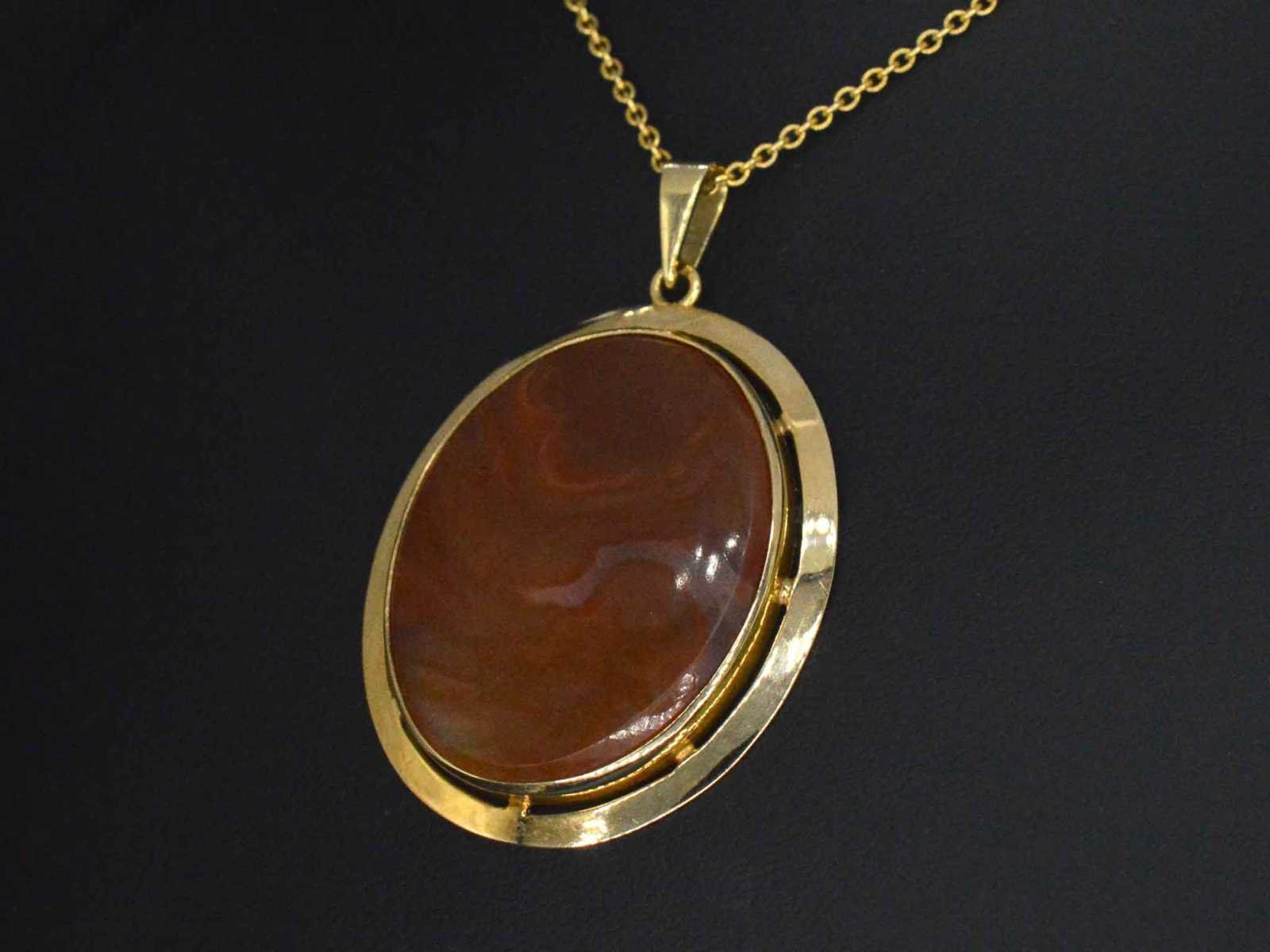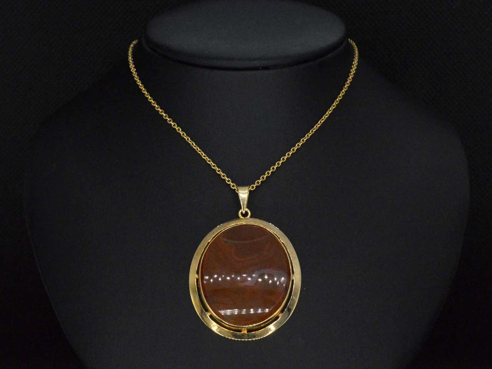 Samenvatting van gegevens Gouden hanger met edelsteen Edelsteen: Natuurlijke edelsteen; Slijpvorm: Cabochon; Gewicht (carat): 20.00 carat; Kleur: Gemarmerd oranje/bruin; Zuiverheid: Licht doorlatend; Juweel: Hanger (excl. ketting); Gewicht: 10.3 gram; Materiaal: 14k goud (585); Conditie: Vintage; Verpakking: Luxe sieradendoos; Toelichting: De kwaliteit is overgenomen van het rapport behorend bij item. De waardebepaling is een beoordeling van een gecertificeerde diamantair, gebaseerd op consumentenprijzen.; Consumentenprijs: € 3.850,- Within 14 days Materiaal: Goud Edelsteen: Natuurlijke edelsteen Kleur edelsteen: Gemarmerd oranje/bruin Slijpvorm edelsteen: Cabochon Zuiverheidsgraad edelsteen: Licht doorlatend Totaal gewicht: 10.3g Keurmerk: 585