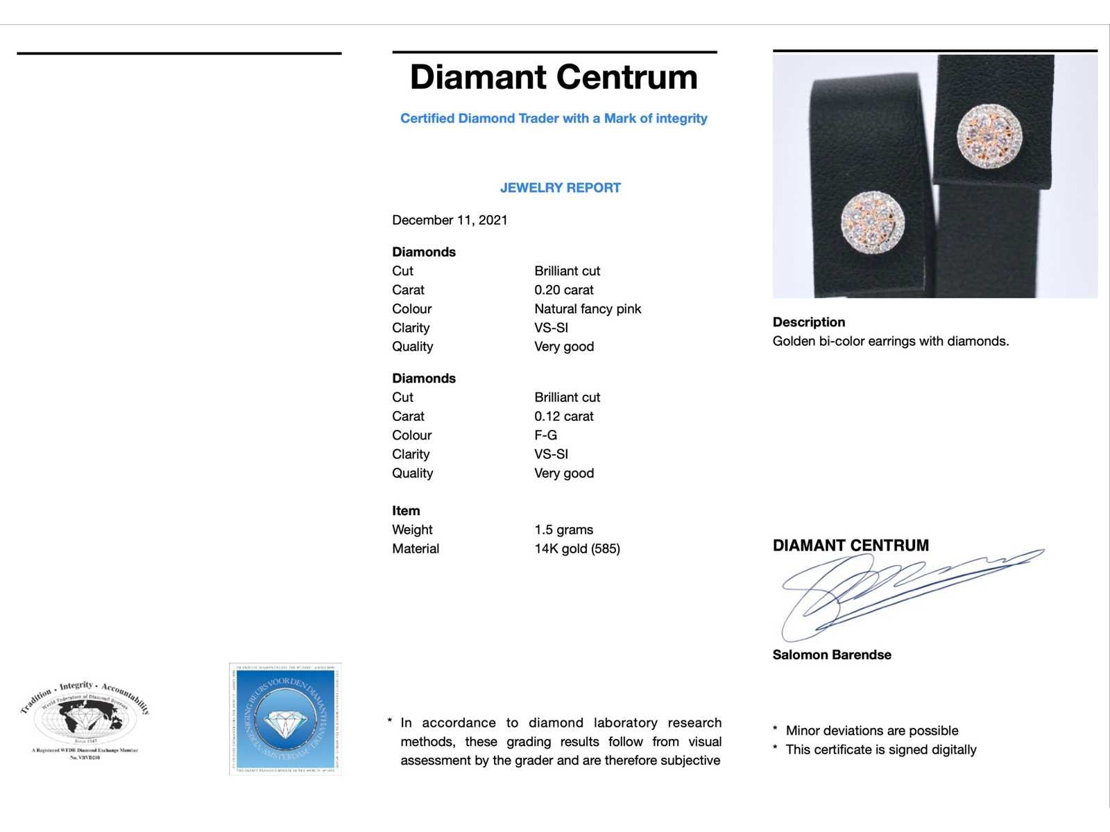 Samenvatting van gegevens Witgouden oorbellen met natuurlijke roze en witte diamant Diamant: Natuurlijk; Aantal: 14 stuks; Slijpvorm: Briljant geslepen; Gewicht (carat): 0.20 carat; Kleur: Natuurlijke fancy roze; Zuiverheid: VS-SI; Slijpkwaliteit: Zeer mooi; Diamant (secundair): Witte diamant; Aantal diamanten: 36 stuks; Slijpvorm: Briljant geslepen; Gewicht (carat): 0.12 carat; Kleur: F-G; Zuiverheid: VS-SI; Slijpkwaliteit: Very good; Juweel: Oorbellen; Gewicht: 1.5 gram; Afmetingen/lengte: 6 mm; Materiaal: 14k goud (585); Conditie: Nieuw; Verpakking: Luxe sieradendoos; Toelichting: De kwaliteit is overgenomen van het rapport behorend bij item. De waardebepaling is een beoordeling van een gecertificeerde diamantair, gebaseerd op consumentenprijzen.; Consumentenprijs: € 2.310,- Within 14 days Materiaal: Goud Voornaamste diamant: Natuurlijk Kleur diamant: Natuurlijke fancy roze Gewicht diamant: 0.20ct Slijpvorm diamant: Briljant geslepen Slijpkwaliteit diamant: Zeer mooi Zuiverheidsgraad diamant: VS-SI Totaal gewicht: 1.5g Keurmerk: 585