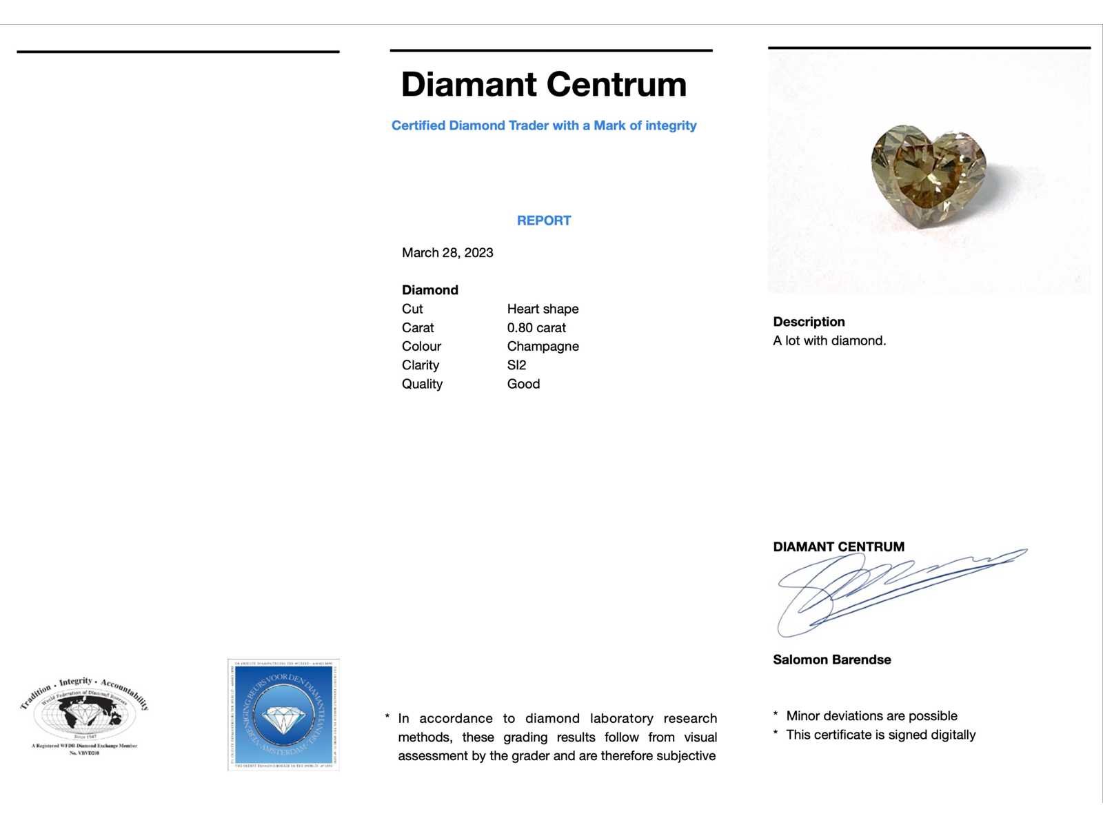Samenvatting van gegevens Diamant - 0.80 carat echte diamant (gecertificeerd) Diamant: Natuurlijk; Aantal: 1 stuk; Slijpvorm: Hart vorm geslepen; Gewicht (carat): 0.80 carat; Kleur: Champagne; Zuiverheid: SI2; Slijpkwaliteit: Mooi; Conditie: Nieuw; Verpakking: Edelsteendoos; Toelichting: De kwaliteit is overgenomen van het rapport behorend bij item. De waardebepaling is een beoordeling van een gecertificeerde diamantair, gebaseerd op consumentenprijzen.; Consumentenprijs: € 2.400,- Within 14 days Voornaamste diamant: Natuurlijk Kleur diamant: Champagne Gewicht diamant: 0.80ct Slijpvorm diamant: Hart vorm geslepen Slijpkwaliteit diamant: Mooi Zuiverheidsgraad diamant: SI2