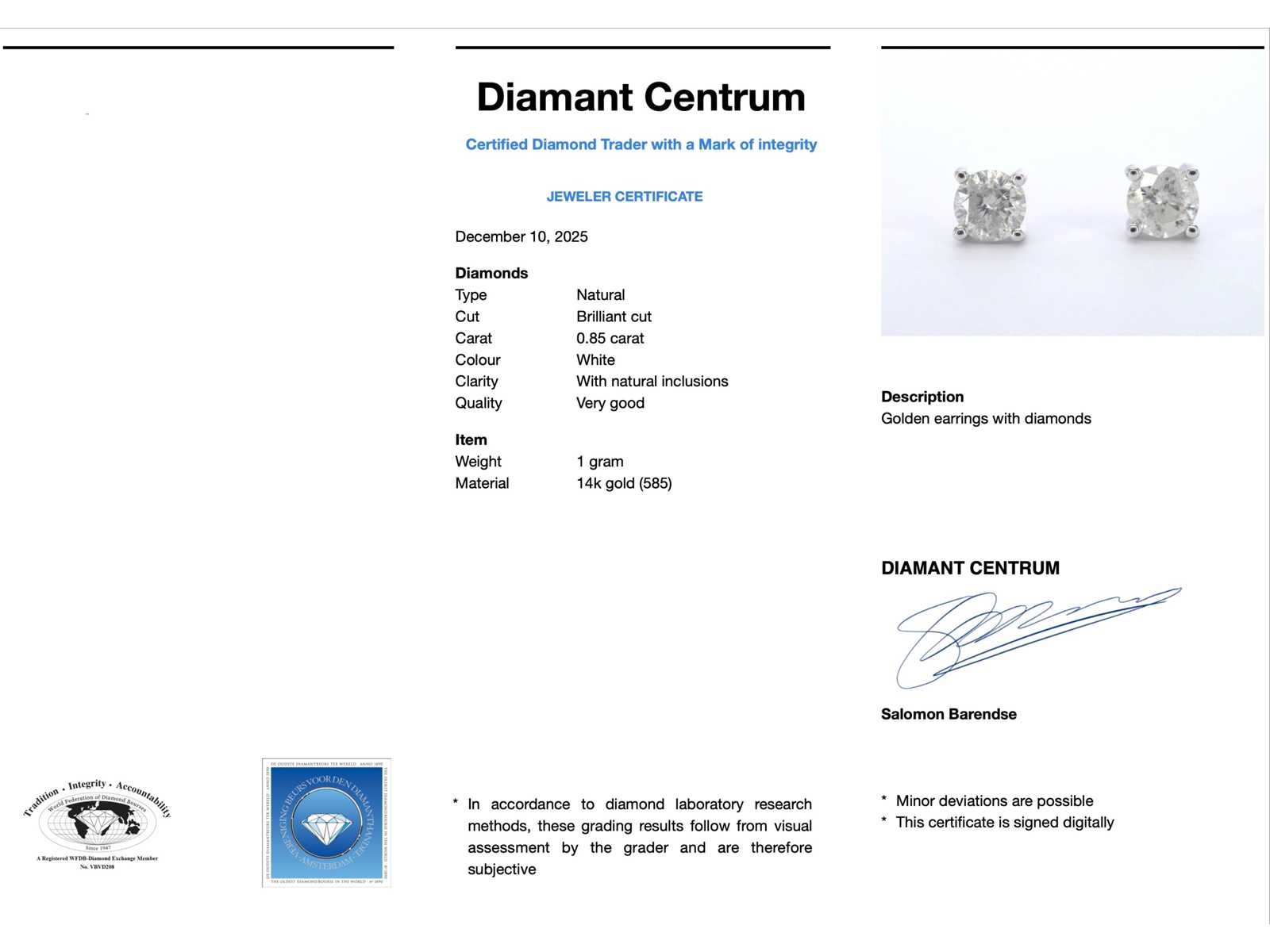 Samenvatting van gegevens Witgouden solitair oorbellen met natuurlijke briljant geslepen diamanten Diamant: Natuurlijk; Aantal: 1 stuk; Slijpvorm: Briljant geslepen; Gewicht (carat): 0.85 carat; Kleur: Wit; Zuiverheid: Met natuurlijke insluitsels; Slijpkwaliteit: Zeer mooi; Juweel: Oorbellen; Gewicht: 1 gram; Materiaal: 14k goud (585); Conditie: Nieuw; Verpakking: Luxe sieradendoos; Toelichting: De kwaliteit is overgenomen van het rapport behorend bij item. De waardebepaling is een beoordeling van een gecertificeerde diamantair, gebaseerd op consumentenprijzen.; Consumentenprijs: € 2.160,- Within 14 days Materiaal: Goud Voornaamste diamant: Natuurlijk Kleur diamant: Wit Gewicht diamant: 0.85ct Slijpvorm diamant: Briljant geslepen Slijpkwaliteit diamant: Zeer mooi Zuiverheidsgraad diamant: Met natuurlijke insluitsels Totaal gewicht: 1g Keurmerk: 585