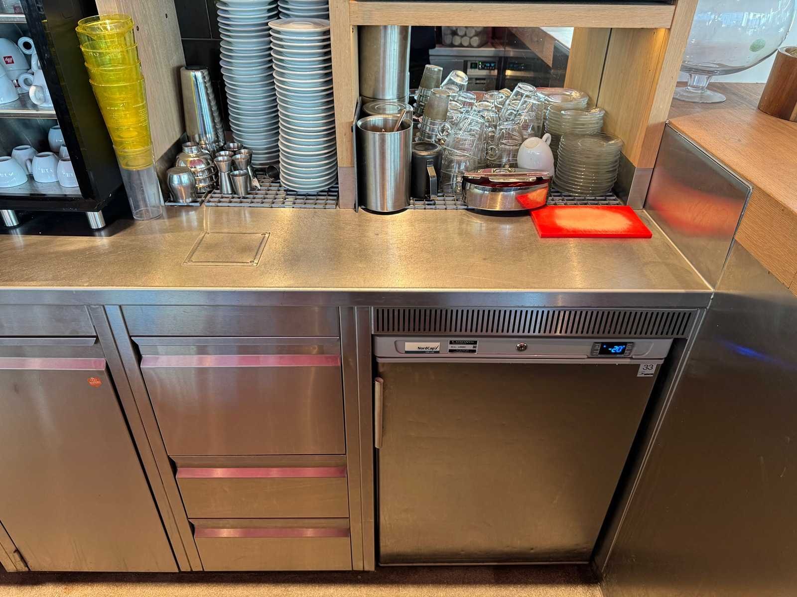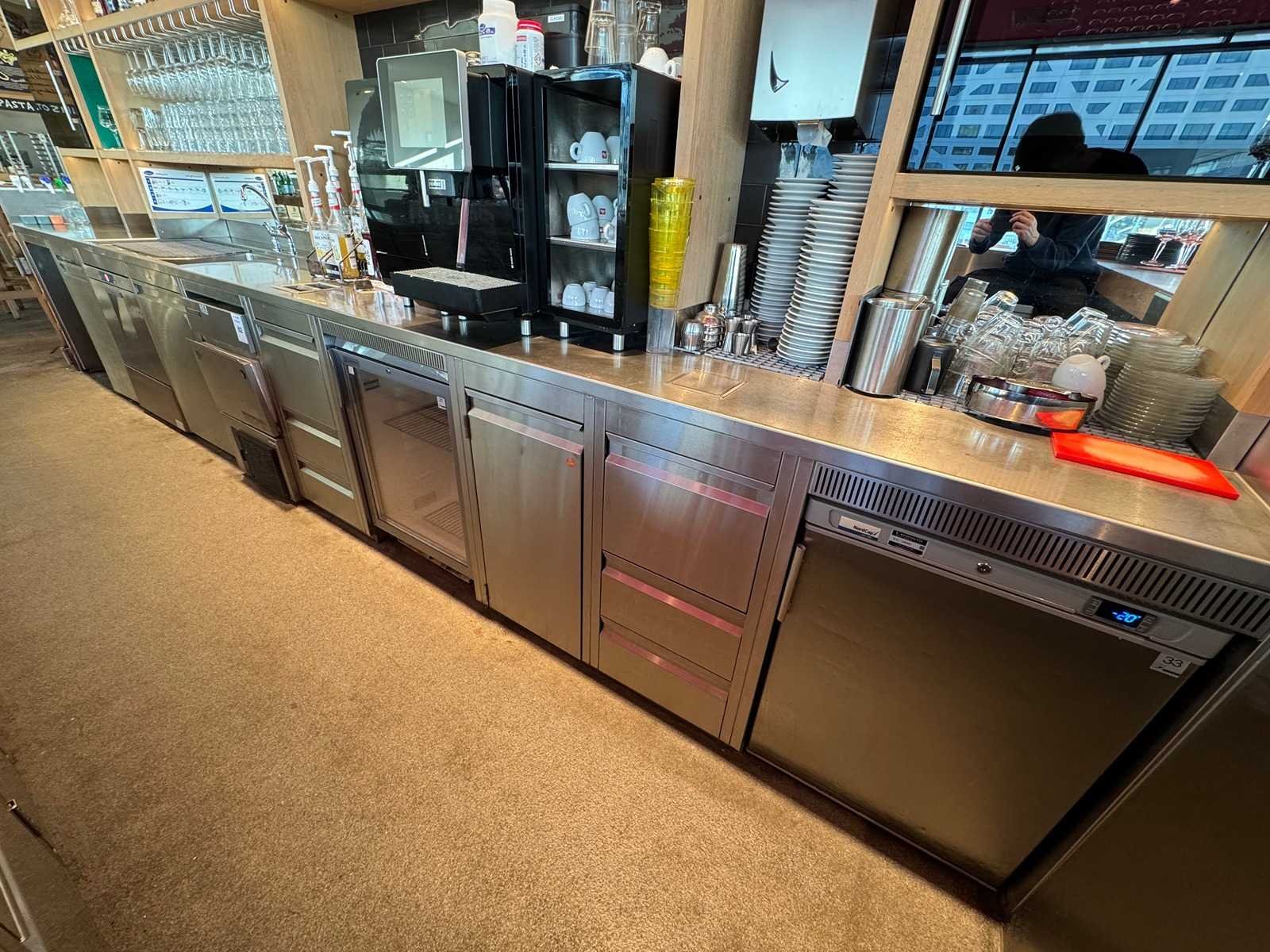 V.v. close-in boiler, uitklopbak, lades, spoelbak. Diepte werkblad: 70 cm. LET OP! Korvenvaatwasmachine, ijsblokjesmachine, glasdeur koelkast, RVS koelkast, koffiemachine en overige inhoud behoren niet tot de kavel. De koper is zelf verantwoordelijk voor het professioneel demonteren van de kavel. Kavel kan aangesloten zijn op het elektra-, water- en/of gasleidingnetwerk. Bekabeling en/of leidingen dienen netjes afgedopt en ordelijk achter gelaten te worden. Schade aan het pand of andere zaken zal op de koper worden verhaald. Wij adviseren u gebruik te maken van de kijkdag om een plan voor demontage op te stellen. Totale afmeting L: 5600mm Totale afmeting Breedte: 7000mm Totale afmeting Hoogte: 2800mm