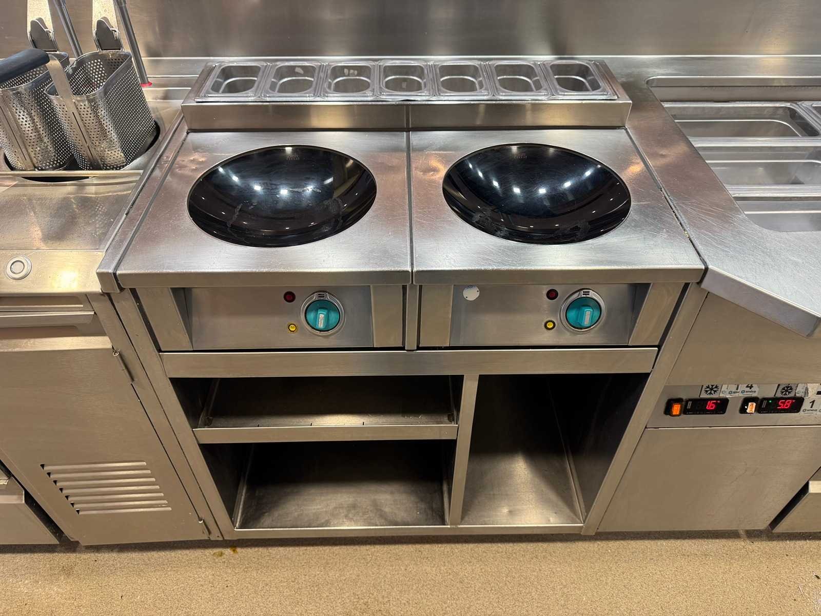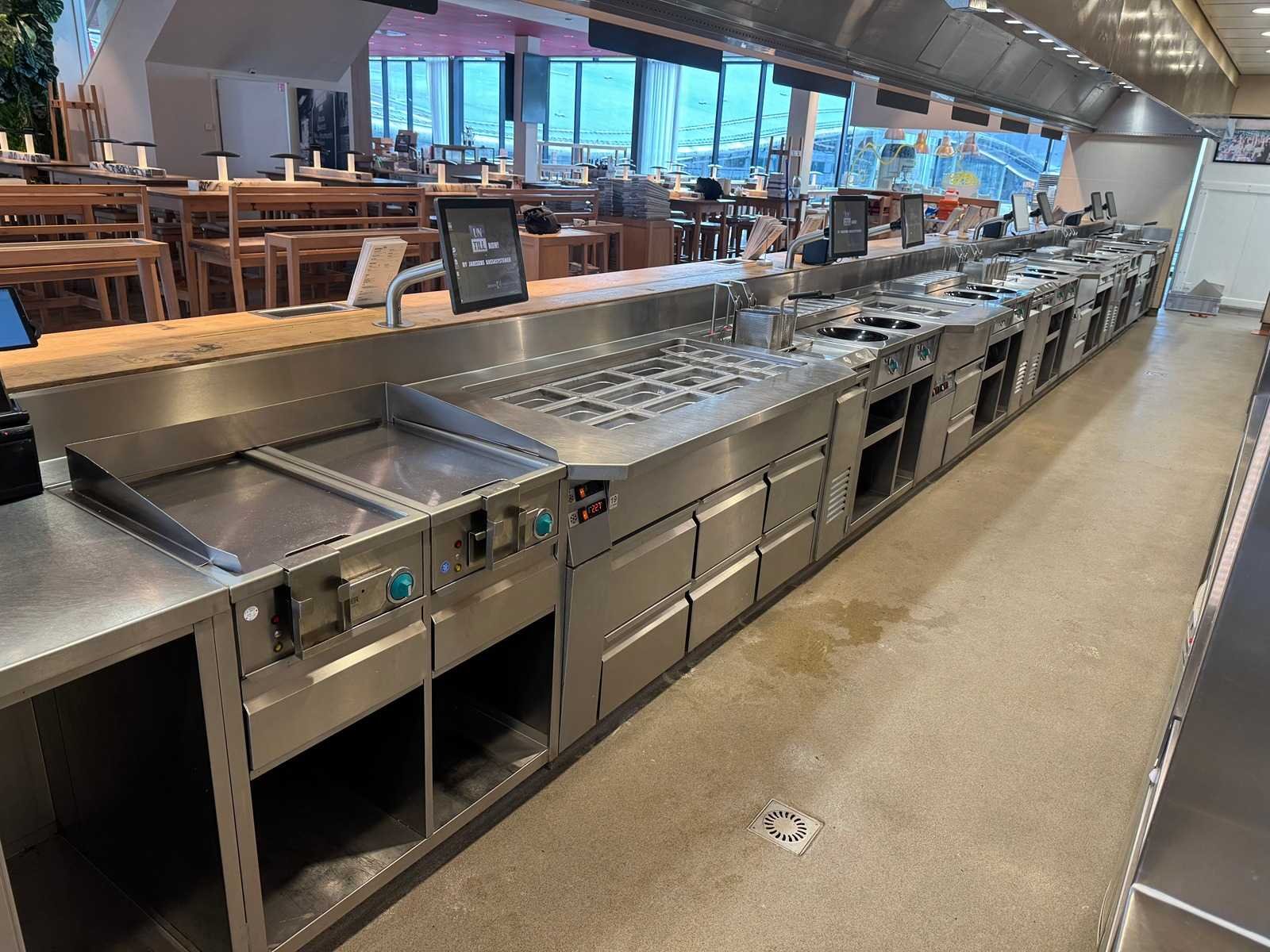 Deze kavel betreft een combinatiekavel van kavels 10 t/m 33; Voor beschrijvingen zie informatie bij desbetreffende kavelnummers. Lijn v.v. 12x inductiewok, 6x pastakoker, koelwerkbanken, saladettes, pizzawerkbank, 2x bakplaat, bordenwarmer exclusief ombouw. LET OP! Kavel betreft een apparaat wat aangesloten is op een centraal koelsysteem. Kavel heeft geen eigen koelcompressor. Het centrale koelsysteem is reeds professioneel leeg gepompt. Hiervoor zijn additionele kosten van toepassing. De koper is zelf verantwoordelijk voor het professioneel demonteren van de kavel. Kavel kan aangesloten zijn op het elektra-, water- en/of gasleidingnetwerk. Bekabeling en/of leidingen dienen netjes afgedopt en ordelijk achter gelaten te worden. Schade aan het pand of andere zaken zal op de koper worden verhaald. Wij adviseren u gebruik te maken van de kijkdag om een plan voor demontage op te stellen. Totale afmeting Breedte: 3500mm Totale afmeting L: 16200mm Totale afmeting Hoogte: 1150mm