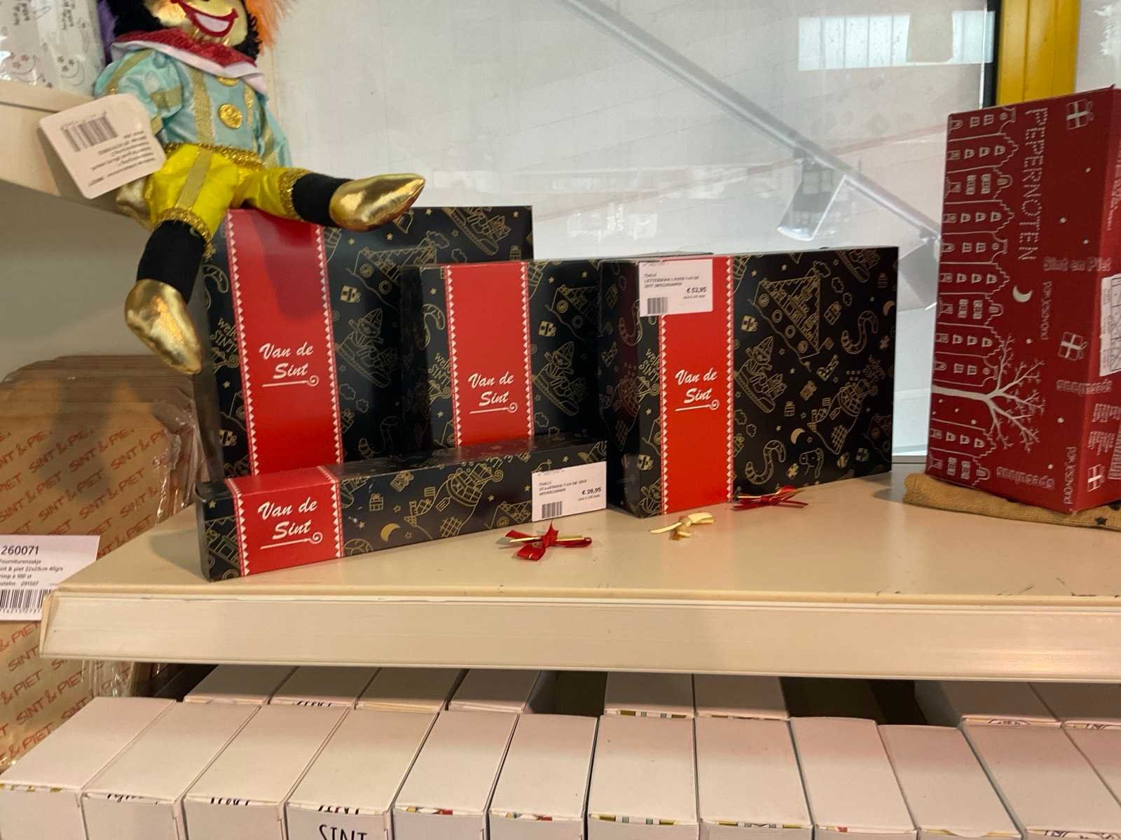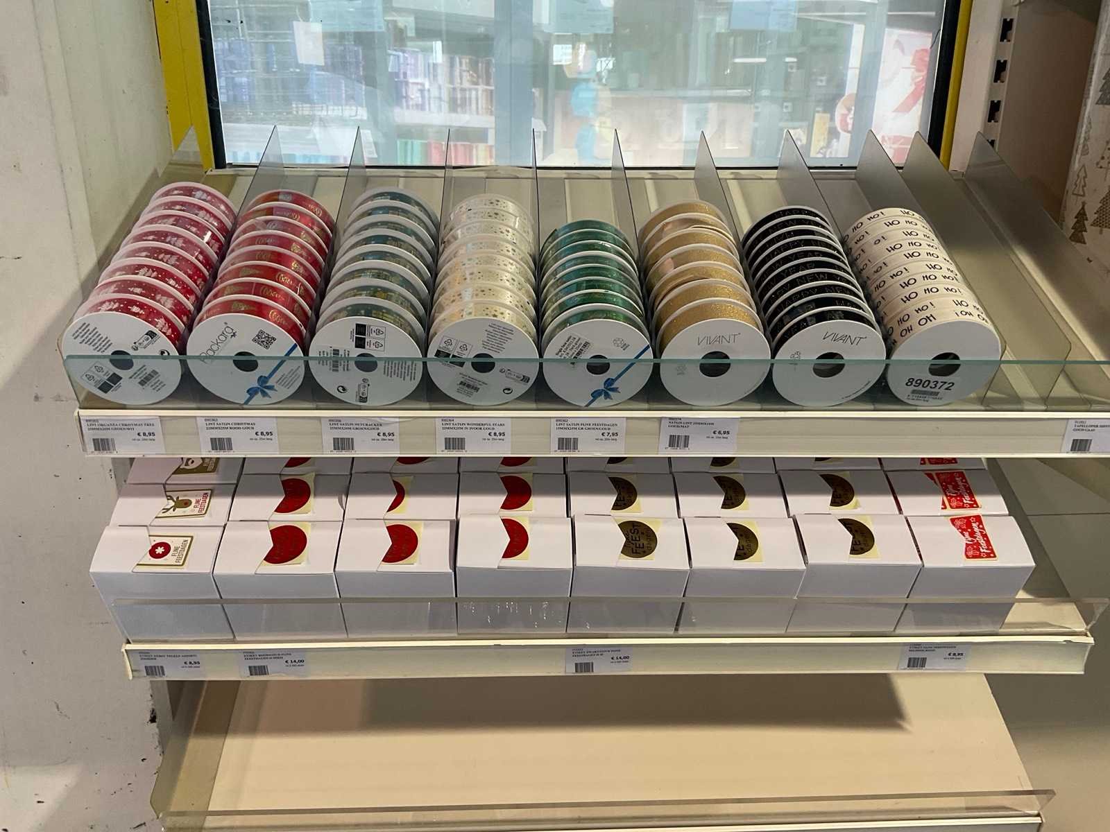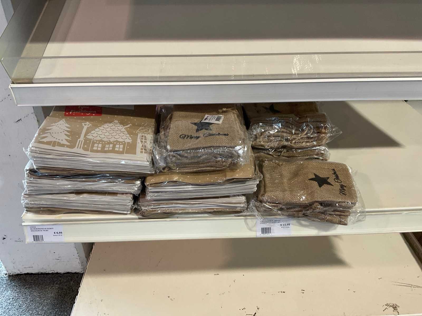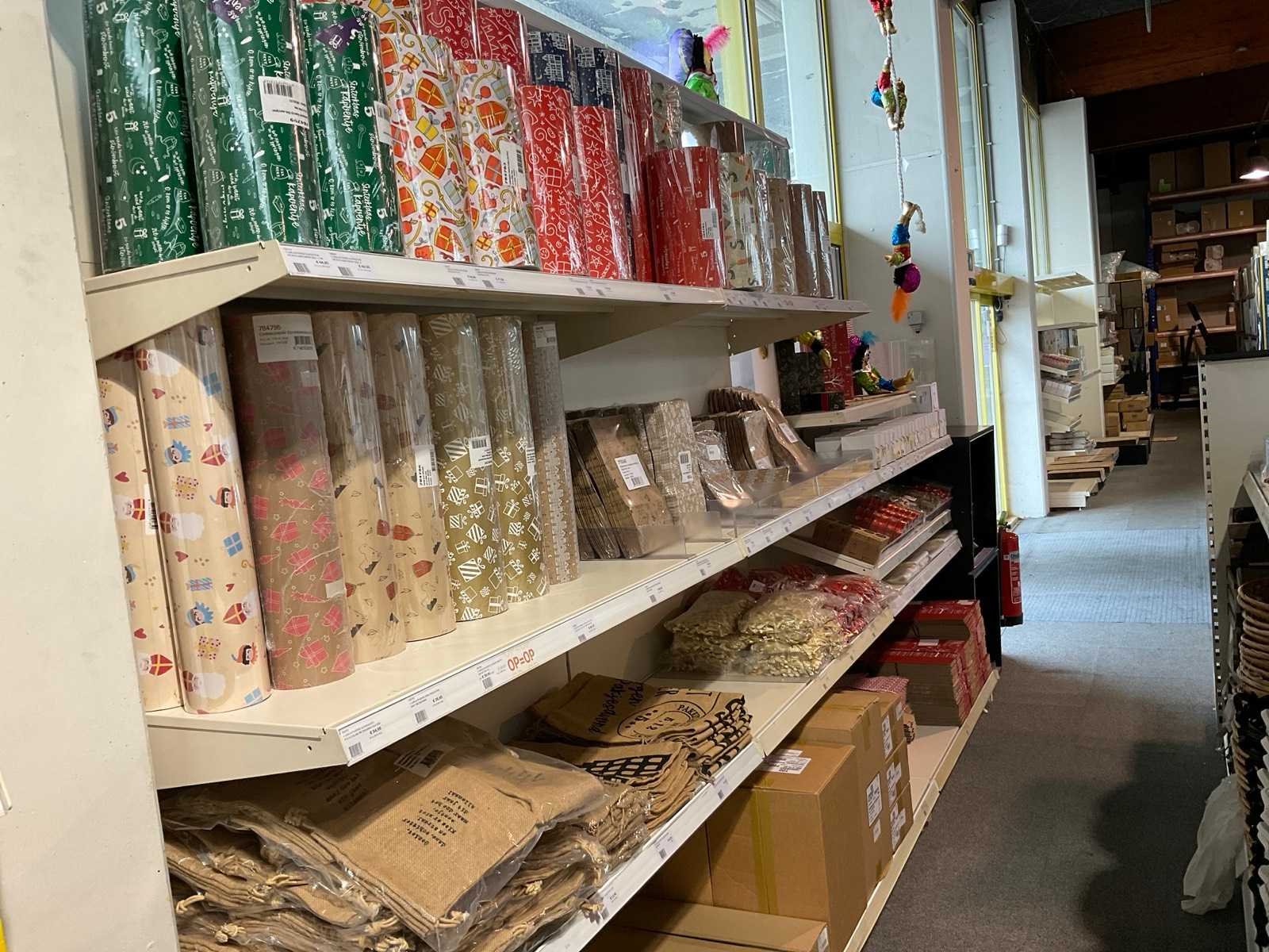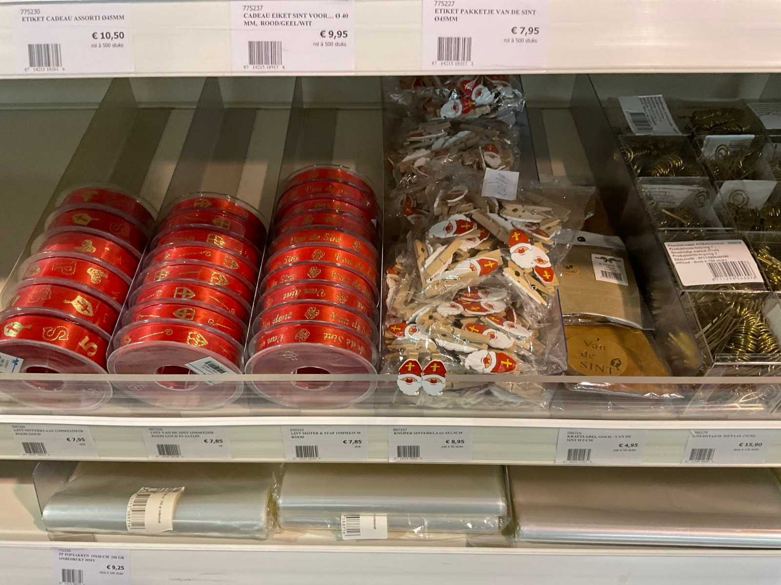 Bestaande uit, stickers, linten, strik op clips, fourniturenzakken, inpakpapier, verpakkingsdozen. Thema kerst en sinterklaas. Exclusief stelling.