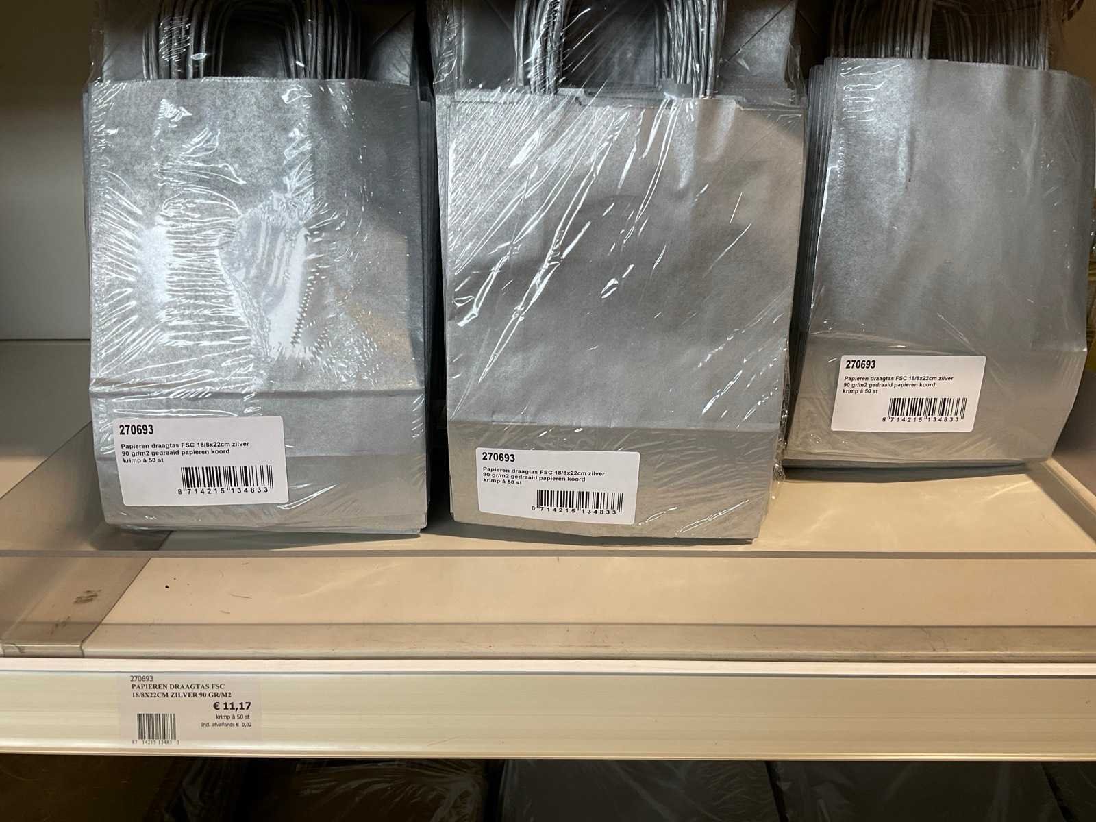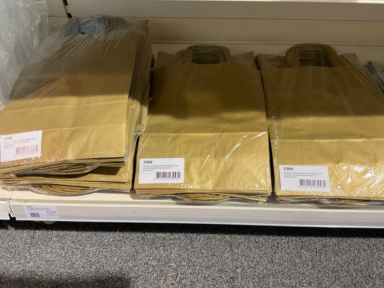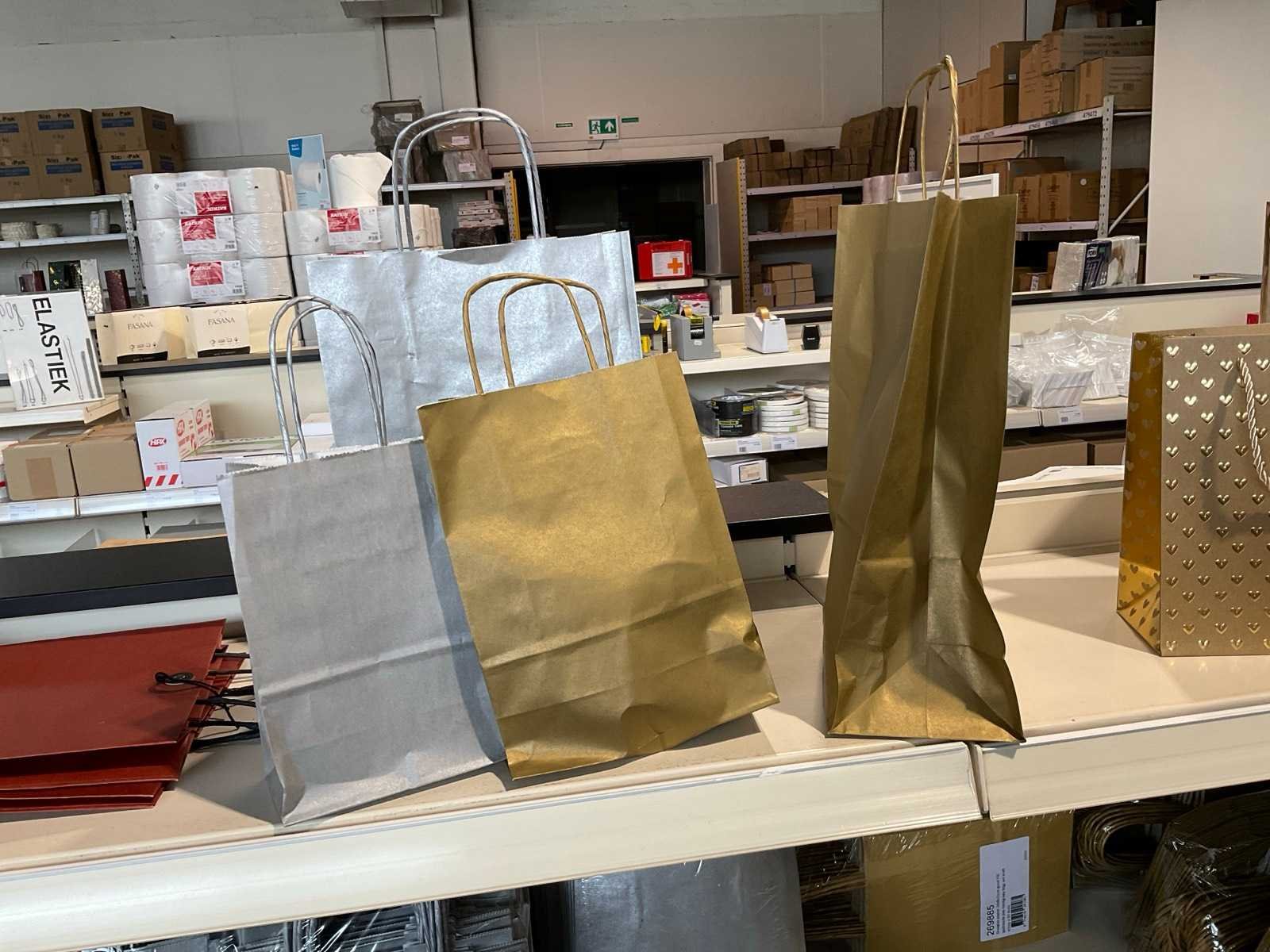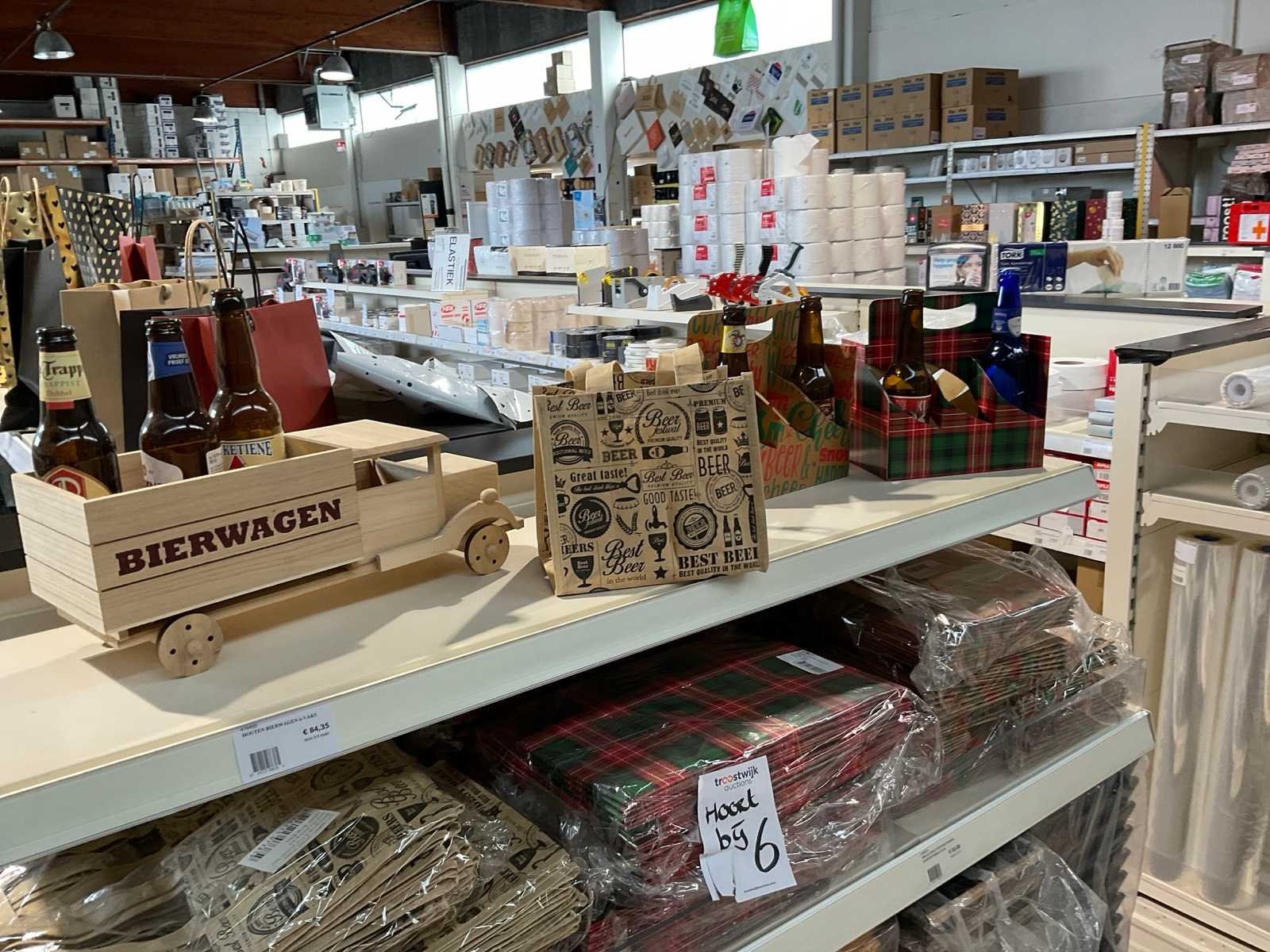 Bestaande uit verschillende soorten en maten papieren draagtassen, biertassen, biertrays, kartonnen biermanden, houten bierwagen. Exclusief stelling.