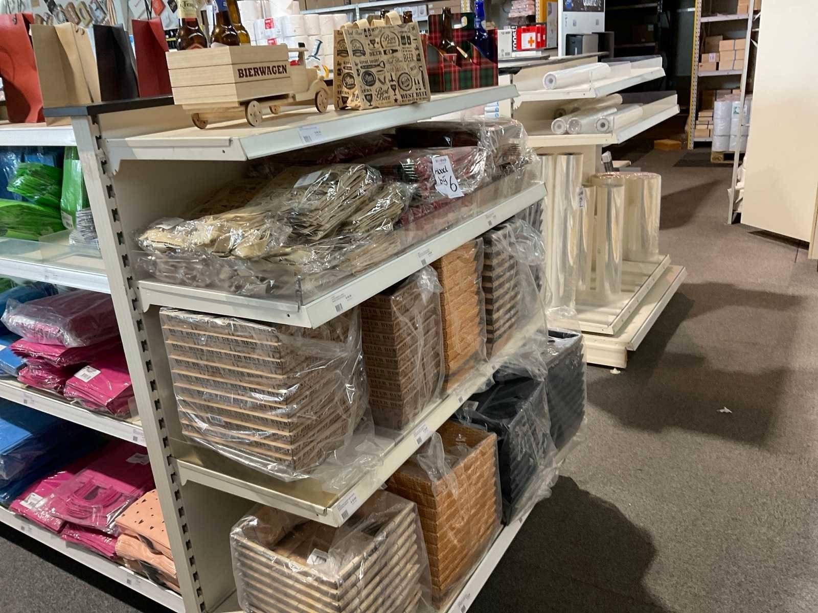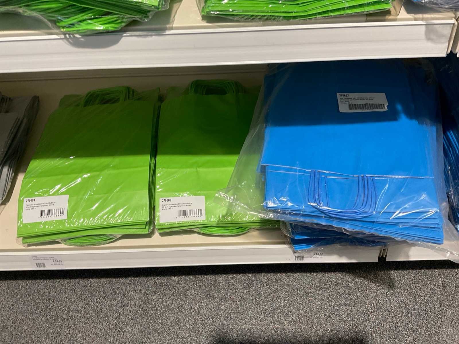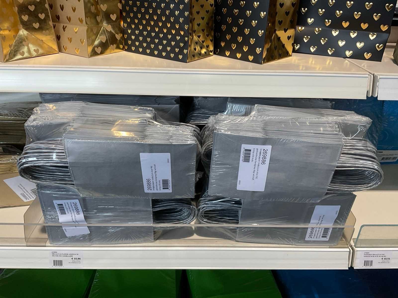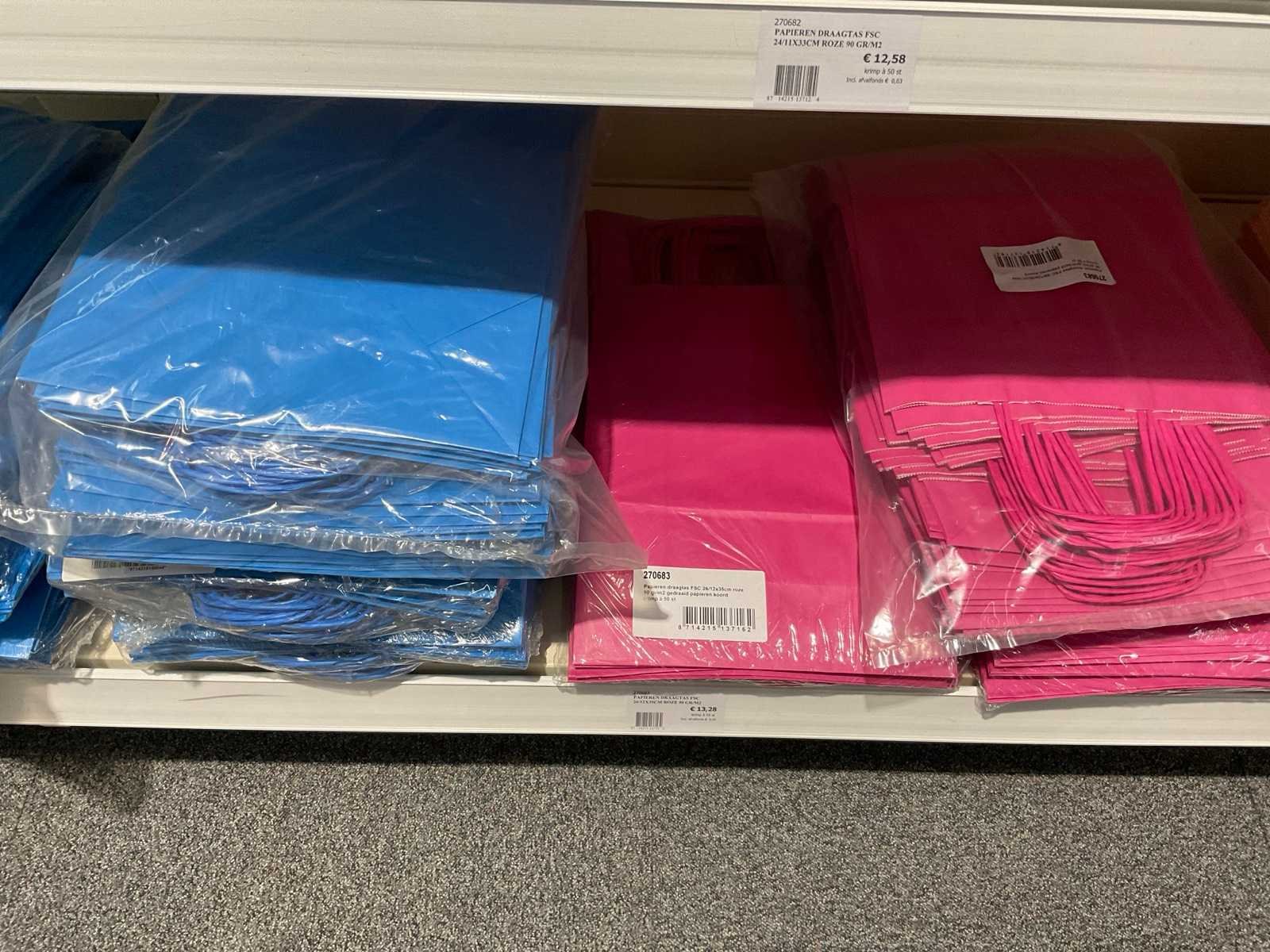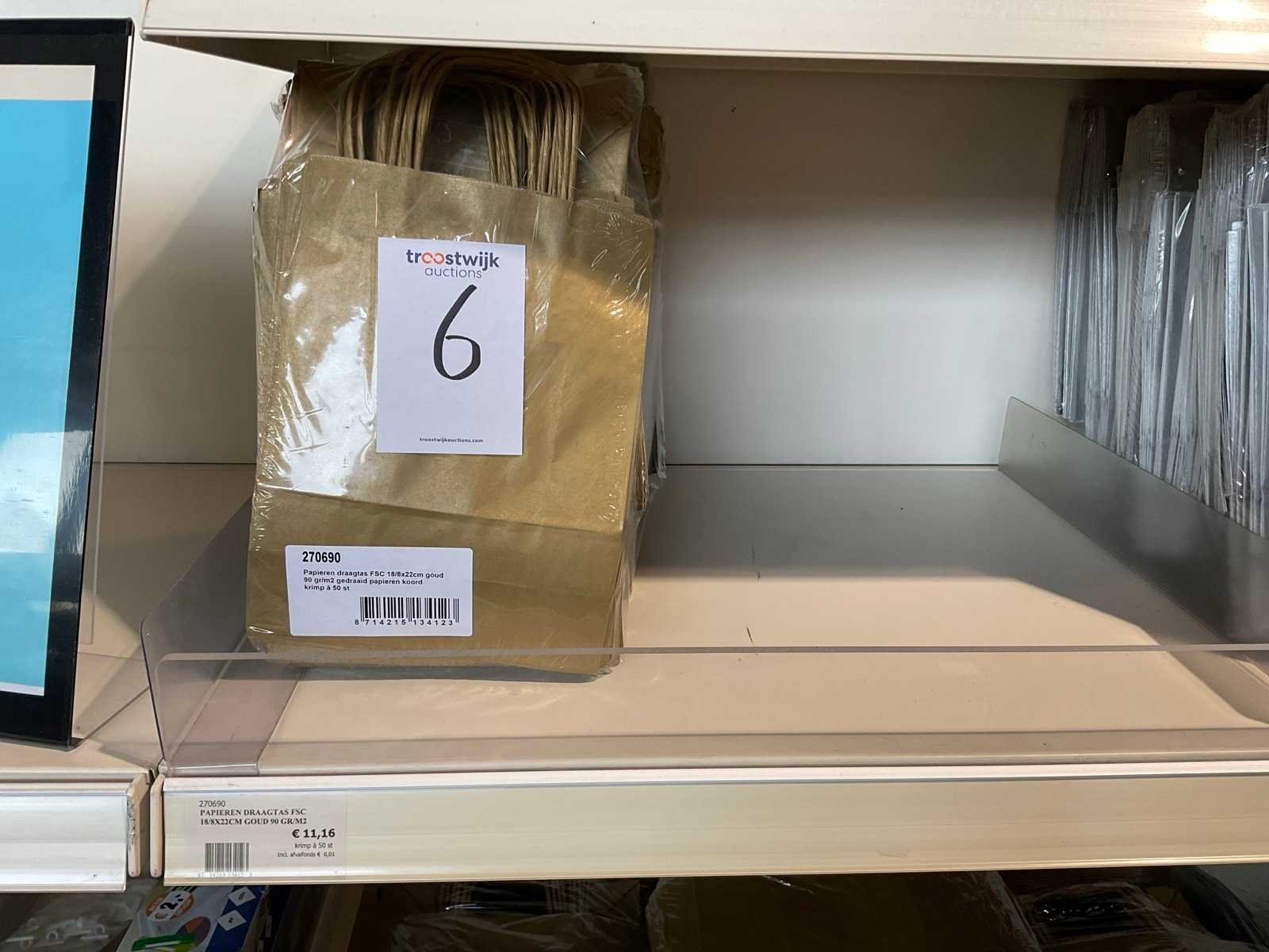 Bestaande uit verschillende soorten en maten papieren draagtassen, biertassen, biertrays, kartonnen biermanden, houten bierwagen. Exclusief stelling.