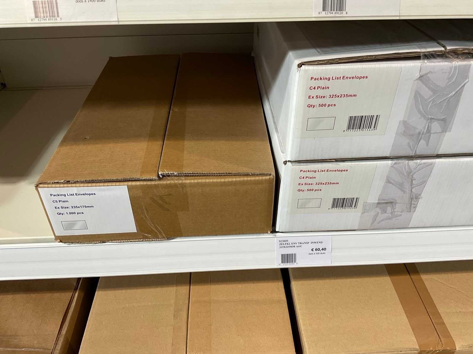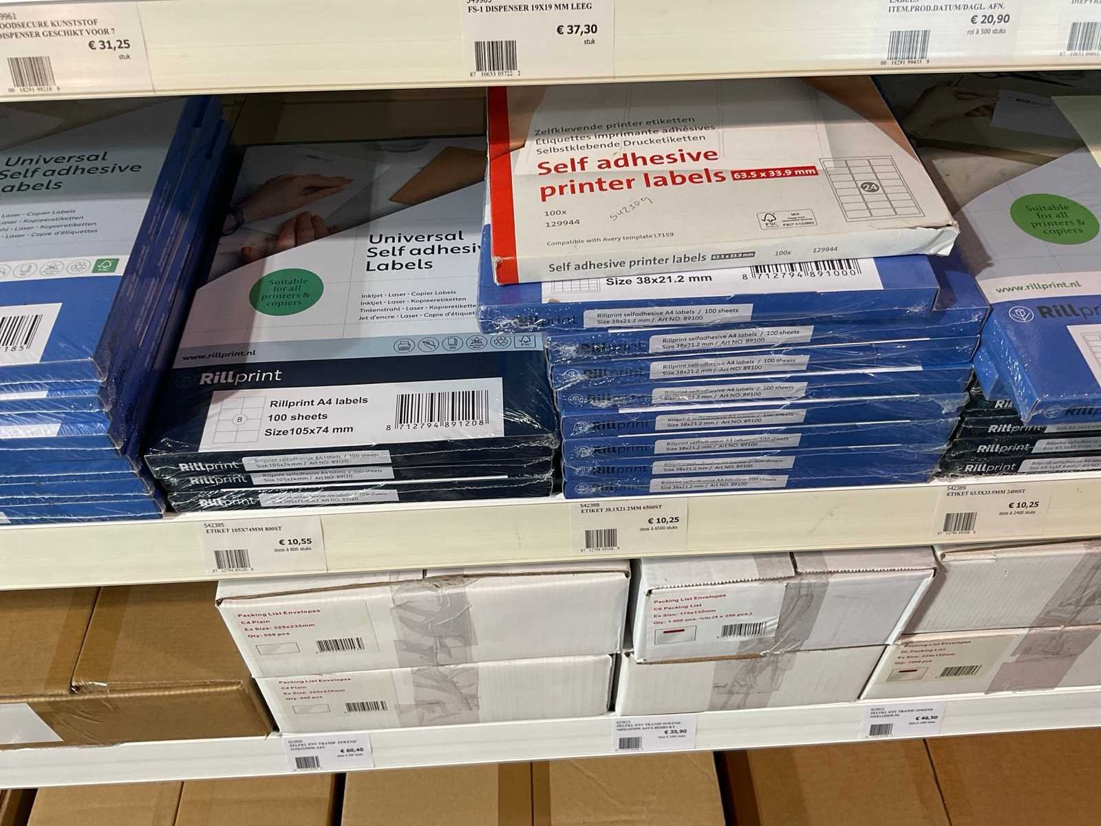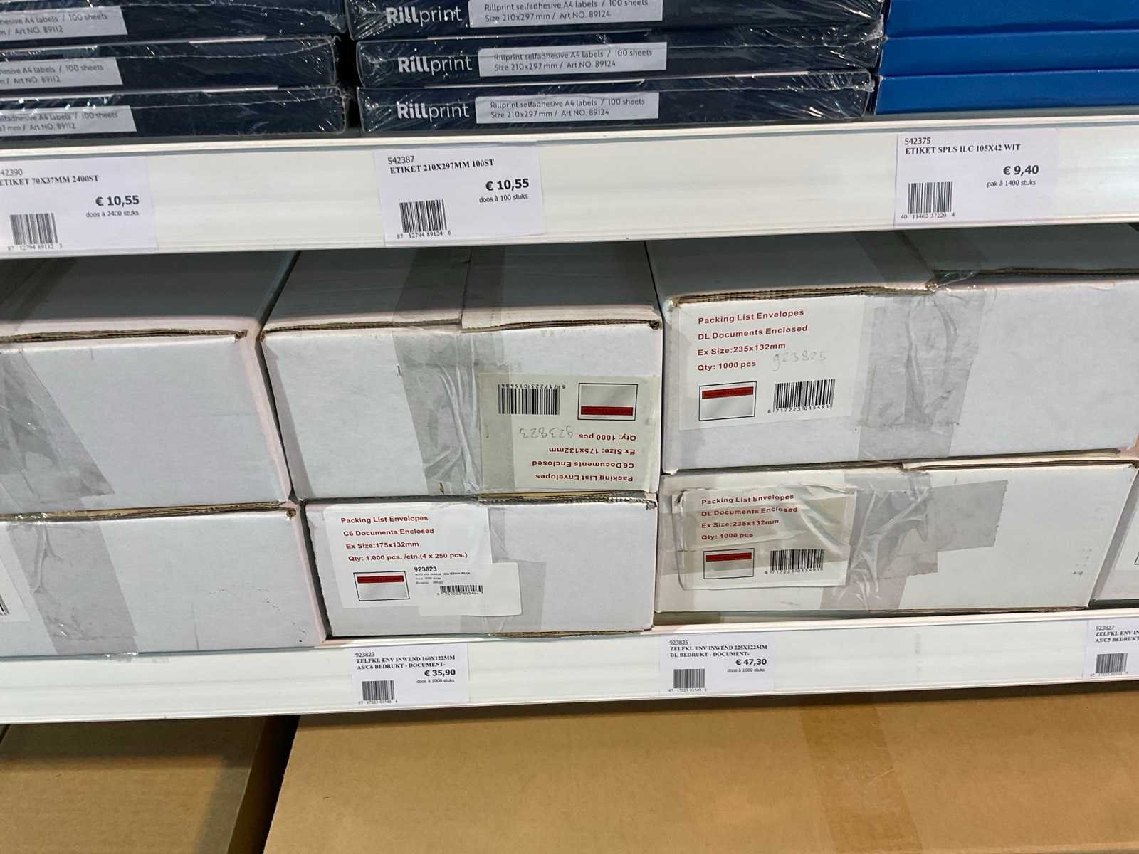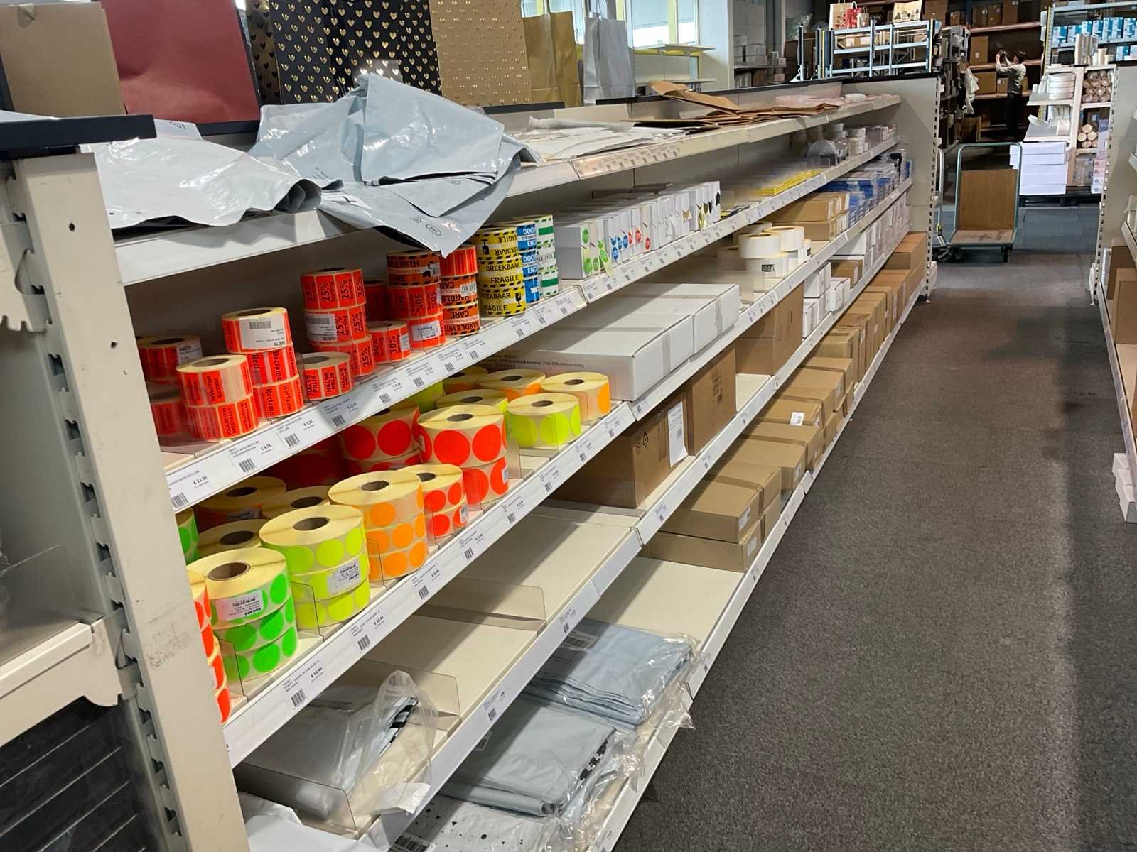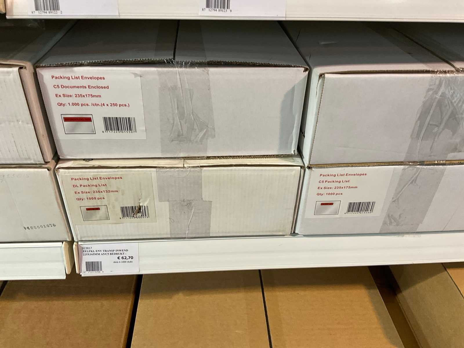 Inhoud 1 zijde van stelling, bestaande uit labels, packinglist enveloppen, papieren verzendzakken, loonzakjes, sluitetiketten,, exclusief stelling.