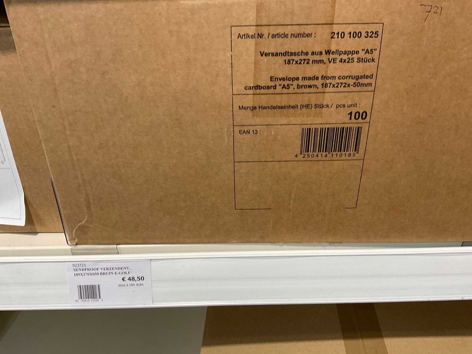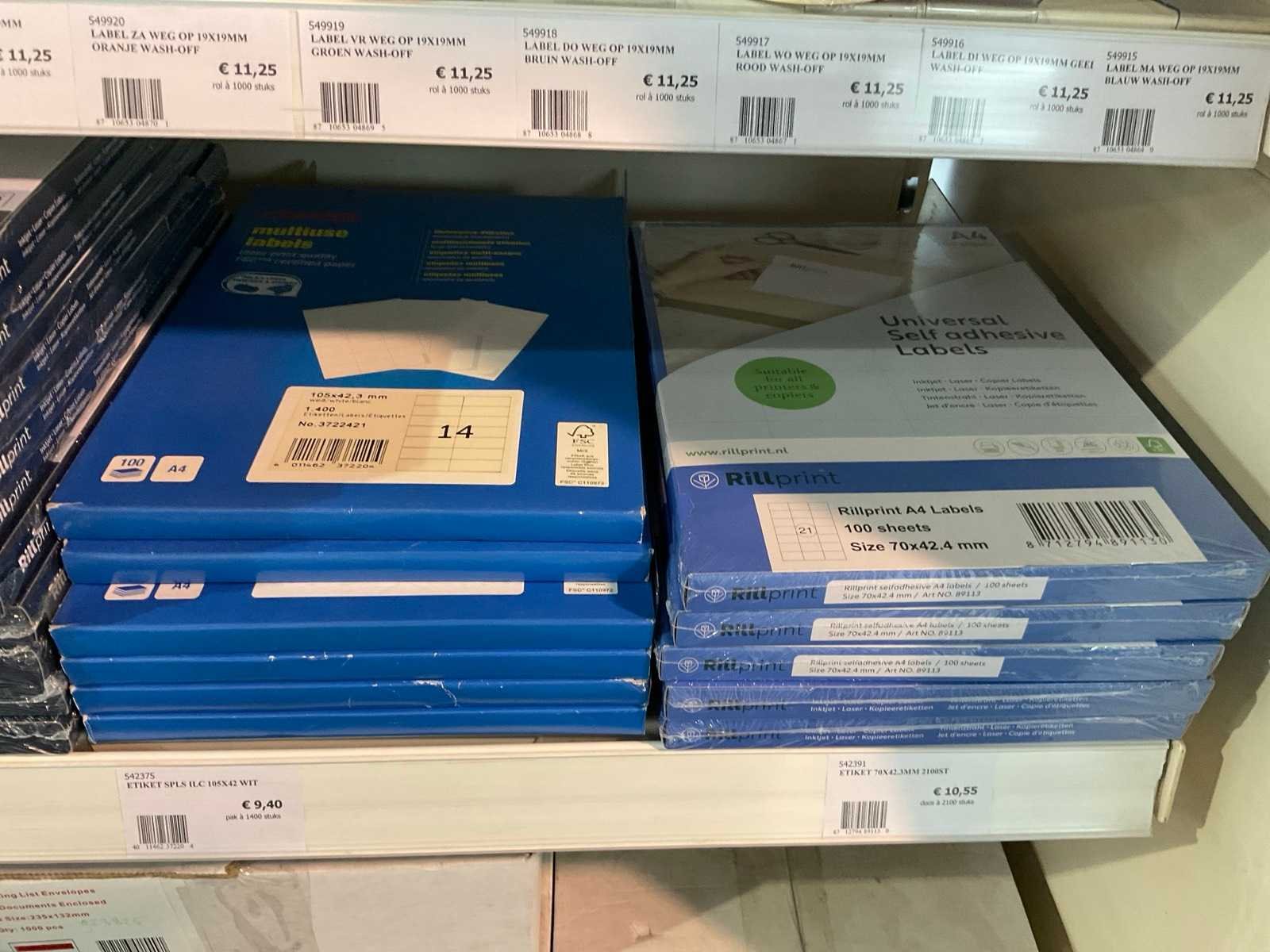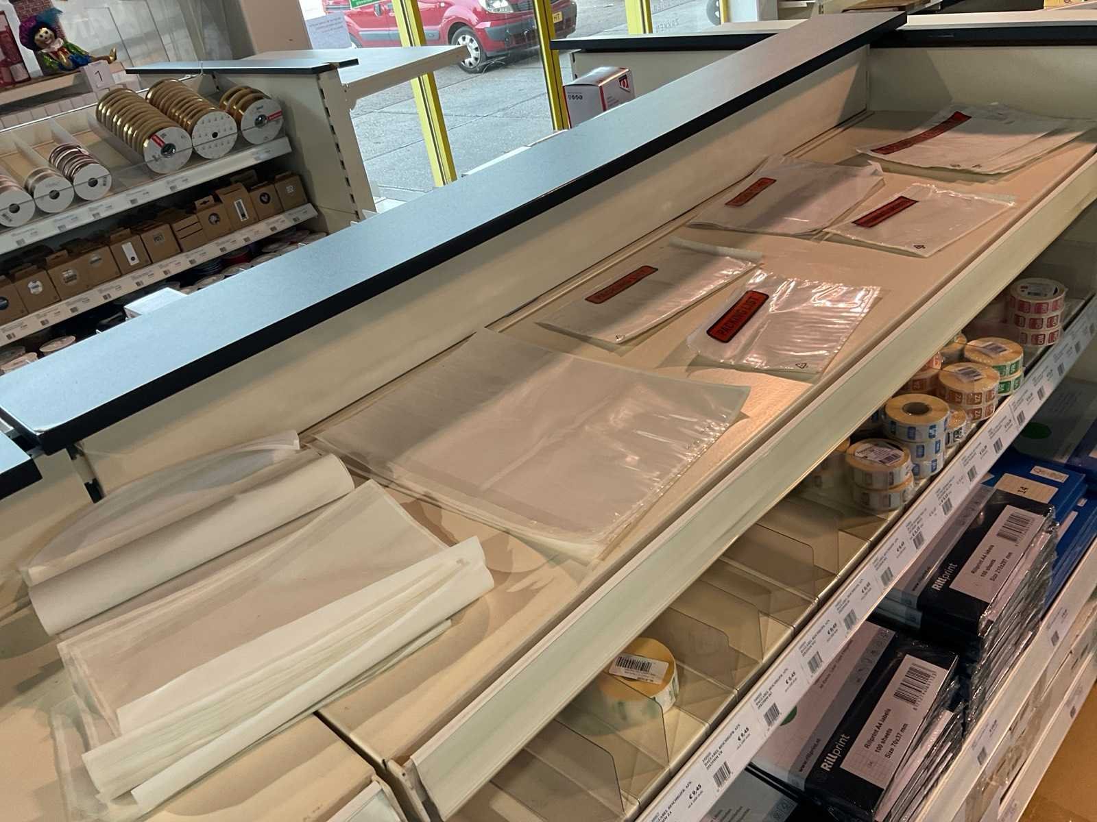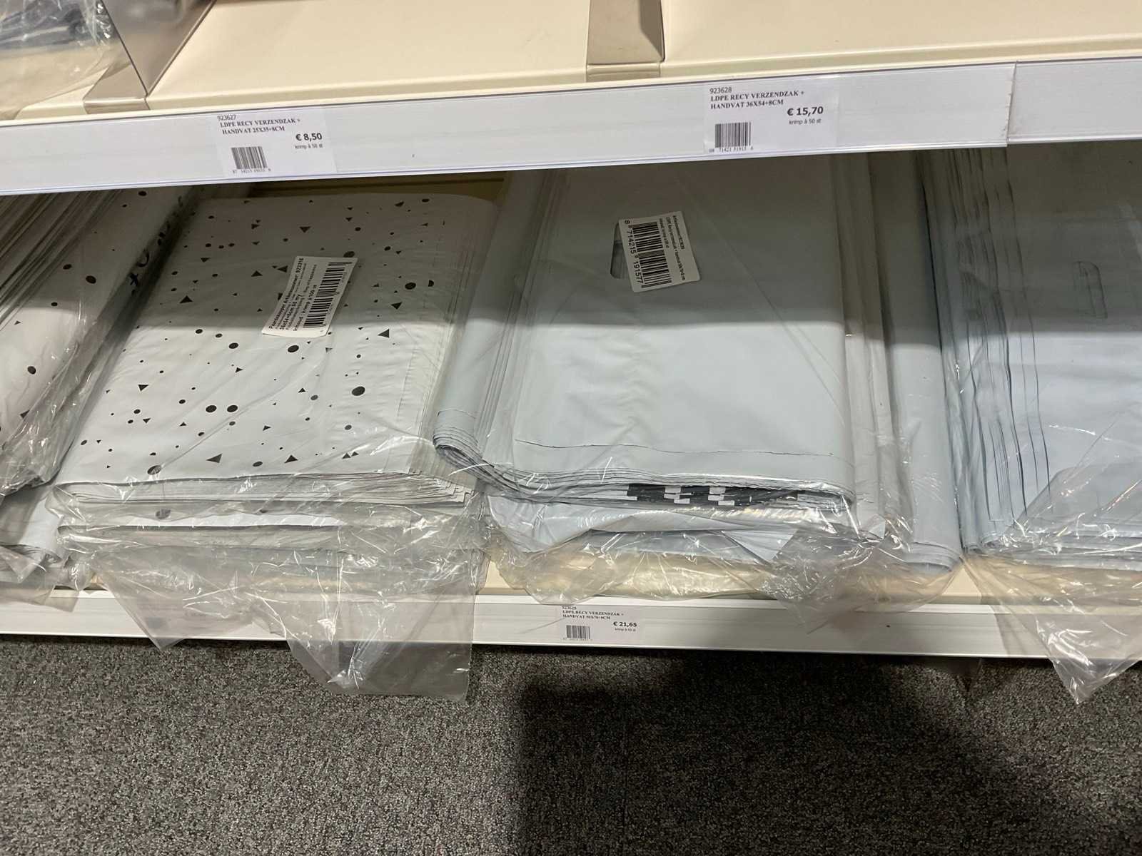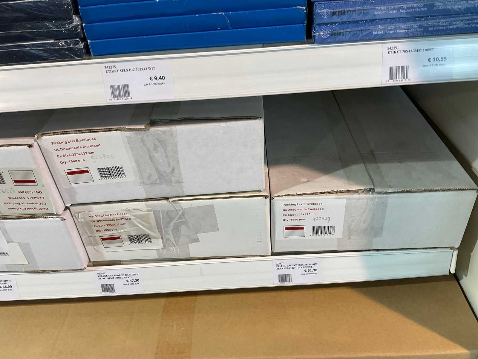 Inhoud 1 zijde van stelling, bestaande uit labels, packinglist enveloppen, papieren verzendzakken, loonzakjes, sluitetiketten,, exclusief stelling.