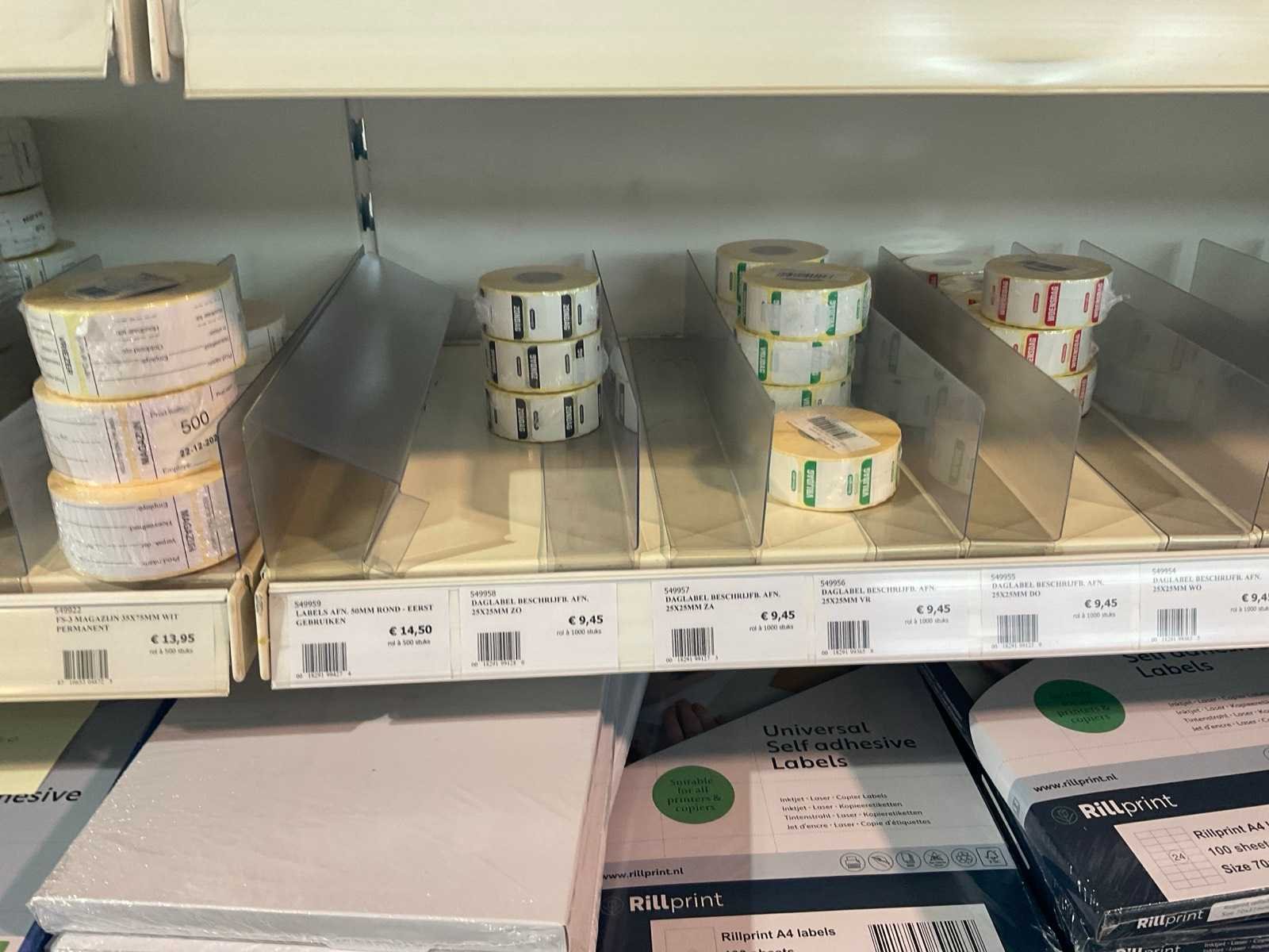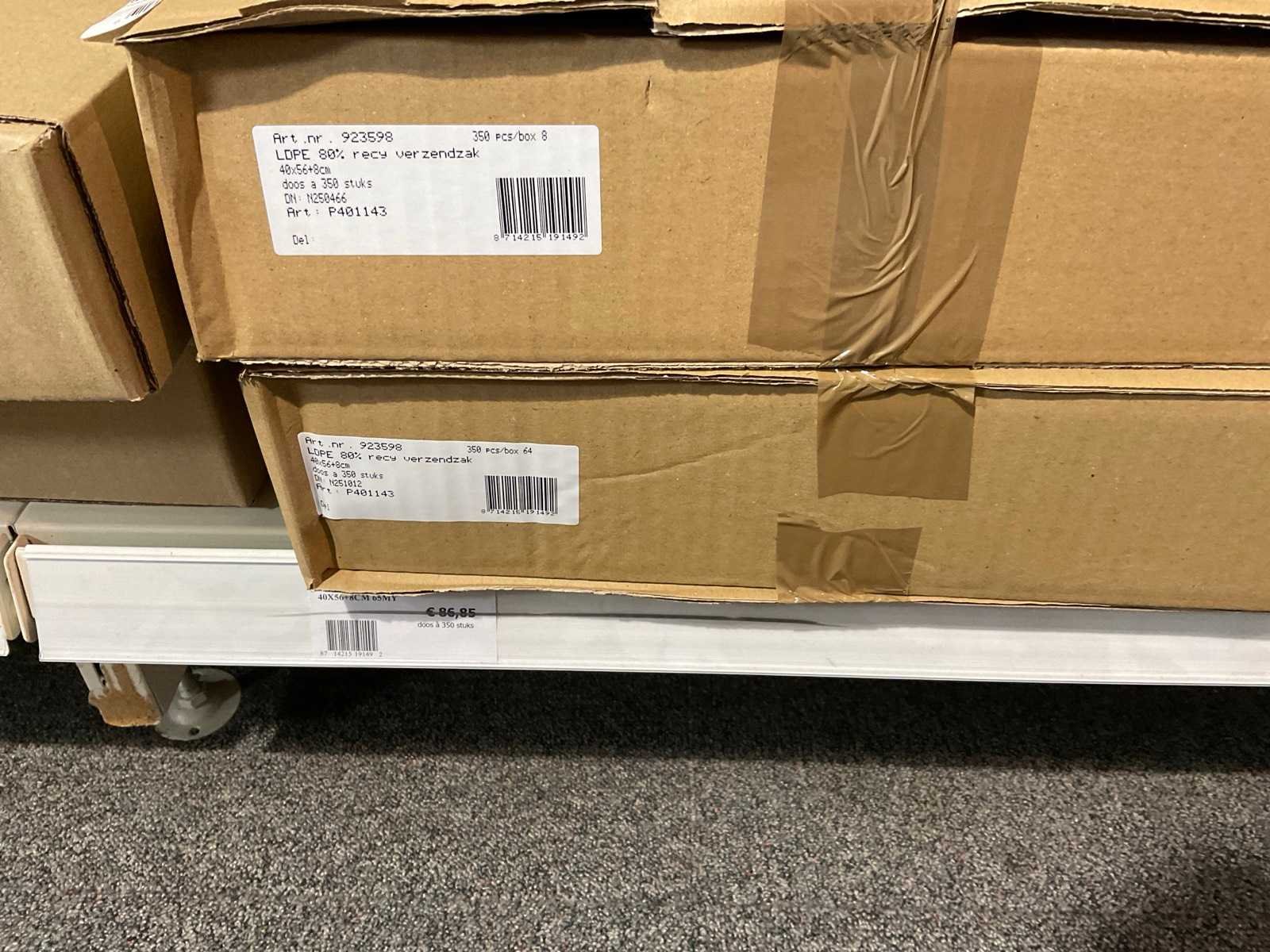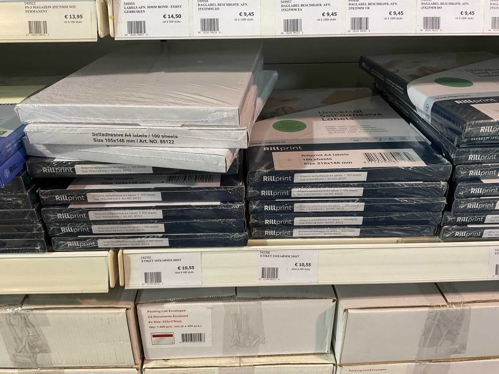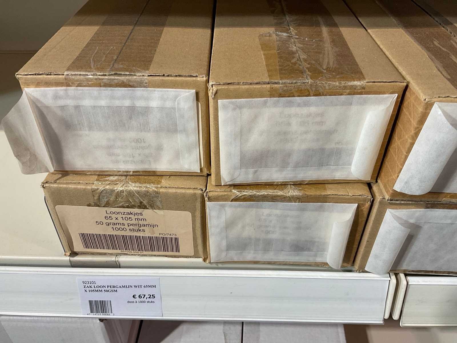 Inhoud 1 zijde van stelling, bestaande uit labels, packinglist enveloppen, papieren verzendzakken, loonzakjes, sluitetiketten,, exclusief stelling.