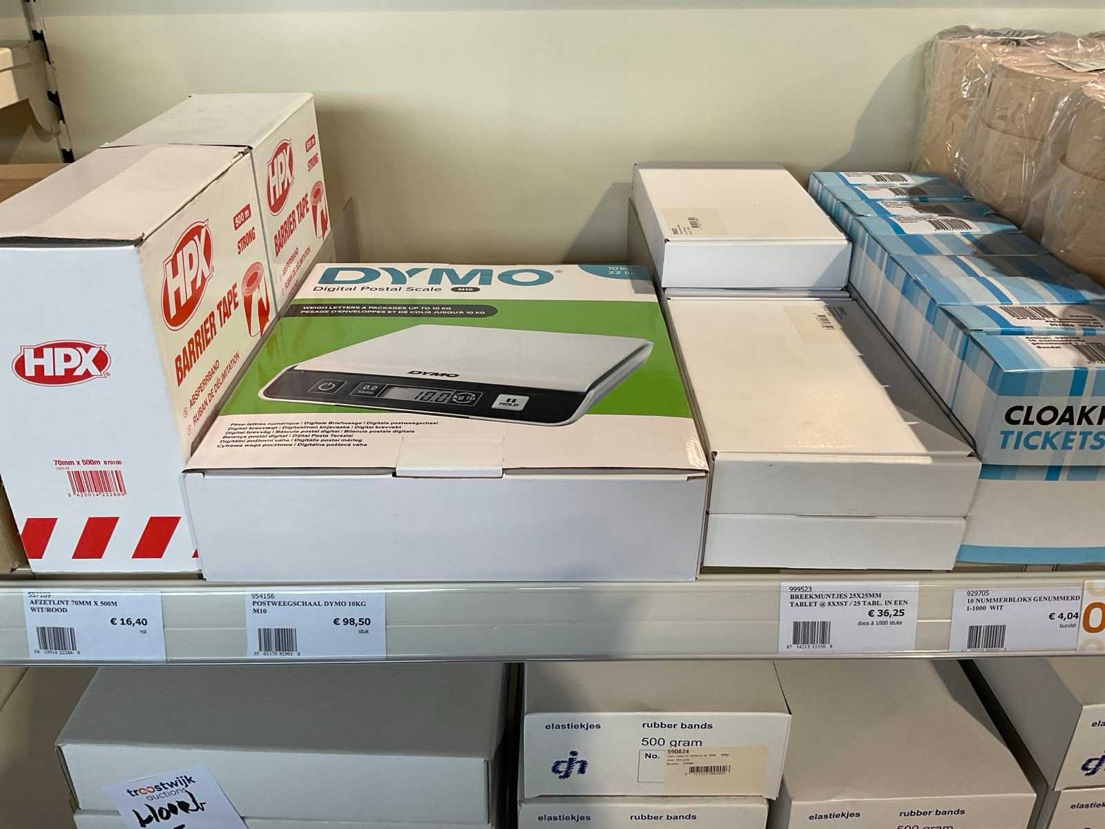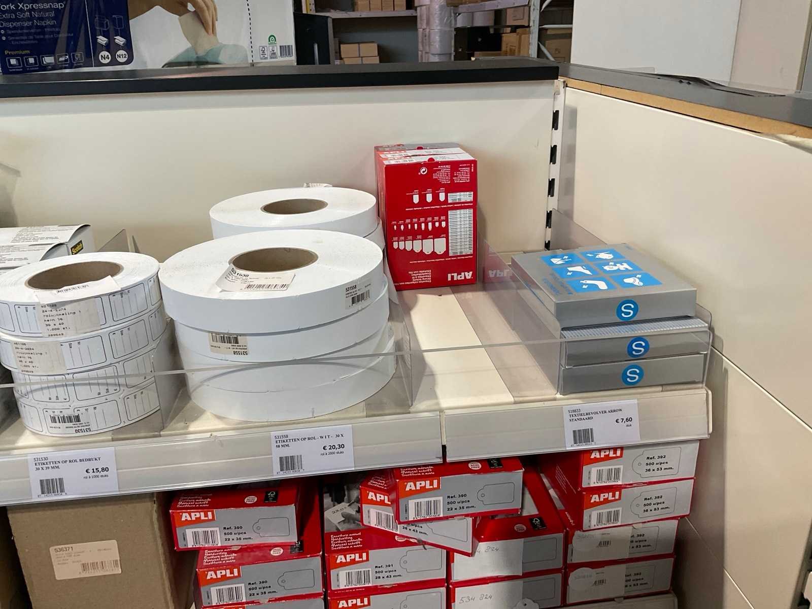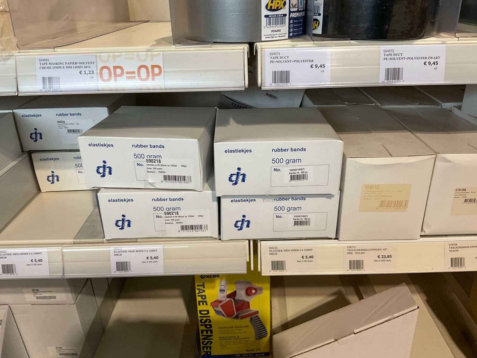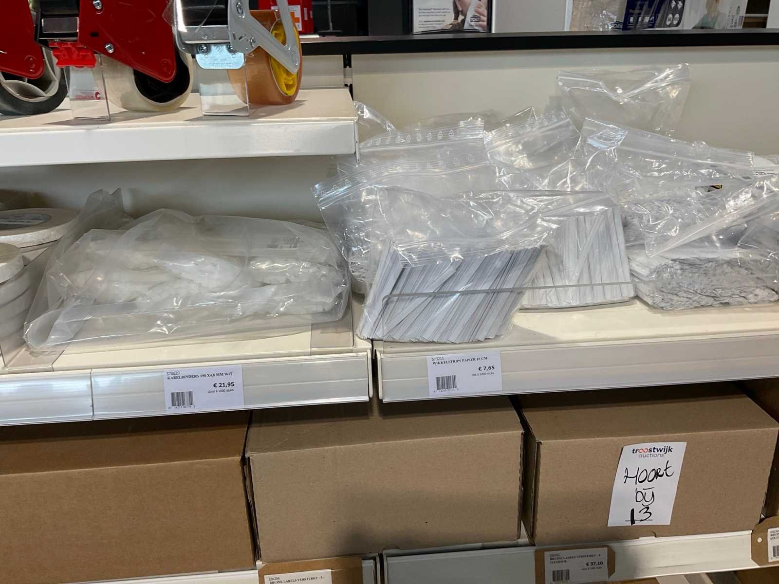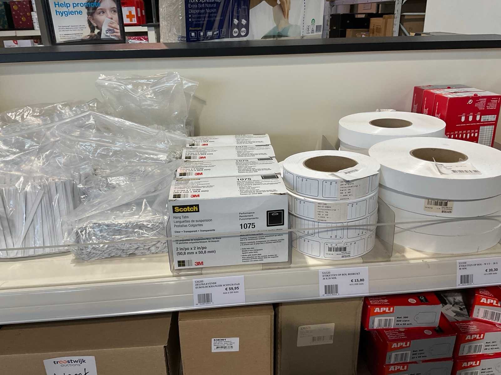 Exclusief stelling Bestaande uit: Tape, zakkensluit, clipps, tapeafrollers, etiketten, elastiekjes, wikkelstrips, hangetiketten.