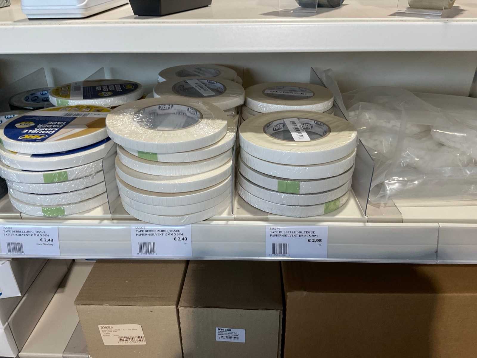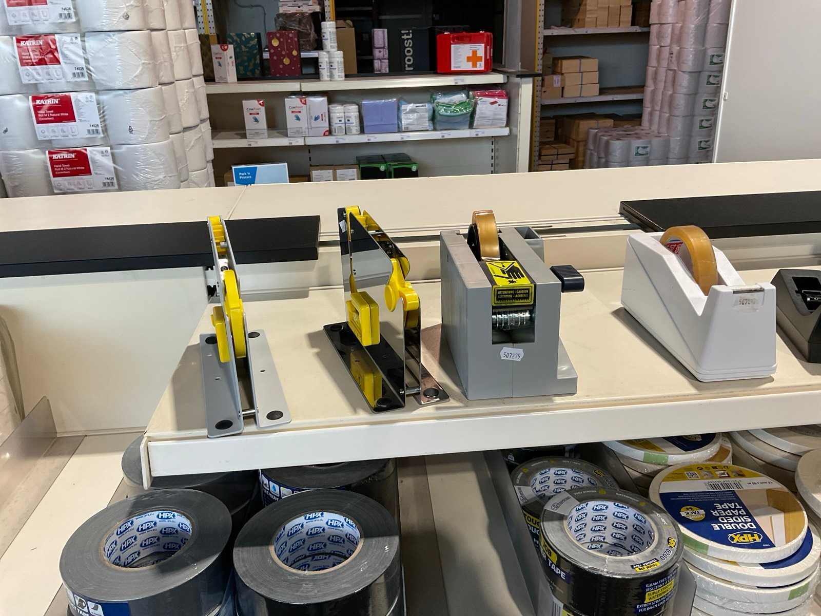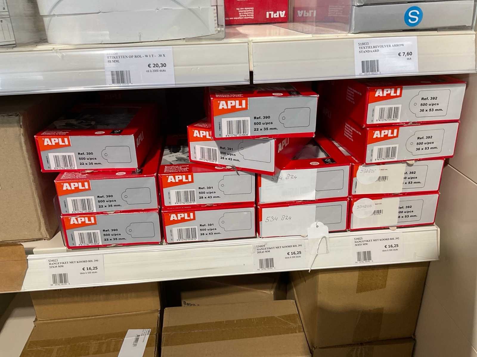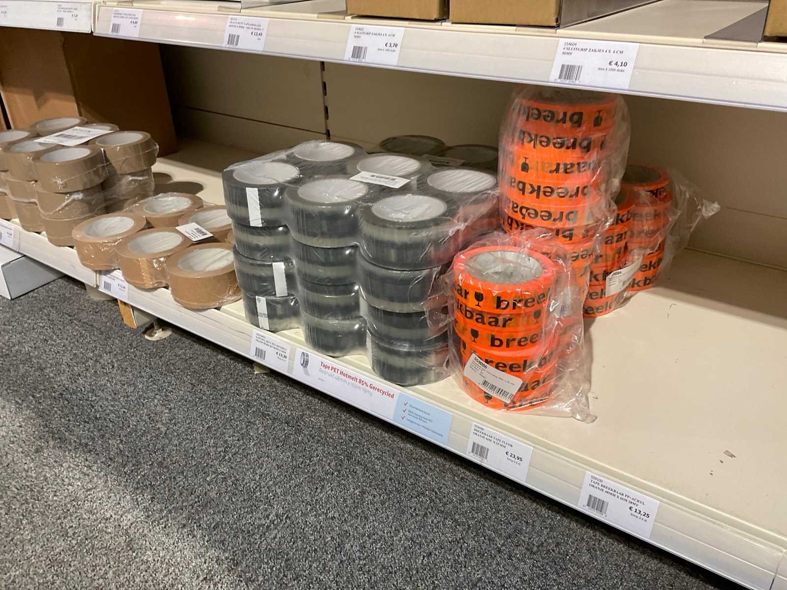 Exclusief stelling Bestaande uit: Tape, zakkensluit, clipps, tapeafrollers, etiketten, elastiekjes, wikkelstrips, hangetiketten.
